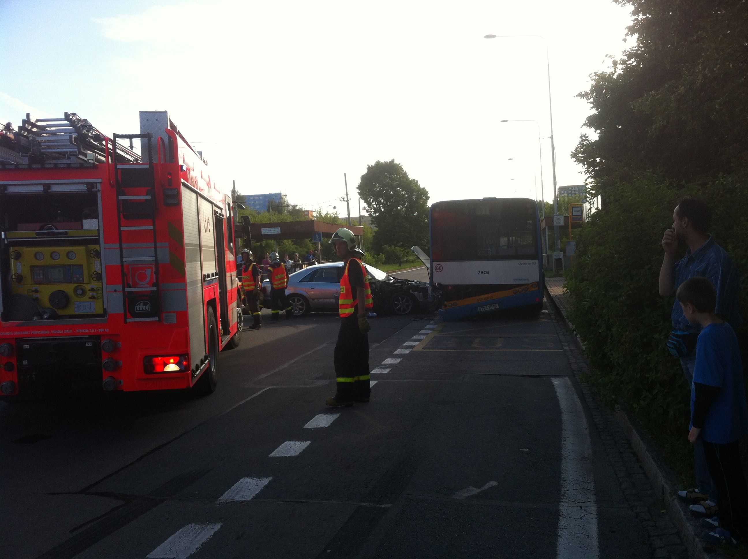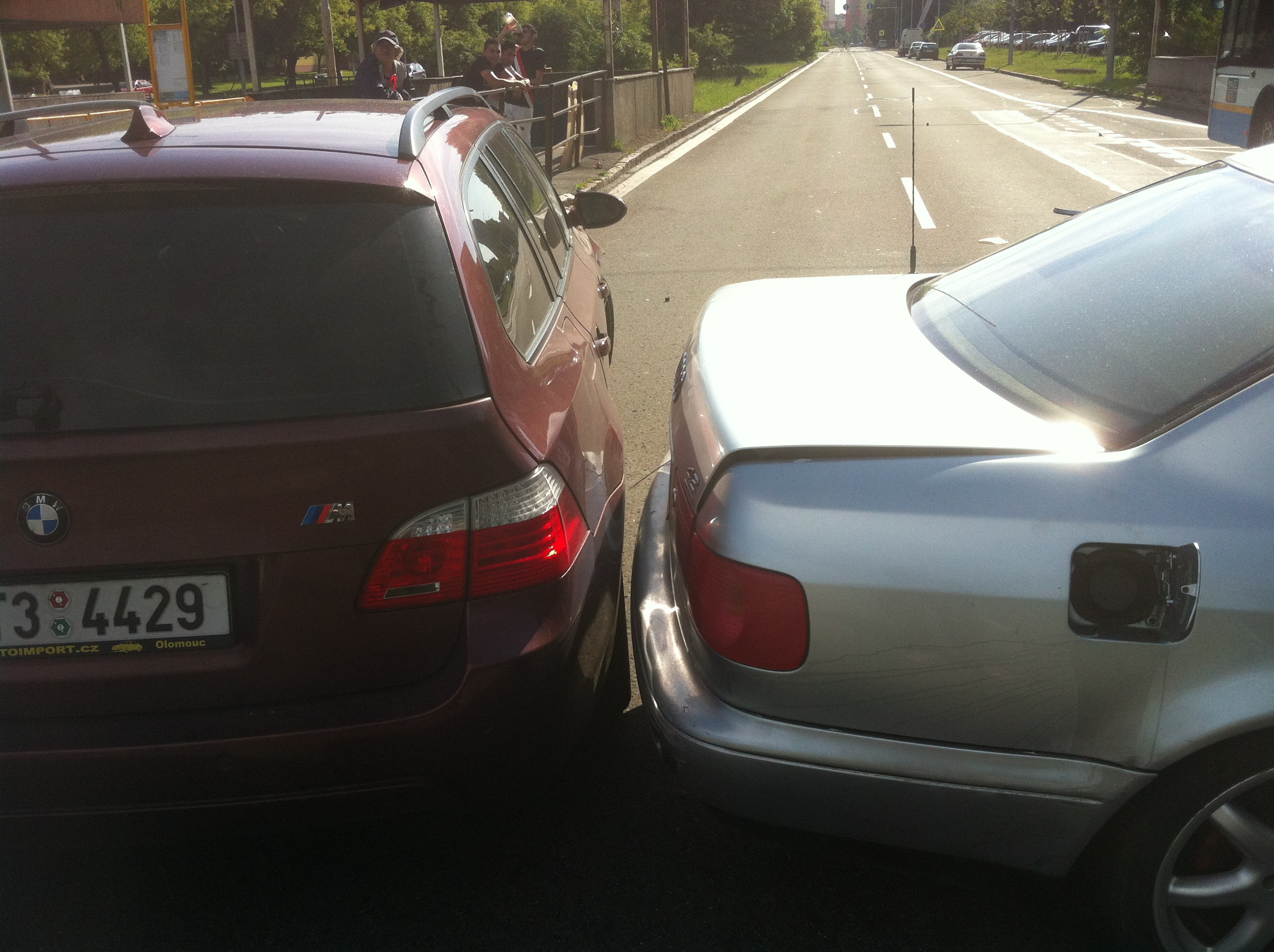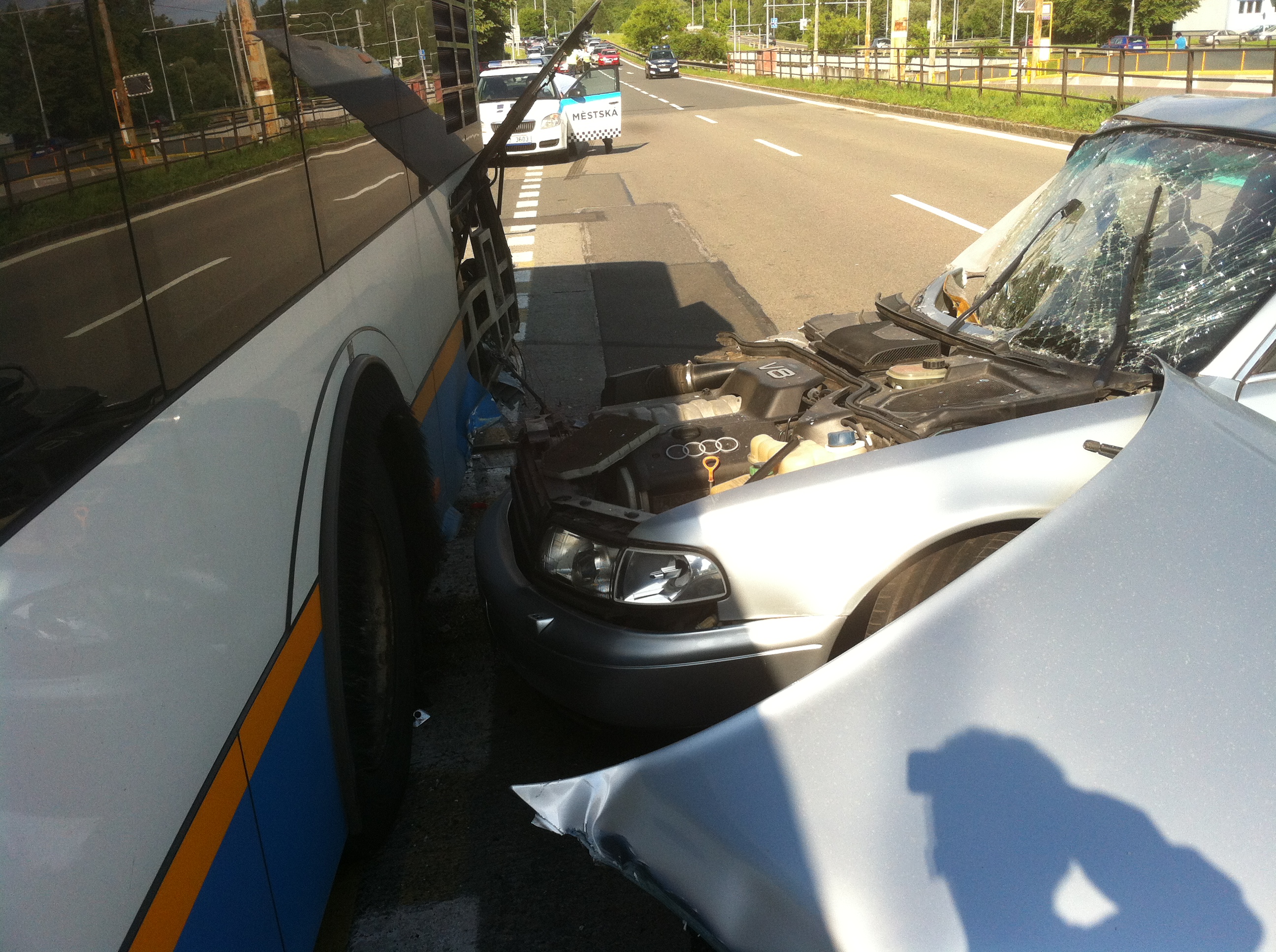 Jel jsem v levém pruhu borec se zezadu přibližoval velkou rychlosti také v levém pruhu mněl jsem v úmyslu mu uhnout do pravého ať jede vyhodím blinkr kouknu do pravého zrcátka a vydim manik se už tam cpe také do pravého tak zustavam ve svém pruhu pravděpodobně chtěl udělat myšku a vrátit se předemně ( předemnou místo v právem pruhu jelo auto asi na dvě délky ) pravděpodobně když uviděl můj blikač zazmatkoval míšku nedokončil a aby to nenapálil do auta před nim strhl auto do práva kde po intenzivním brždění auto narazilo do stojícího autobusu na levý roh audina se setrvačností začala stačet napřič přes cestu a ja sem tam už nevlezl takže jsem ho nabral pravým rohem a tak to dopadlo.