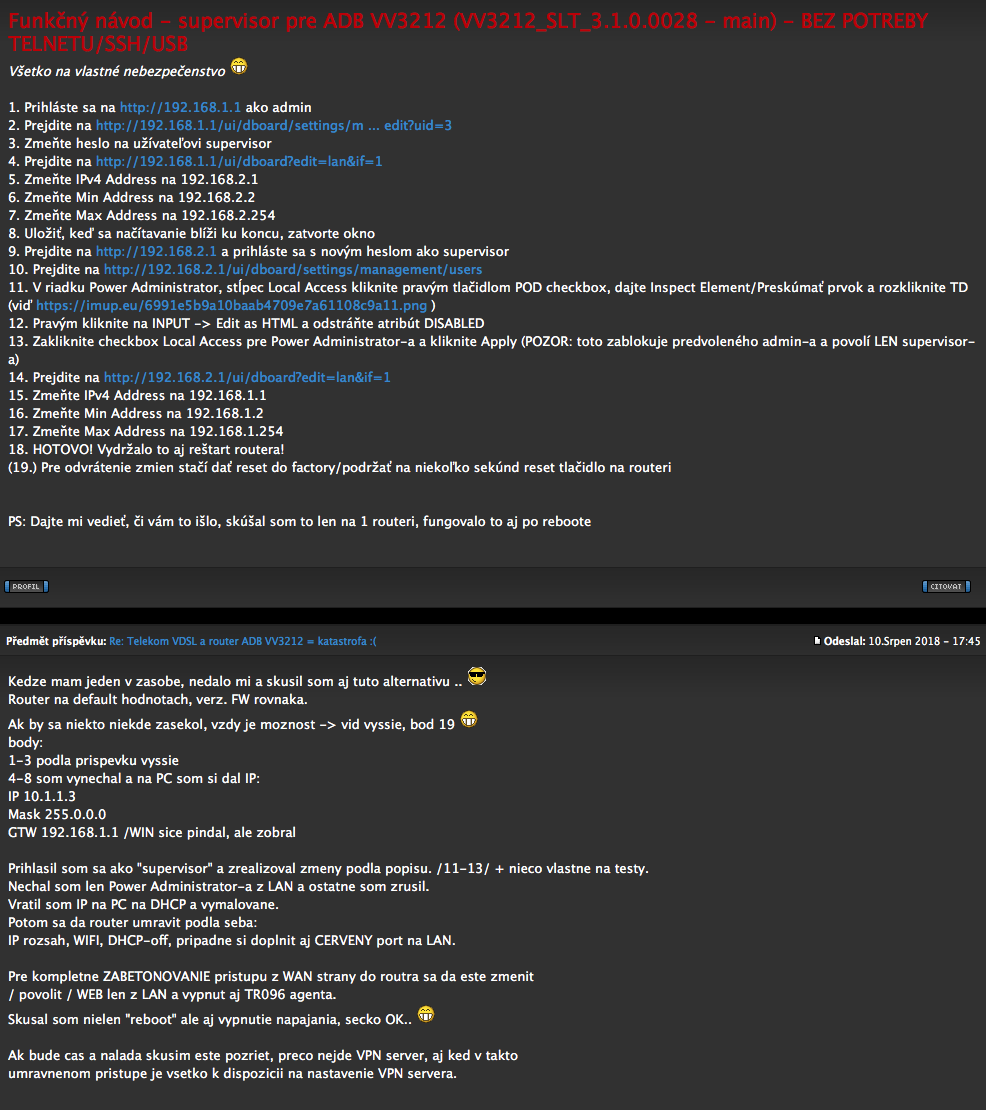 Chlapci pochopil som čo sa mi snažíte poradiť, no ja na tom zyxel sbg 3300NB00 proste neviem zbridgovat WAN interface s LAN interfacom.Cize som odrbal to ADB podľa návodu na nete:A okukal nastavenai na tom nešťastnom ADB, kde teda žiadny vami popisovany bridge nie je..... iba stara dobra default vlana do ktorej su zaradene defaultne vsecky porty aj s wifinou....Na WAN strane su nakonfigurovane dve vlany 2510 pre net ako ppp, a 2513 pre iptv ako obyč ptm (plus ešte management a voip vlany predpokladam), podtaľto spravne.Ako nakonfiť ppp 2510 je popisané všade na to seriem.Vlan 2513 je obyčajne PTM s dynamicky pridelenou IPkou z DHCPka, povoleným NATom, IGMP proxy, mtu 1500 a 802.1p tag nastaveny na 4, to isté som nakonfil aj u seba na zyxelovi.V ADB je pre túto vlanu cca 14 statických rout, skúsil som ich povypínať a IPTV bez nich nejde, teda som ich nakonfil aj na zyxelovi.Zapojil som settopbox a prd..... nendze. Ale keď ho štartnem na ADB, a potom prehodim na zyxel normálne funguje všecko ako má..... neviem zatiaľ kde je problém.čiže keby som vedel bridgnuť interfacy ako mi radite tak by to pravdepodobne frčalo lebo by som na settop box dostal tu ipku čo dostane zyxel, ktorý by mi nemusel robiť IGMP proxy a neliezol by som cez NATko........