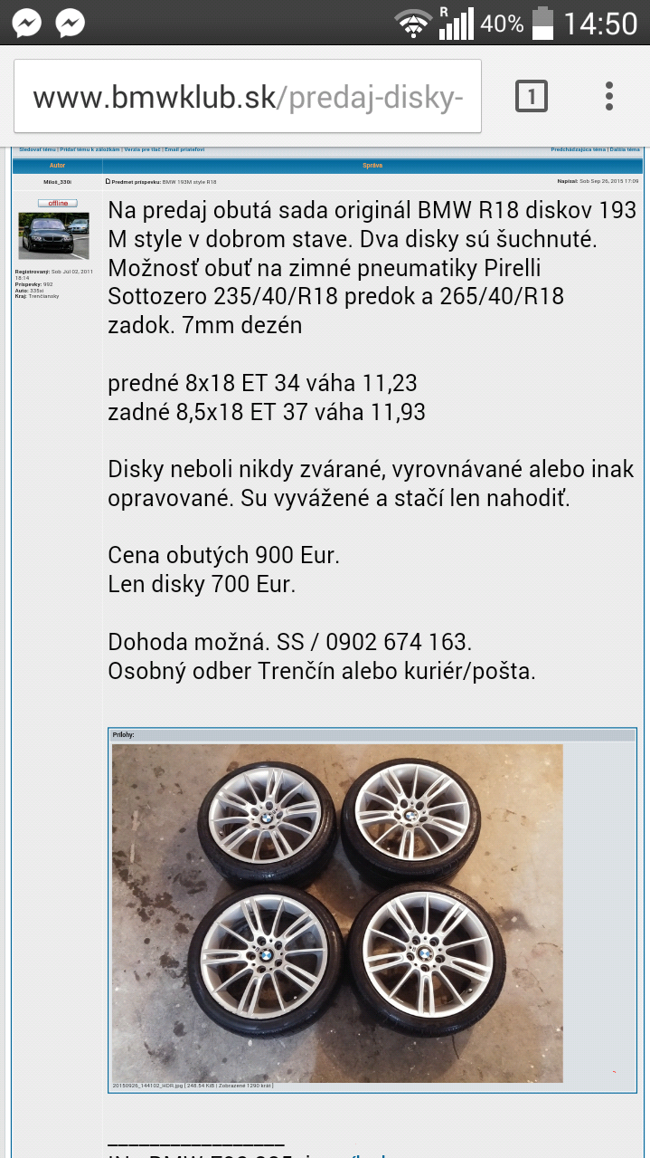 Ahoj, ja zareagujem len jednou odpovedou, nechce sa mi zbytocne dotahovat. Ze boli zvarane som si nevsimol, ja som ich mal dve sezony a nic sa neopravovalo, disky sa vzdy prevazili a jazdil som na nich bez problemov, nic nehadzalo a nebuchalo. Cena vyzutych diskov bola 700 Eur ako mas spraveny screen v mojom inzerate, ty si prisiel a hned si zacal zjednavat ( inak zjednaval si uz v spravach, v telefone atd, ze si nemozes dovolit dat 700 eur za disky a ze ich kupis za 600 a podobne veci slovenskeho charakteru, ze nieco nevidis a uz chces zlavu aspon 100 Eur ), nakoniec som ti povedal, ze ti ich dam vyzute za 670 Eur, ty si prisiel disky boli zhodene v pneuservise opakujem v pneuservise!!! takze si si ich mohol dat prevazit a pozriet ( lenze to by stalo 10 Eur a neprichadzalo to do uvahy ), disky si si sam pozeral a kontroloval, nakoniec som ti dal disky so zlavou 100 Eur! Takze za 600 a pneumatiky gratis