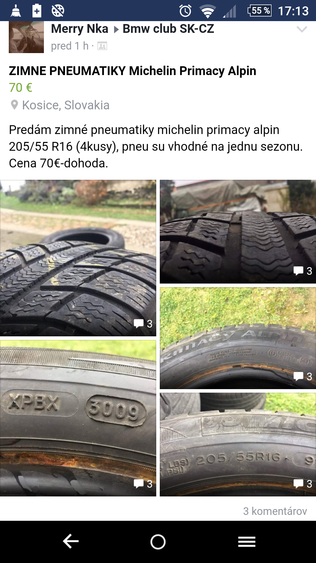 k zimakom, - predaval som gumy z mojej e39, co som cital tak niekde v US and A vraj nejaka celkom slusna znacka, nebolo to zle, ale kupil som si micheliny, tak som tie asi 6mm gumy neznameho data chcel predat za 40e, prisiel chlapik v obleku za moj asi mesacny plat, ci mu nepomozem to dat do kufra, mercedes tusim w211 (4 roky dozadu to bolo nove auto), nato mi dava 20e ze nech som rad, tak som mu poprial pekny den