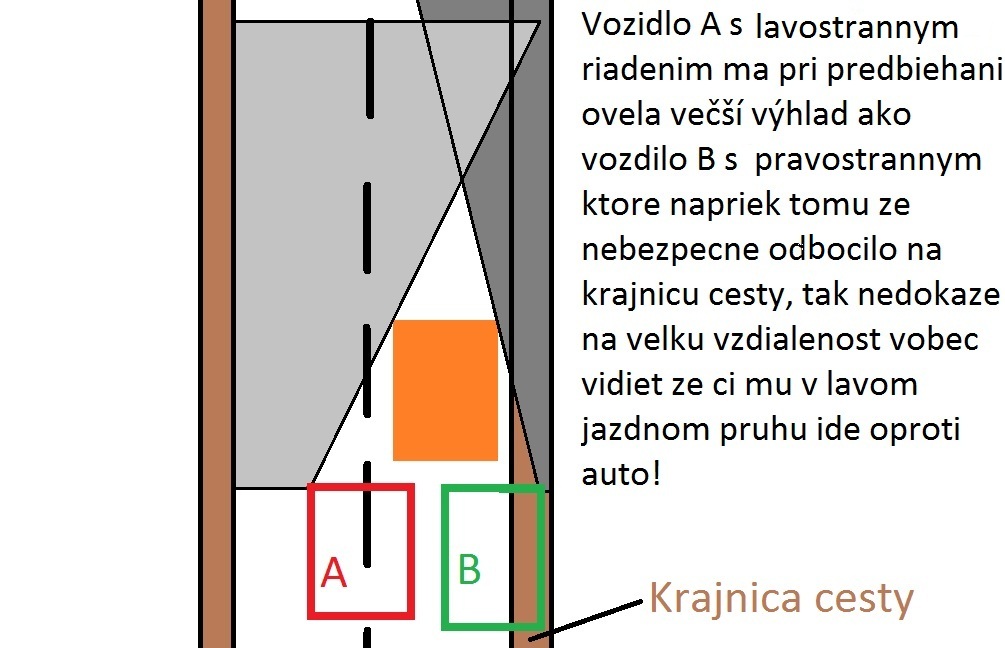 Totalna hovadina co pises. Ak si obcas sadnes na miesto spolujazdca, tak je presne rovnaky pocet situacii, ked vidis pred auto viac ako sofer. To znamena, ze do mierne pravej zakruty uvidi sofer s pravostrannym riadenim viac ako ten na lavej stran a moze obiehat (co aj tak niektori robia) len s tym rozdielom, ze on vidi, kdezto lavostranny riskuje.
