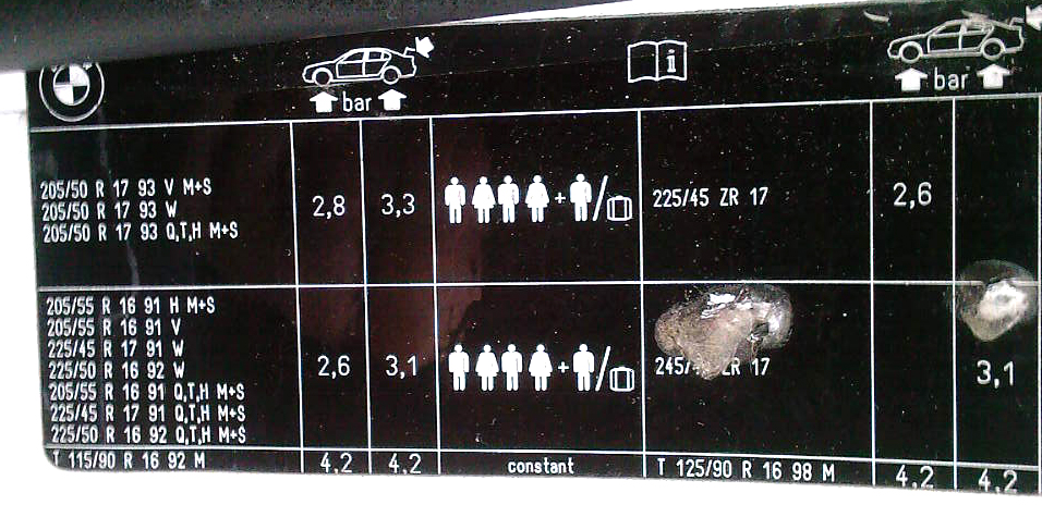 Keď som porovnal návod a nálepku na aute, tak som zistil že ohľadom tlaku v pneumatikách sa akosi rozchádzajú v názoroch... môžte prosím vás niekto s 330xd touringom 135 kW predfacelifotm pridať fotku tej nálepky? Lebo sám teraz neviem ako mám tie pneumatiky fúkať... zimné mám 17" 225/45, letné 18" 225/40 podľa auta majú mať taký istý tlak, podľa knihy zas každé iný a to že ten tlak sa nezhoduje na nálepke a v návode nikdy to už ani nespomínam