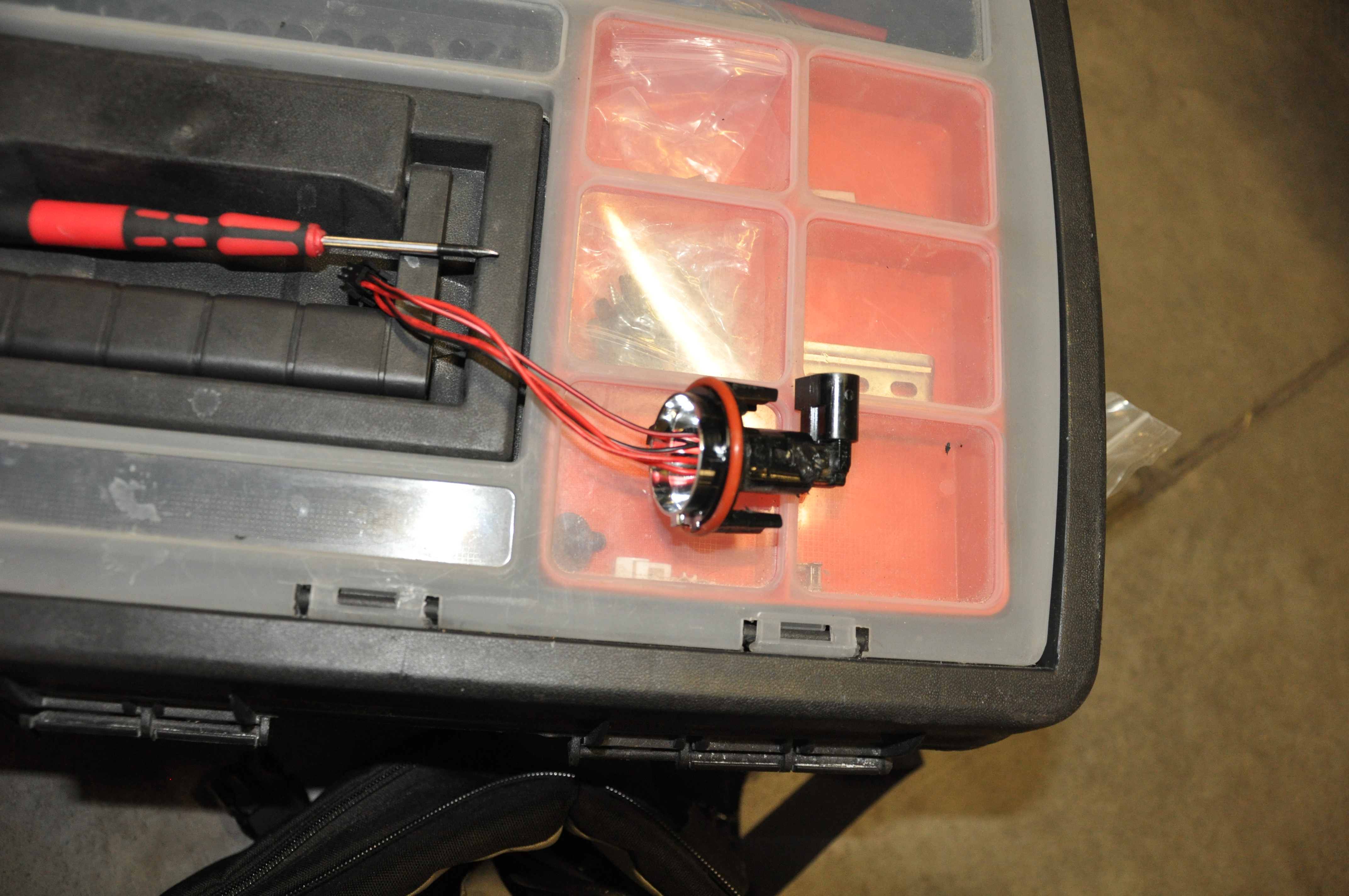 Pred finále, teda nalepením nových plexi som si ešte ja osobne posvietil na angel eyes. Po malej minútovej úprave (odštiknutí hornej spojovacej tyčky) sa nainštalovali presne na miesto pôvodných kruhov. Tu to sadlo naozaj krásne a ani ja ako známy "pedant" by som s niečím podobným problém nemal:) Hrdý som na vyriešenie napájania cez originál konektor. Teda miesto spoja nie je exponované vzdušnou vlhkosťou a svetlá sú aj pri pohľadu zozadu prísne originálne.