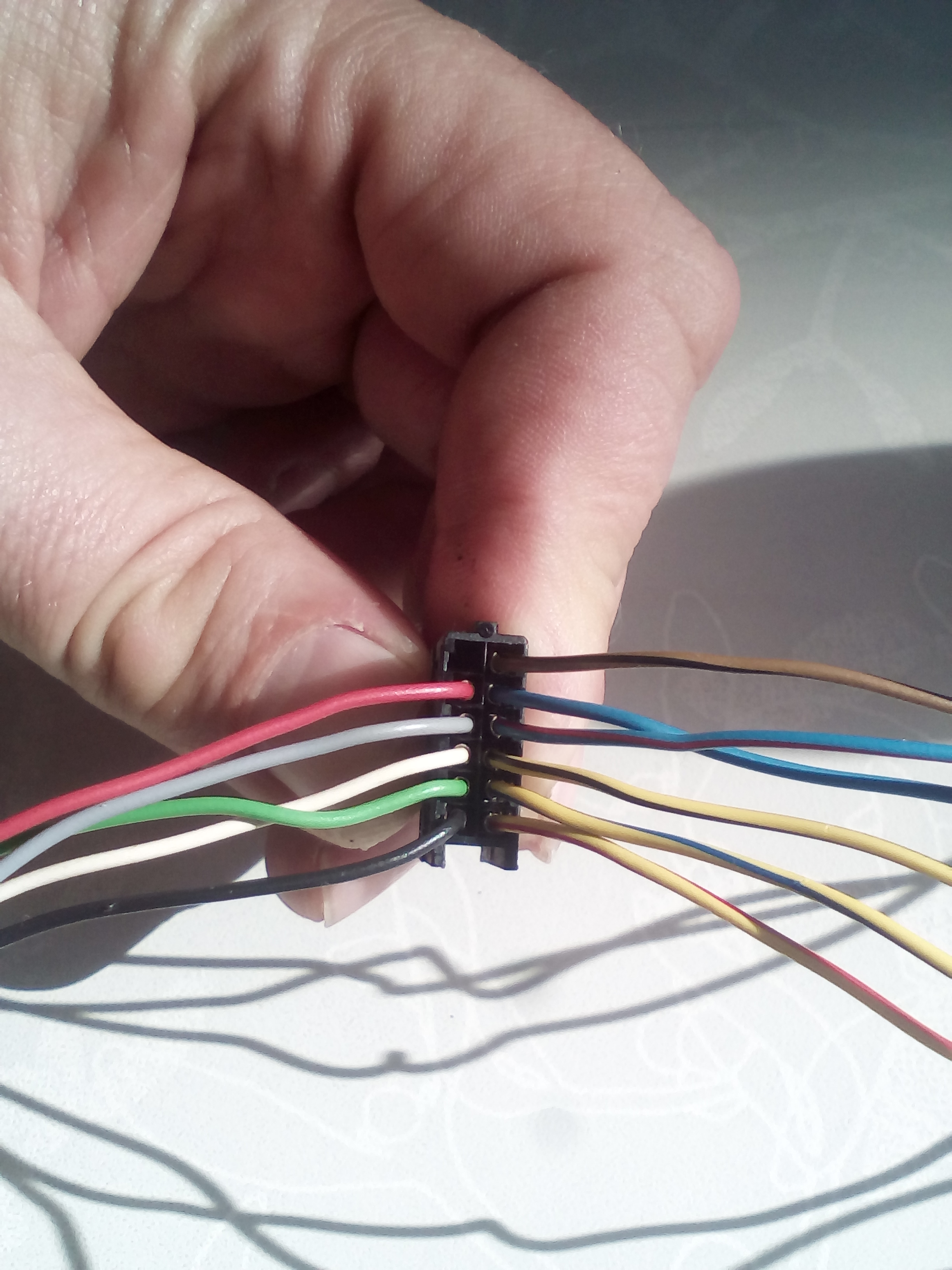 Ještě jednou zdravím, pánové. Vracím se k tématu. Elektrikář, kterého mám ve městě k dispozici, to podle zaslaného schématu neumí zapojit. Sehnal jsem si konektor do MID panelu z vraku, rozkuchal jsem to, viz obrázek. Můžete mi prosím velmi jednoduše prozradit, kam mám který drátek z nafoceného konektoru připojit do velké konektorové kostky? Doplním, že červený drátek začíná spodní řada, druhý z levé strany na výřezu zadní strany MID panelu.
