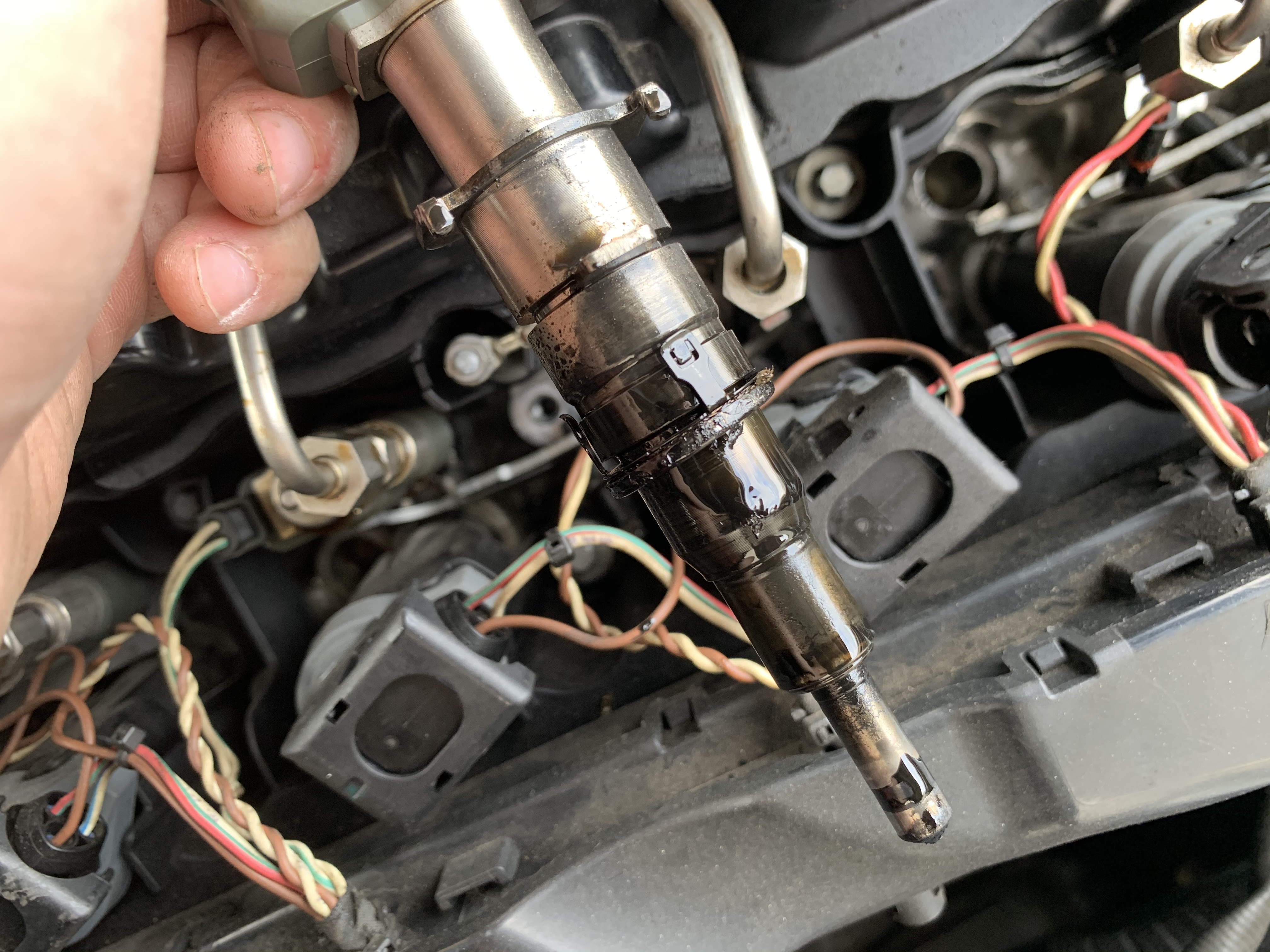 Chystal som sa, že dám vstreky na test a keď som ich povyťahoval tak zo styroch kvapkal olej a jeden bol uplne cely cierny od oleja. Na hlave stoji olej v dierach. Ked som jazdil tak mi zralo olej. Kadial sa tam moze dostat? Moze tiect cez tesnenie pod vekom? Ale jak sa dostane do spalovacieho priestoru? 🙏🏼 F10 N53