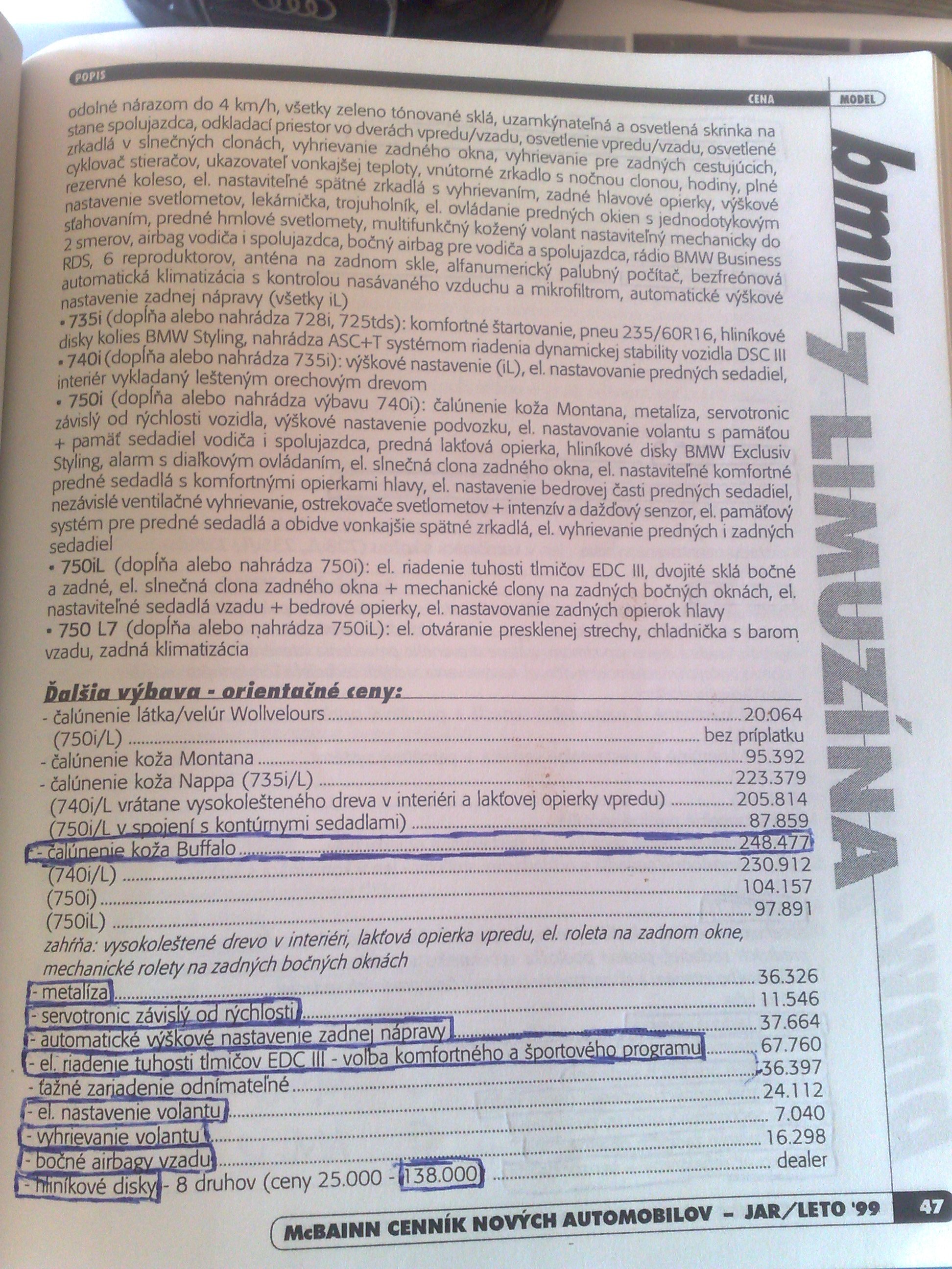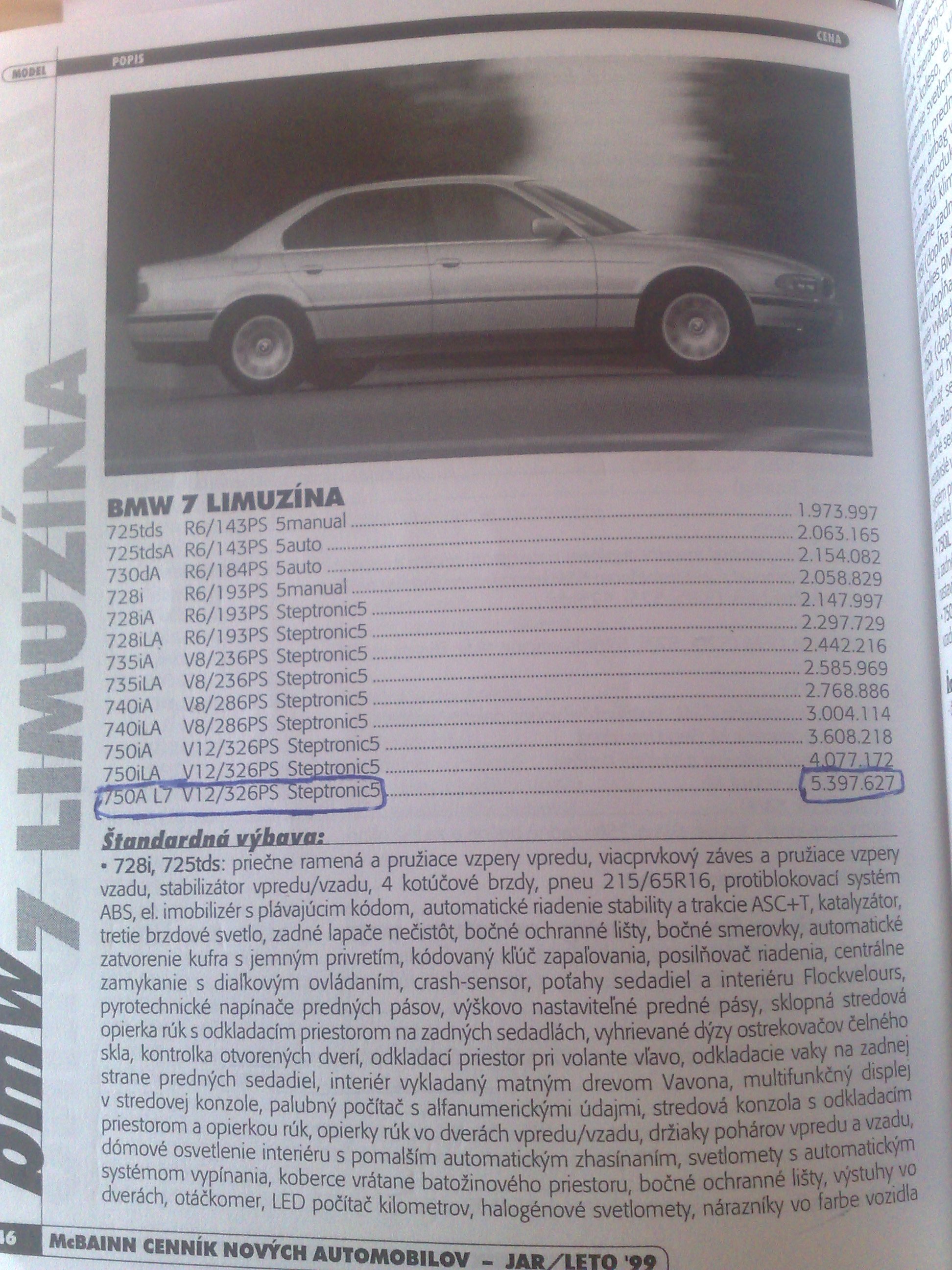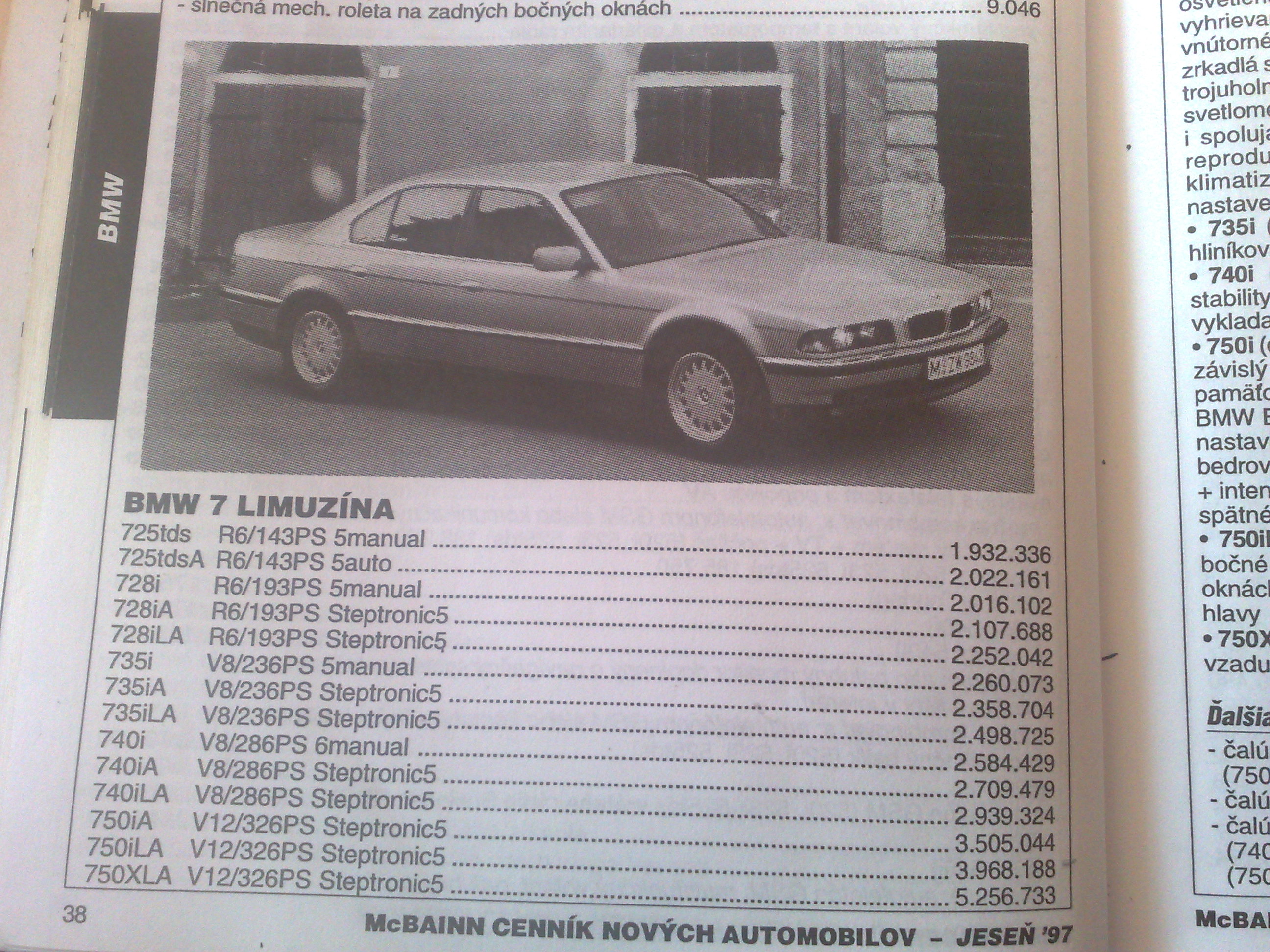 Takze tu je POFACELIFT konkretne rok 1999 ...tie ramceky si nevsimajte to som len kedysy davnejsie chcel zistit kolko by stala FULL vybava ked si vsimnete na konci tak to stupne zo zakladnej ceny 750iL ktora stala 5,4mil SK na 7,5mil SK :lol:
