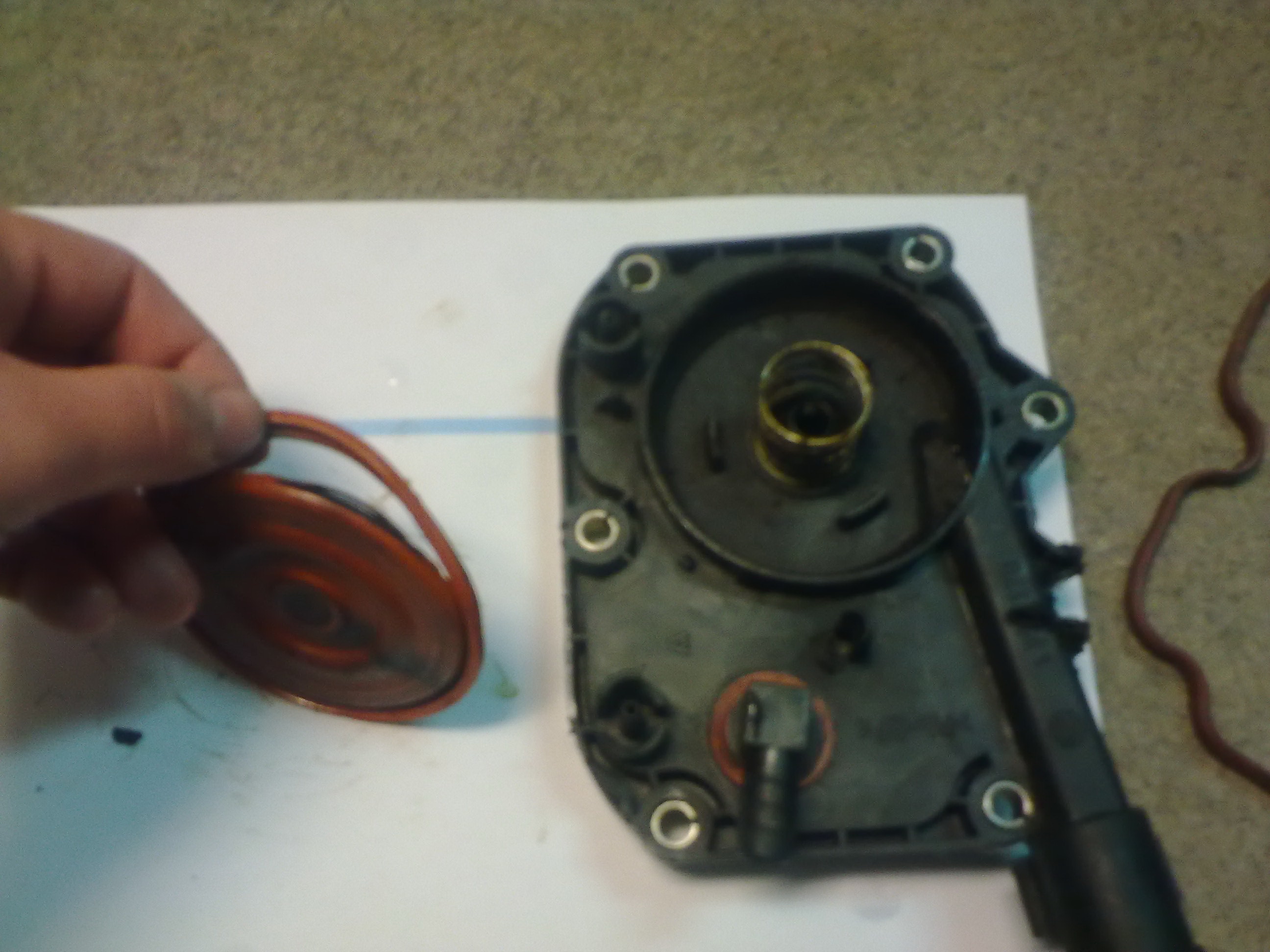 Tam treba meniť viac ako tu membranu,tesniace kružky na potrubia odvetrania,tesnenie pod veko toho plastu za sanie,ak to budeš porabať tak že daš tiež dole sanie tak hneť aj tesnenie pod sanie a aj pod šrobovanie,stredom ide kovové úzke potrubie do separatora oleja,aj ten sa má meniť.Lenže ak budeš meniť aj ten separator tak treba aj tesnenie pod skrtiacu klapku,a pod veko pŕs.