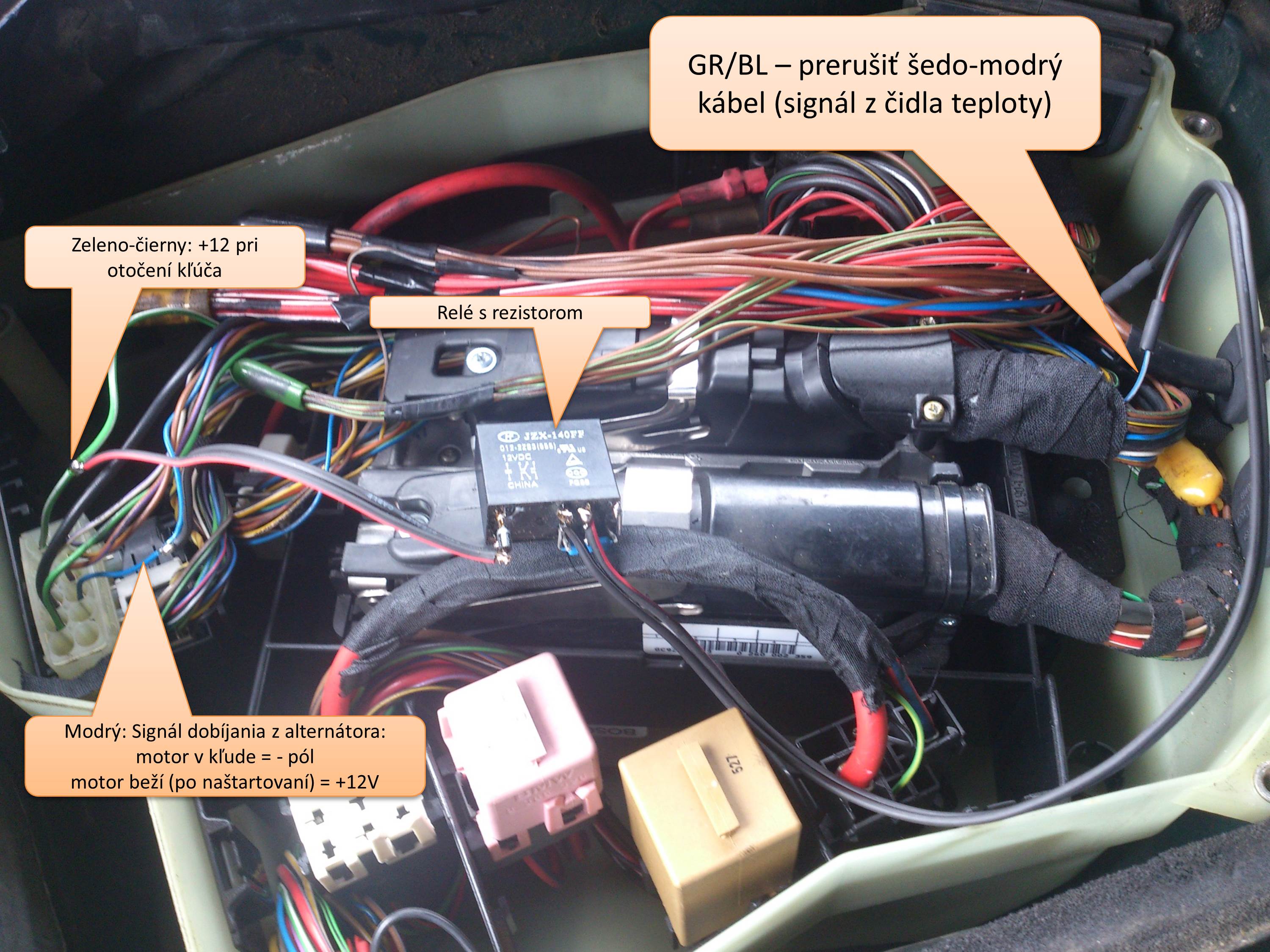 No ako teda tento primitívny systém funguje? Pri otočení kľúča do 2. polohy sa zopne relé a zaradí do obvodu rezistor a teda RJ vyhodnotí aj pri plne zohriatom motore telotu cca asi 40°C a začne žhaviť. Po naštartovaní sa relé vypne a všetko sa vráti do pôvodného stavu. Jednoduché, účinné a odskúšané!