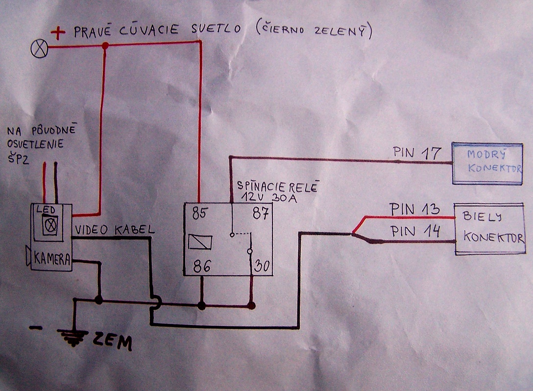 našťastie v aute je kompletná výbava, ktorú potrebujem k zapojeniu kamery, stačilo mi dokúpiť spínacie relé s päticou za asi 3 € :-)