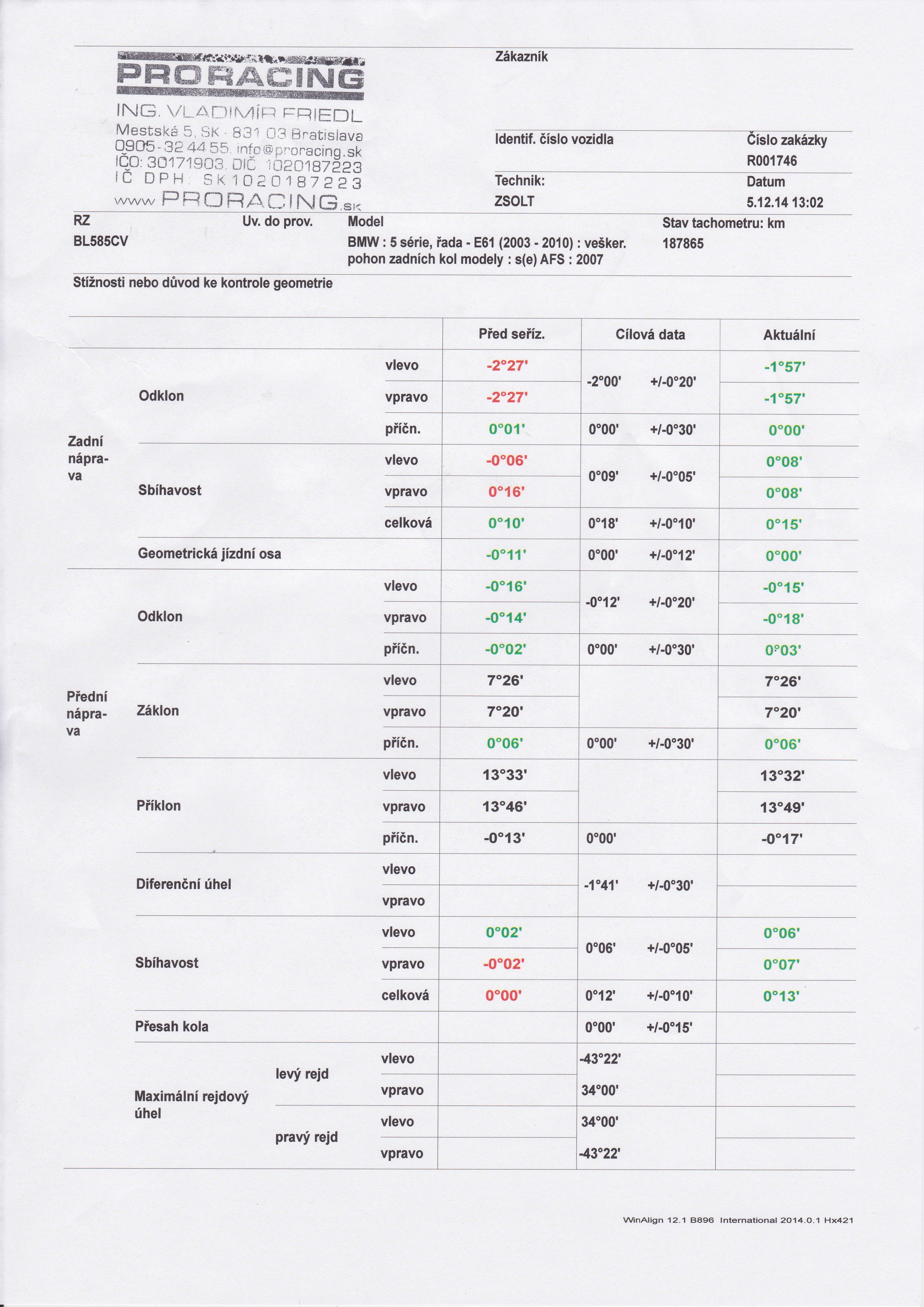 V piatok som absolvoval Geometriu ako inac v PRORACINGu. Spokojnost ako vzdy. Predne odklony ani netrebalo chytat tie boli ako vino co sviedci aj o stave tlmicov a ulozeni takze sa dorobili ostatne veci a hotovson. Zajtra sa konece pomenia tie hadicky brzdove a bude pokoj.