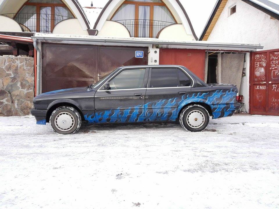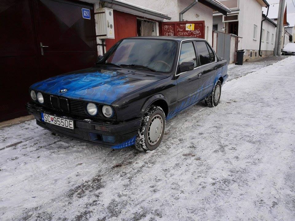 Tak som začal hľadať, páčilo sa mi ich zopár ale stále som sa nevedel rozhodnúť až pokiaľ som nenarazil na túto e30, stretával som ju často v devínskej novej vsi a v dúbravke, (vtedy ešte bez "nádherných plameňov") bola vysoká a zadné svetlá boli nie na môj štýl ale s chalanom čo ju vtedy mal sme sa aj s Dendom mali možnosť porozprávať a on sa o auto naozaj staral. Každý plastík je na aute, kompletná nepolámaná predná maska, pravdepodobne nebolo búrané, je pekné/rovné, interiér je ok,, trošku deravá zadná lavica a vodičové sedadlo z felície :lol: ale keď sa človek na auto pozrie a odmyslí si tú ohavnosť modrú, je proste pekná. Hrdzavá tiež nie je moc a má šíber.. :D to proste musí byť.