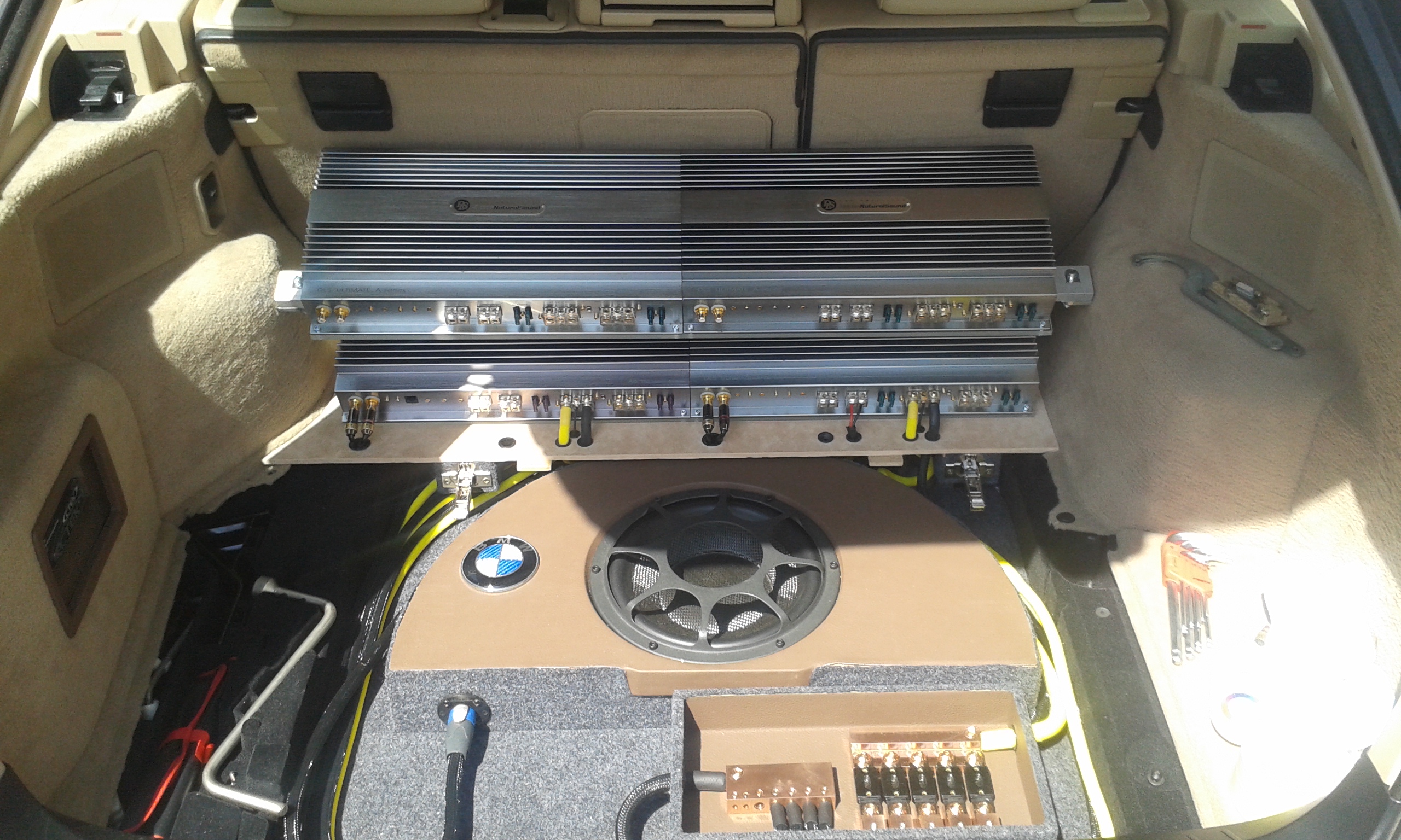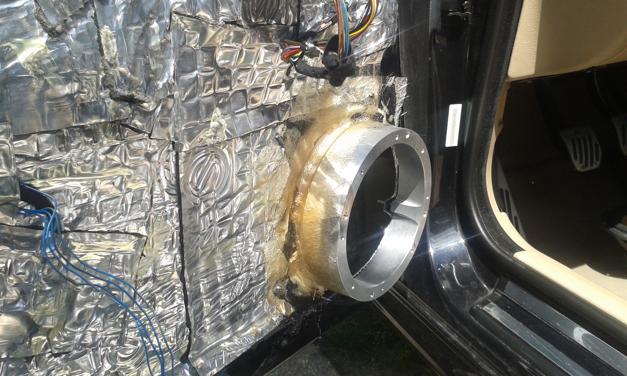 na dedušovi som zase trošku pokročil s hudbou. Zosilovače osadené, rozvodný blok na napájanie dokončený, začal som osádzať hliníkové krúžky na predné repro do dverí.