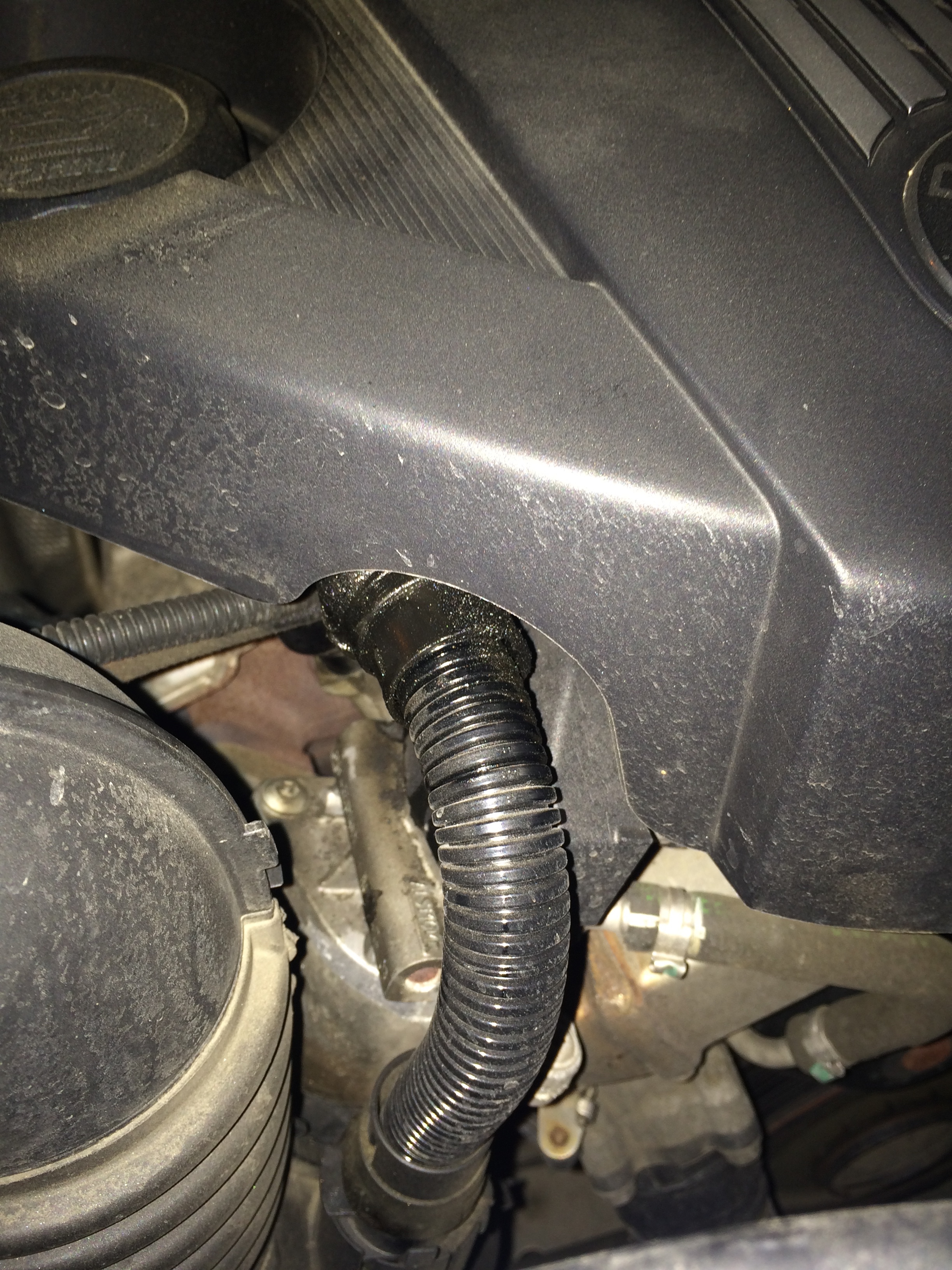 2. fotka - mal som to iste. Je to odvetranie. Je tam take nestastne gumove tesnenie, ktore sa teplom rozpadava a caka to kade tade. Treba vymenit celu hadicku. Kupoval som v BMW origo....cca 25 EUR. Ta nova je uz lepsia a gumove testnenie tam uz nie je, teda uz vydrzi.