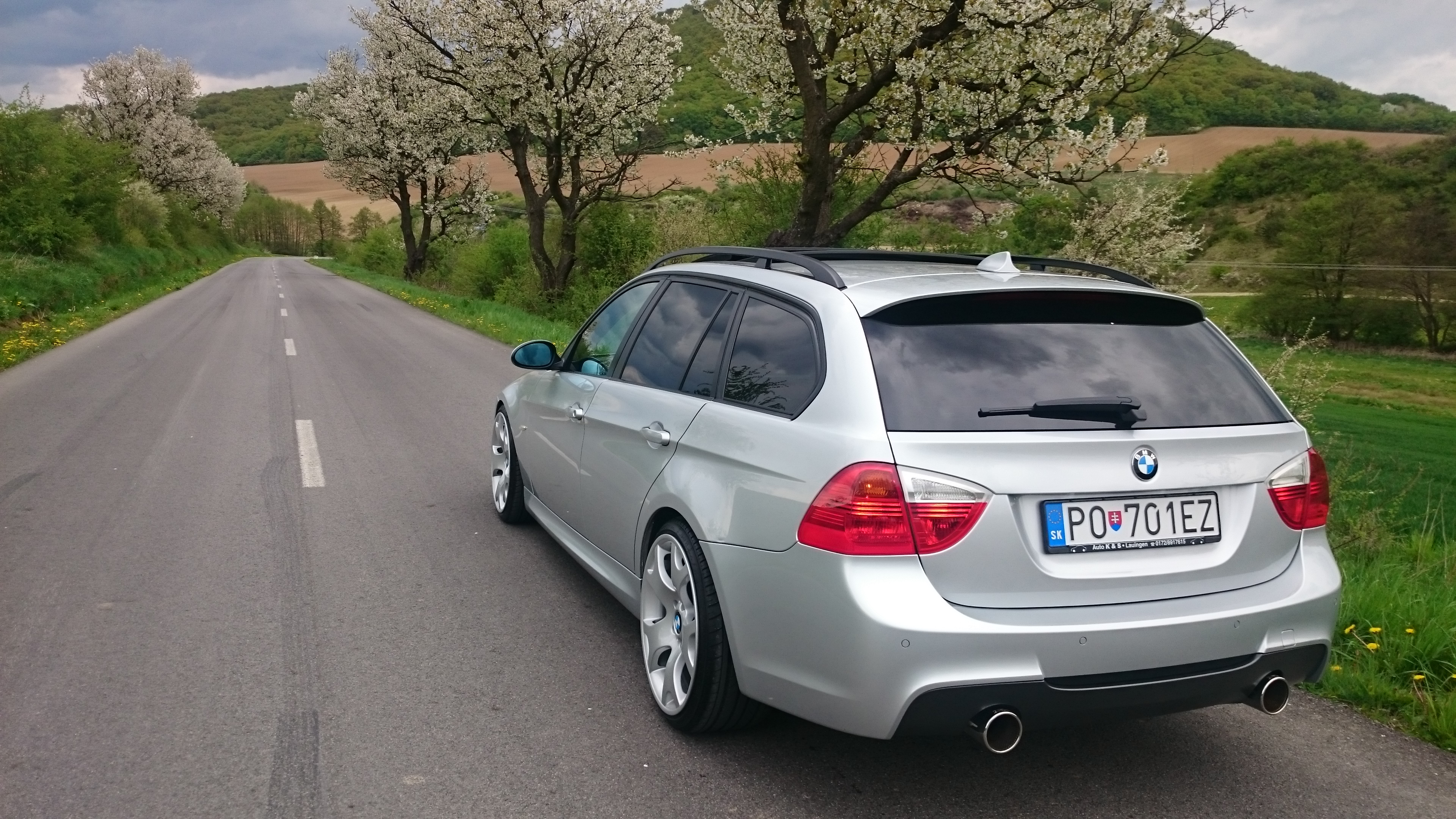 Takže len tak v skratke: jedná sa o Bmw e91 320d 120kw r.v.2007. Čo sa týka výbavy tak ma m-paket, panorámu, polokožené sedadla s dofukom bočníc, vyhrev sedadiel, profesional rádio a všeliaké inšie prkotiny ako tieto auta obsahujú. Auto bolo pôvodne s m-kovým podvozkom na 17" elektronoch. Vizeralo fajn ale nejako mi to moc nerezalo a časom aj tak trošku omrzelo, tak som to zamenil za BMW styling e63, kola 9" široké vpredu a 10" vzadu, čo sa týka pneumatík tak klasika 225/35/19 a 255/30/19. Kedže auto na týchto kolesách a m-kovom podvozku vôbec nevizeralo dobre tak som poriešil KW štelovak aby som auto dostal nižšie. Do budúcna uvidím stále ma niečo napadne ale zase sa snažím držať hesla čím menej tým viac :) pre BMW :)