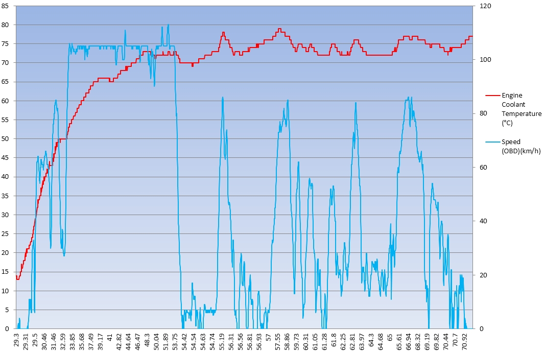 Neviem, ci vsetko, ale teplota funguje... Prikladam log z dnesneho rana (Carly adapter a Torque), cez 75°C je problem preliezt, ked tak, tak len v zapche, ked som stal... Zeby som bol dalsi adept na vymenu termostatu?
