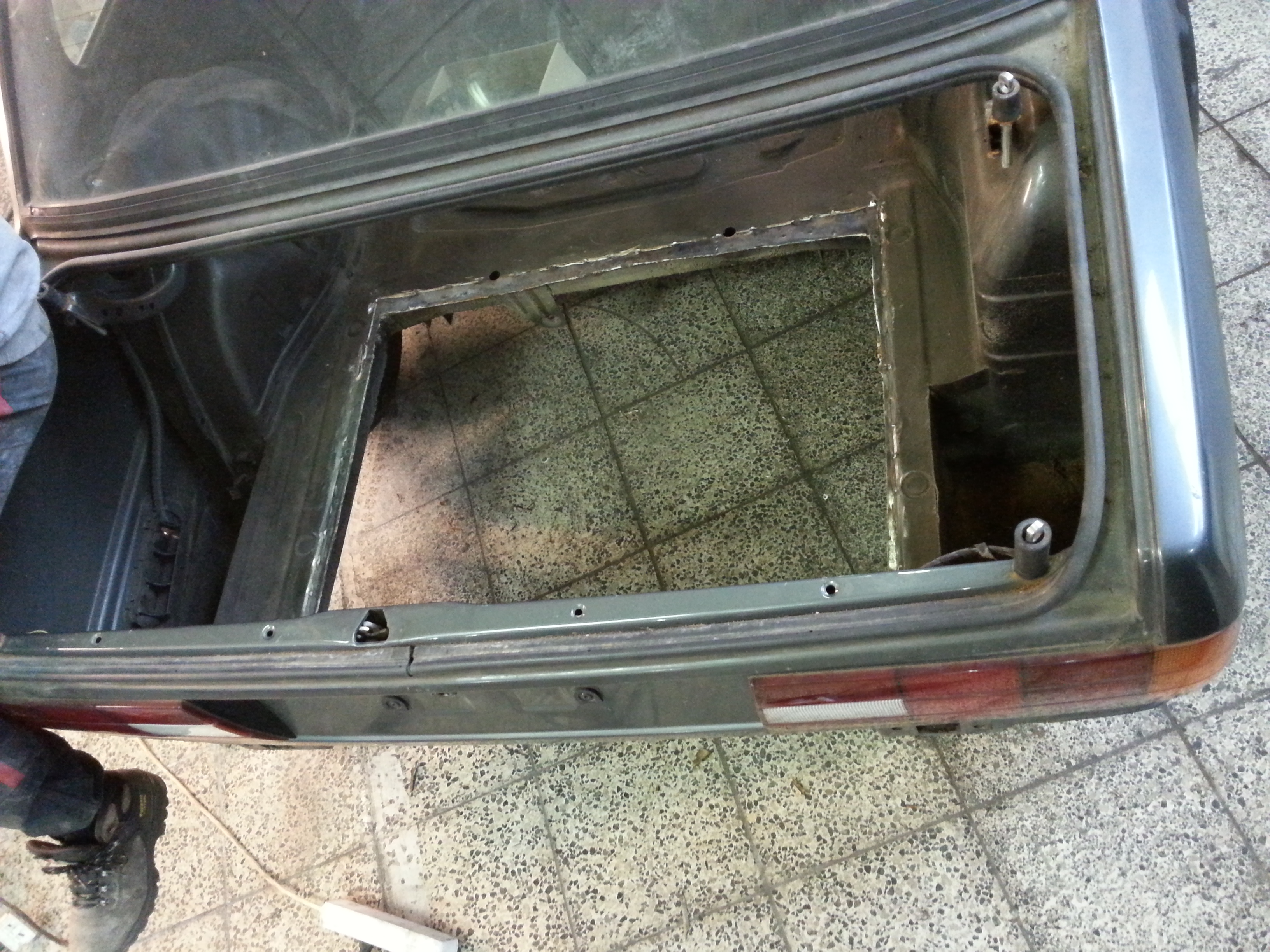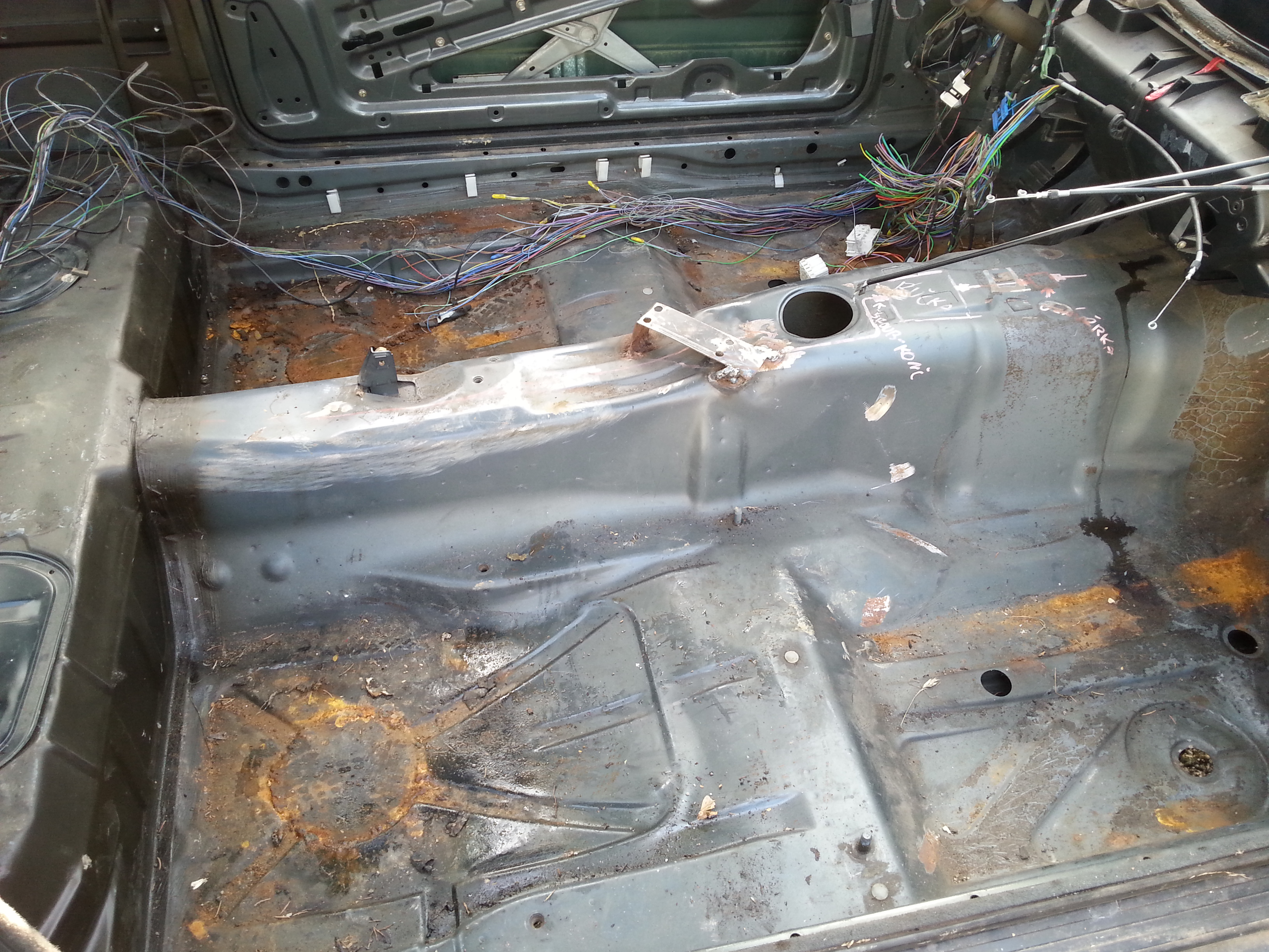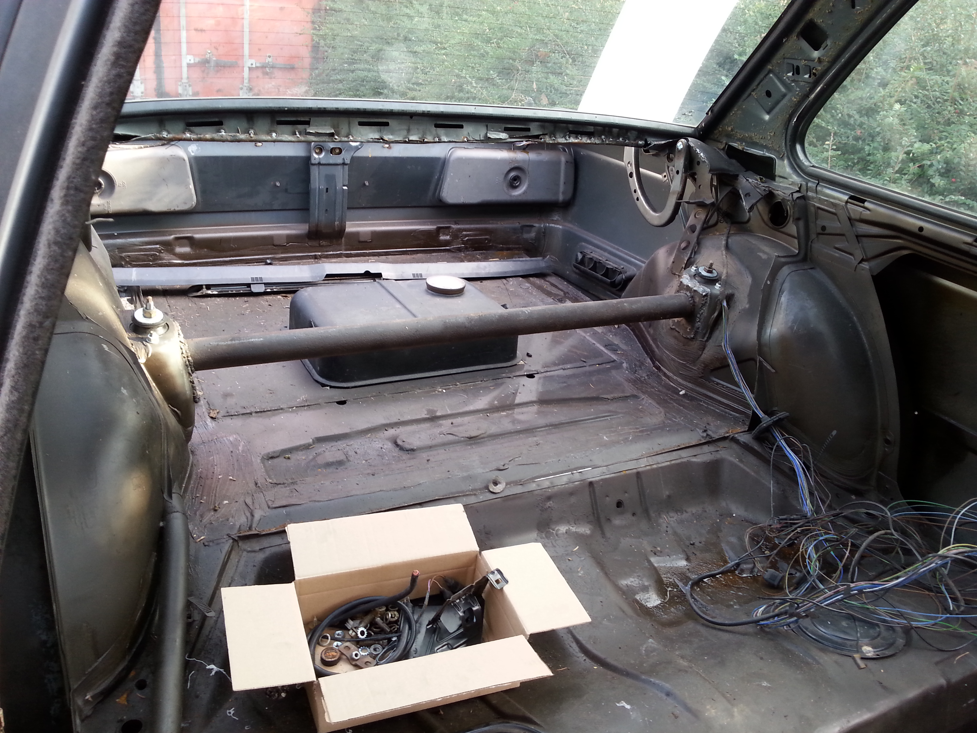Nová kasňa bola úplne zdravá , na podlahe iba 3 malé diery...lenže kasňa bola prerábaná na drift =D> vzadu rezerva vyrezaná a navarený plech s asi 20 litrovou nádržou :mrgreen: :mrgreen: , zadné čelo vyrezané kvôli výfukom ](*,) , vyrezaná zadná priečka na sedačky, zavarený otvor na veko paliva :roll: [-o< ](*,) ](*,) ](*,) zavarené zámky na dverách ](*,) :thumbup: predlžené predné ramená(nadvarené) [-X