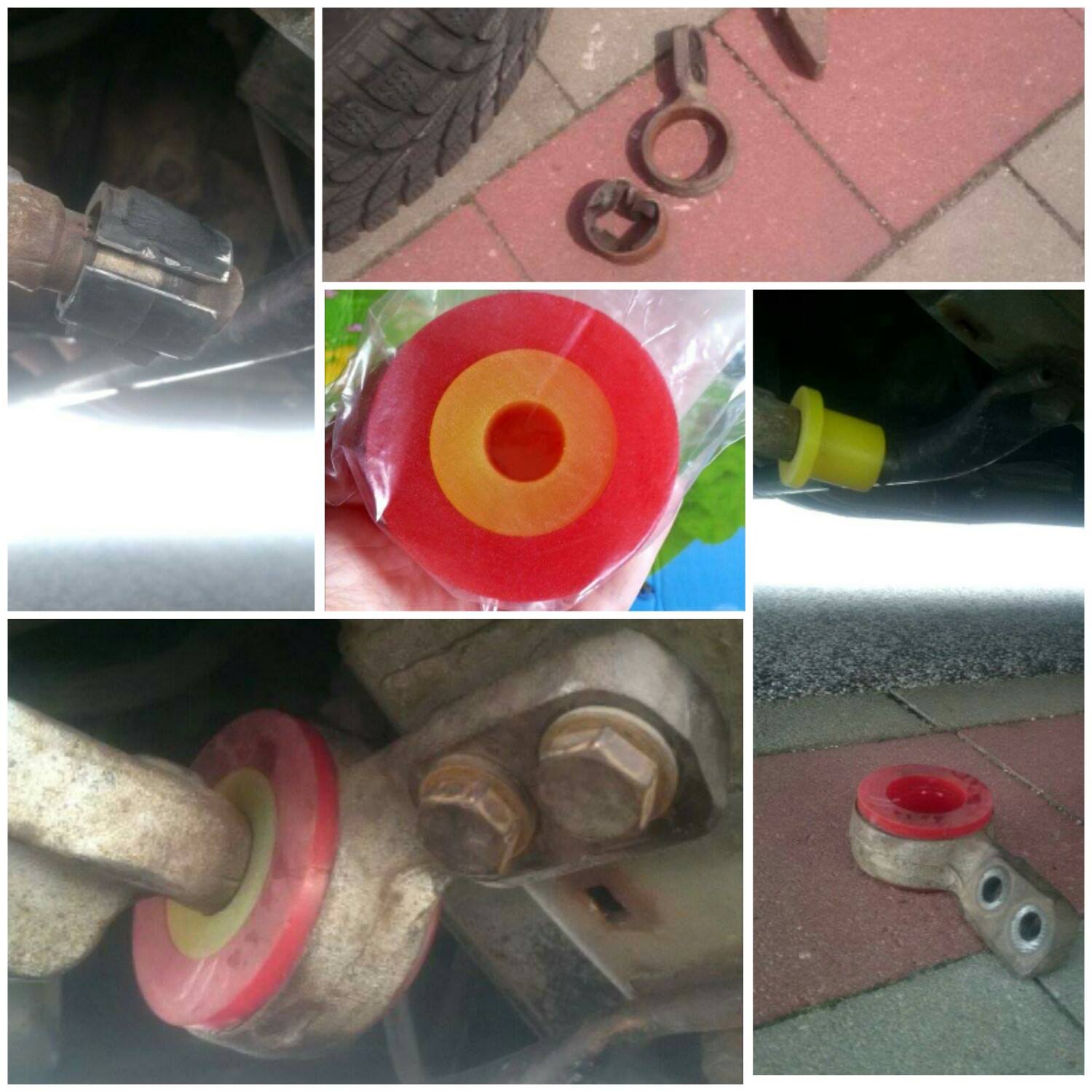 po kupe bolo treba urobit STK ci EK (jedno z toho koncilo mesiac po kupe, druhe niekedy na jesen). Dal som si urobit rovno oboje, nech tam nemusim behat na 2x. Vtedy som videl auto prvy krat zo spodu. Mechanik vravel, ze cakal ze to bude hrdzavejsie. Najhorsie to bolo za soferom pri nohach, kde by mala byt nejaka krytka. Tam je to riadne hnede na moj vkus. Co sa tykalo mechanickych problemov, tak by uz pomaly trebalo vymenit silentblok predneho ramena (31 12 9 059 288) a cap predneho ramena (31 12 6 758 510), obe na soferovej strane. Tak som objednal cervenozlte strongflexy (cca 45€) a ze to vymenim ako prve a rovno obe strany. Soferova strana sla velmi rychlo, Zodvihnut auto, zhodit koleso, odsrobovat drziak priecneho ramena a kedze bol silentblok uz nacaty, tak len pokracovat v odtrhnuti gumovych spojov vnutornej a obvodovej casti. Pomohol mi pri tom aj list z pilky na zelezo. Nexce sa mi to dalej rozpisovat, pozrite si video.