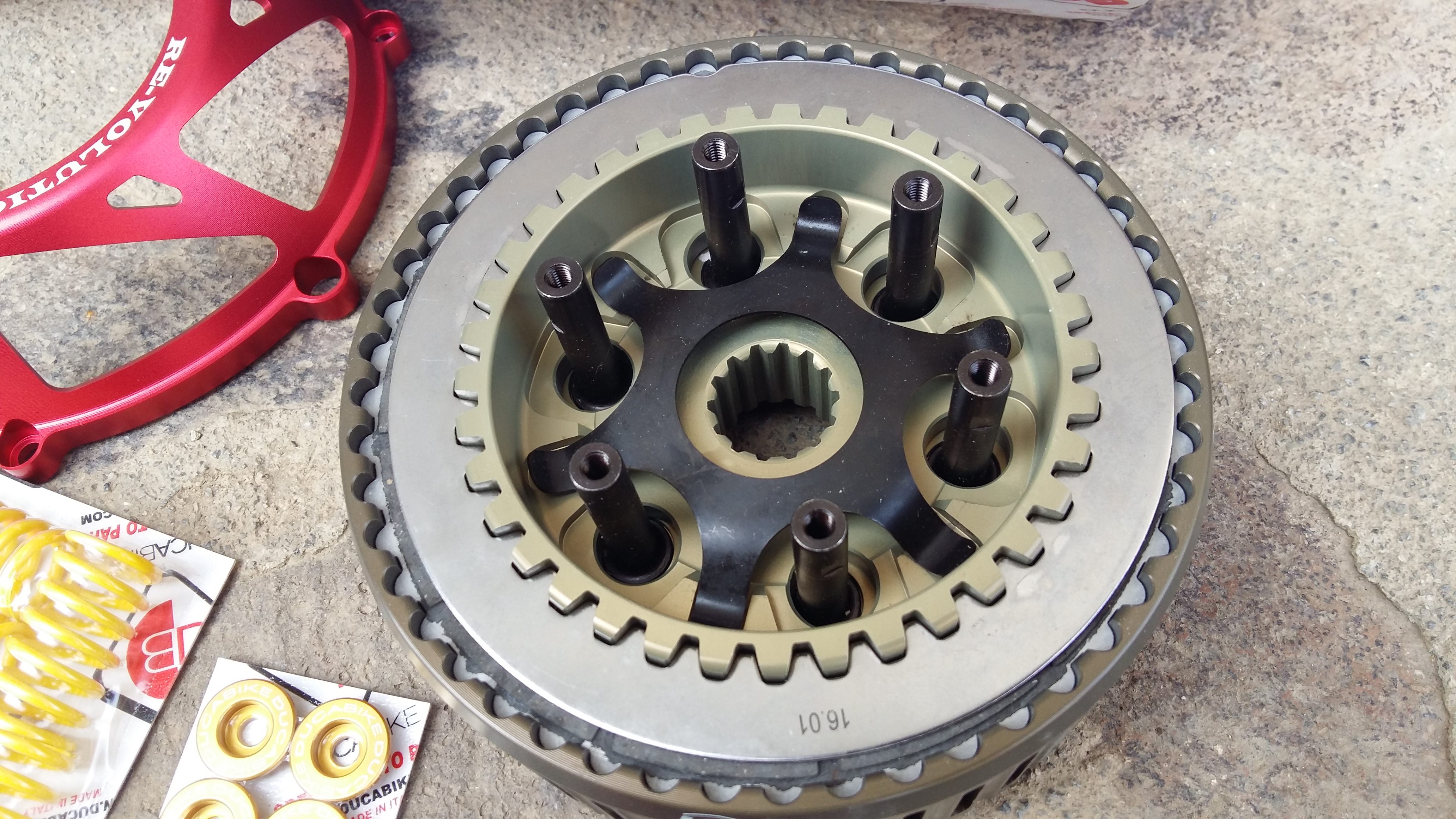 Pôvodný oceľový kôš je nahradený duralovým, takže by mala byť nižšia hmotnosť. Pôvodný 12 zubový kôš je nahradený 48 zubovým. Takže kôš by mal vydržať oveľa dlhšie (snáď potiahne aspoň 40t km:) a má 4x väčšiu plochu takže by malo lepšie zaberať. Ďalej ako by to bolo keby nemám Ducati s otvorenou spojkou :) takže otvorený kryt spojky od výrobcu EVR. Vlastne všetko je to EVR. Tento výrobca dodáva priamo diely pre Ducati corse na závodné motorky tak by to malo aj čosi vydržať (a dúfam, že podľa ceny to vydrží už navždy :) :). No a keď otvorený kryt spojky tak už otvorený ako sa patrí. Namiesto klasického prítlačáku je duralový prítlačák model CORSE. Samozrejmosťou je nové ložisko a také vecičky okolo. No a kedže tú celú nádheru bude vidieť tak aj strunky a čiapočky (mištičky) v zlatej farbe. Nakoľko má motorka zlatú vidlicu tak to bude jemný detail a myslím si, že výsledok bude vyzerať celý elegantne. By ste neverili, čo môžu stáť tie malé strunky :) no a posledný upgrade je ten, že spojka je už v prevedení antihoping. Samozrejme nové lamely a pliešky z organickej zlúčeniny či ako sa tomu hovorí.