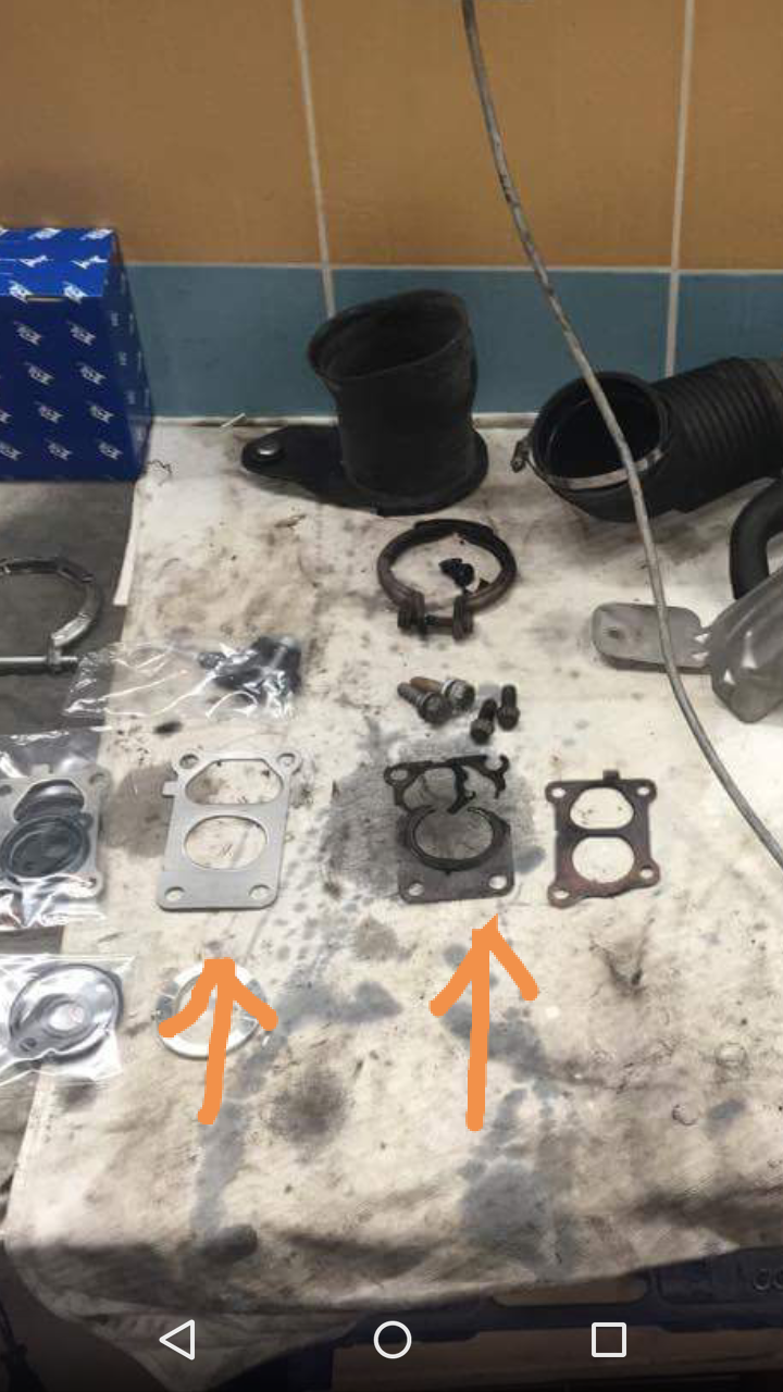 pretesnenie oboch turbín, tu je vidieť tesnenie medzi zvodmi a velkým turbom kde dôvodom podfúknutia bola slabo pritiahnutá šroba jedna zo štyroch ktorá časom vypadla