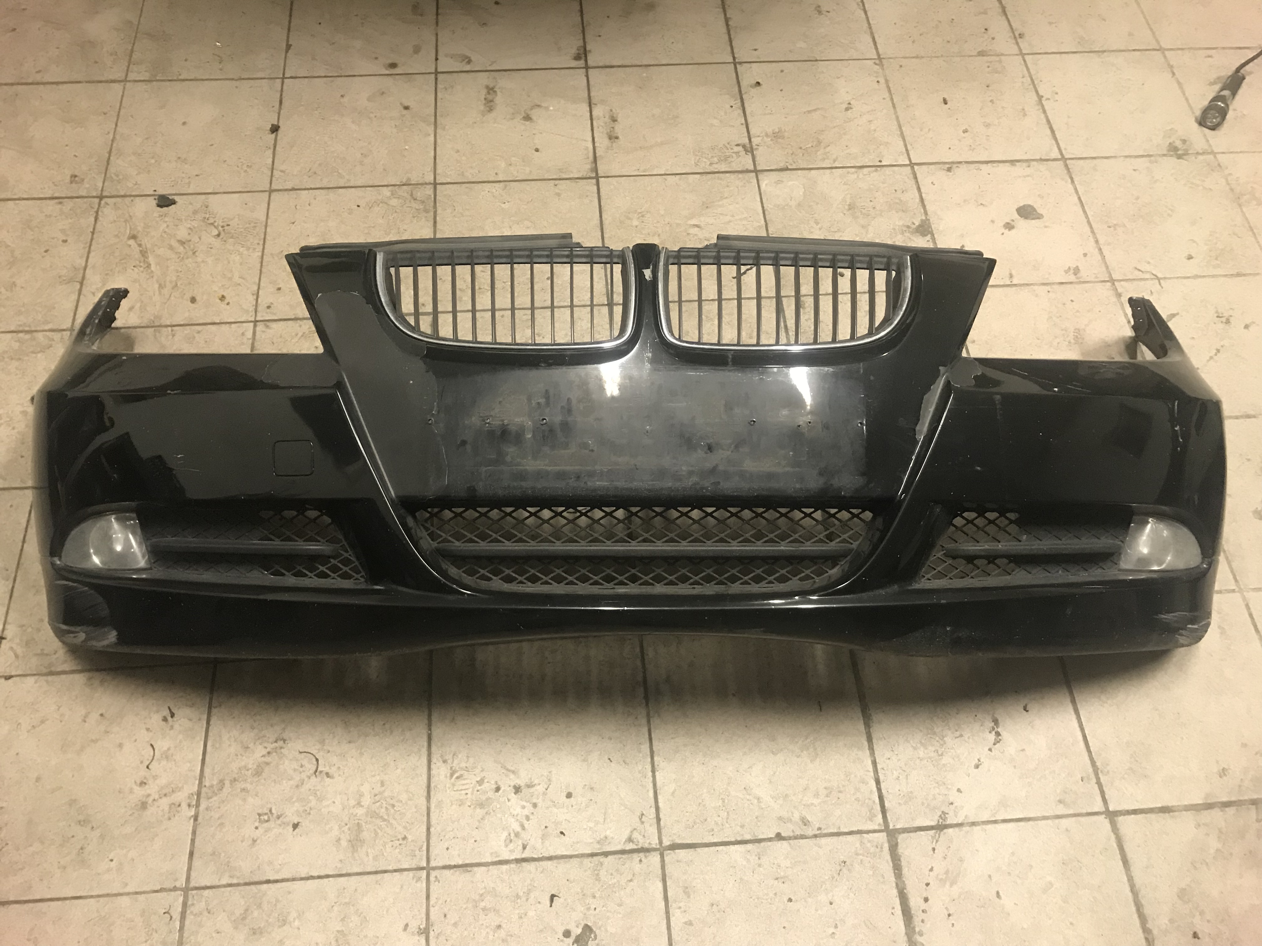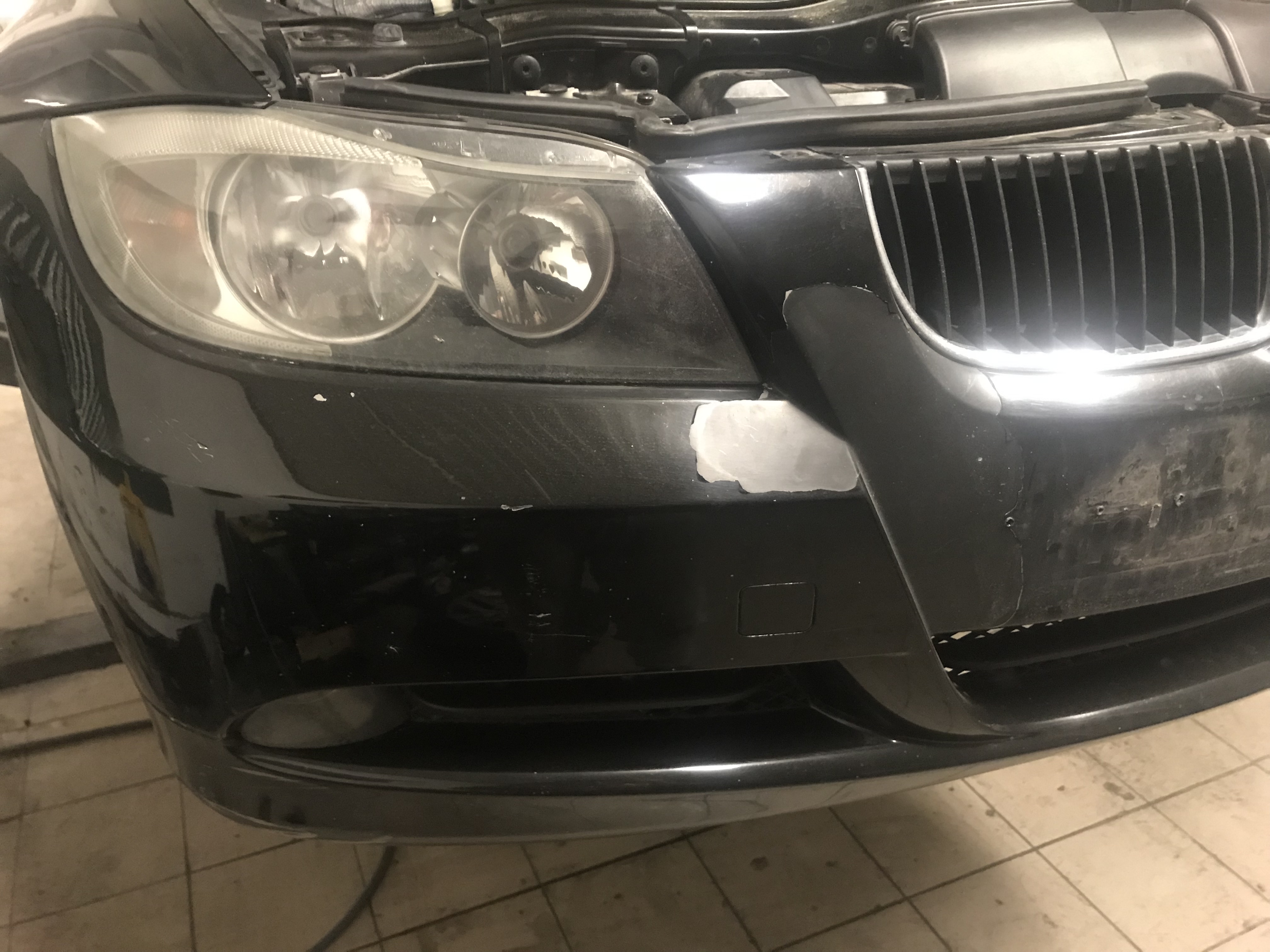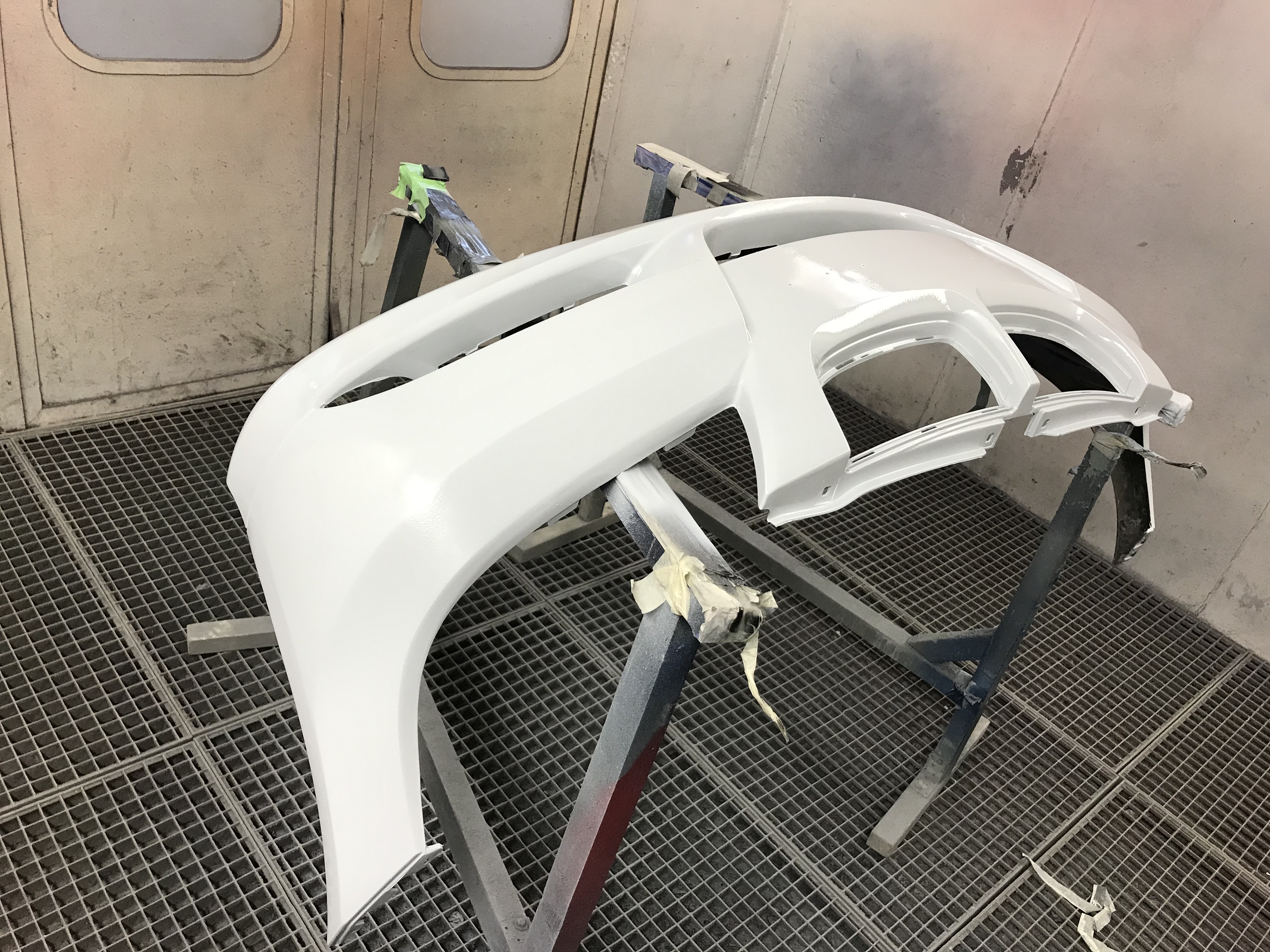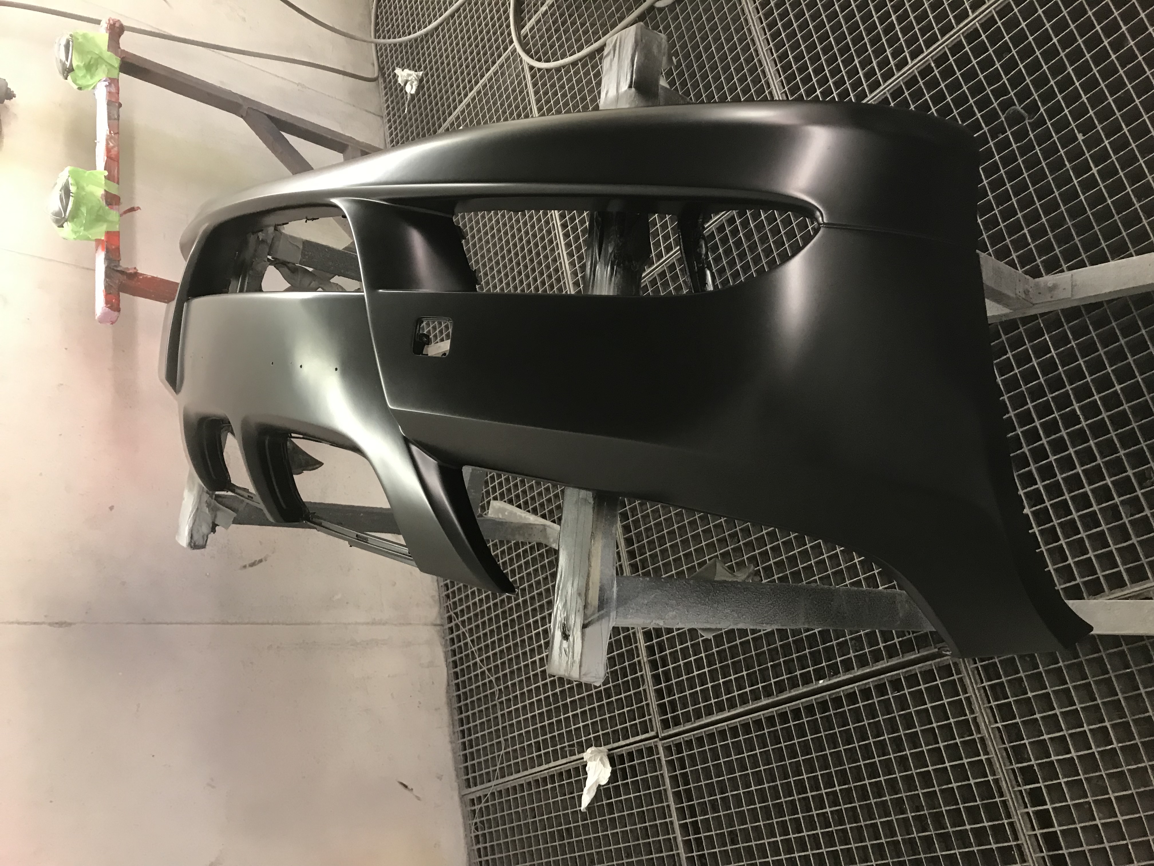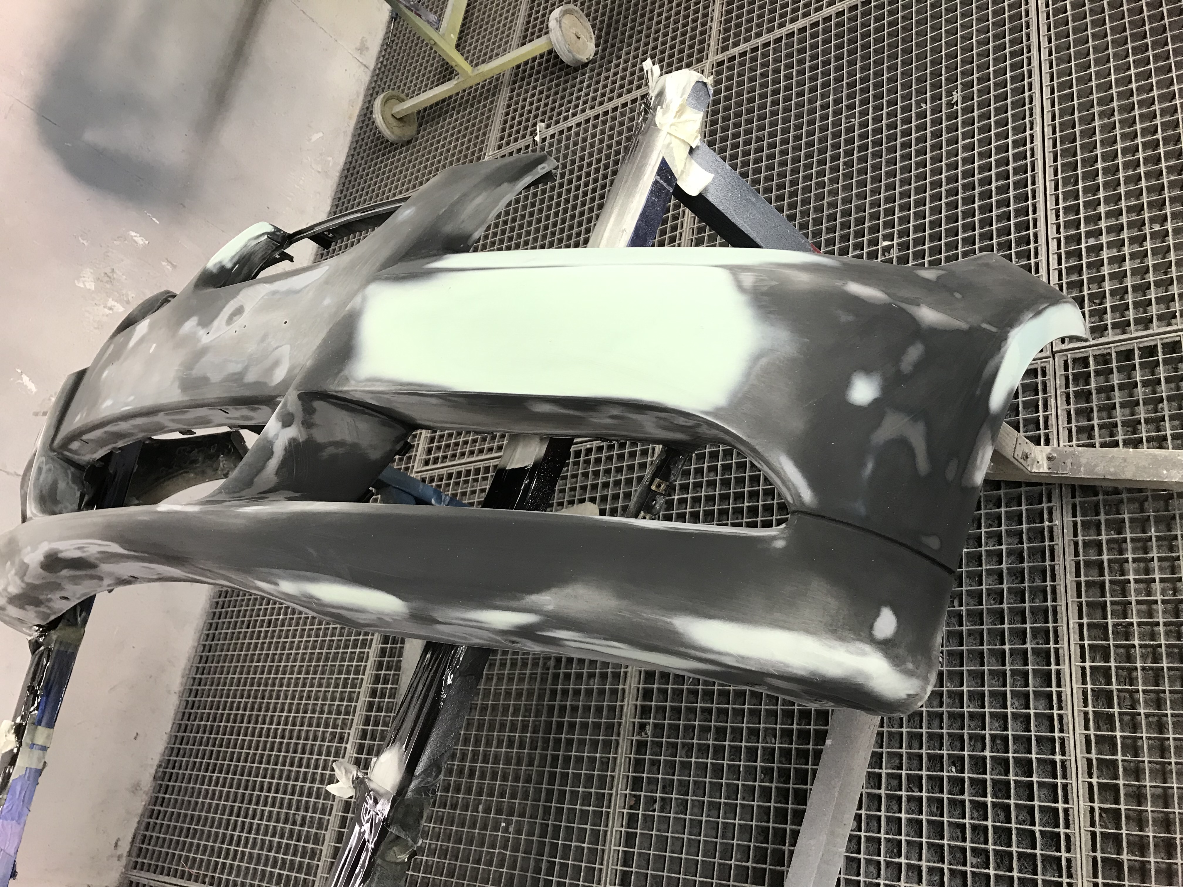Predný nárazník rozbrúsime excentrickou brúskou až do "plastu" šmirglom P80, P120, následne zahladíme ryhy použitím brusiva P180 a najemno dobrúsime brusivom P240. Snažíme sa obrúsiť do hladka všetkú olupujúcu sa farbu, všetky škrabance, poškodenia. Celá plocha nárazníka musí byť obrúsená nakoľko tam, kde neobrúsime farbu sa nám vrstva materiálu bude po čase odlupovať.