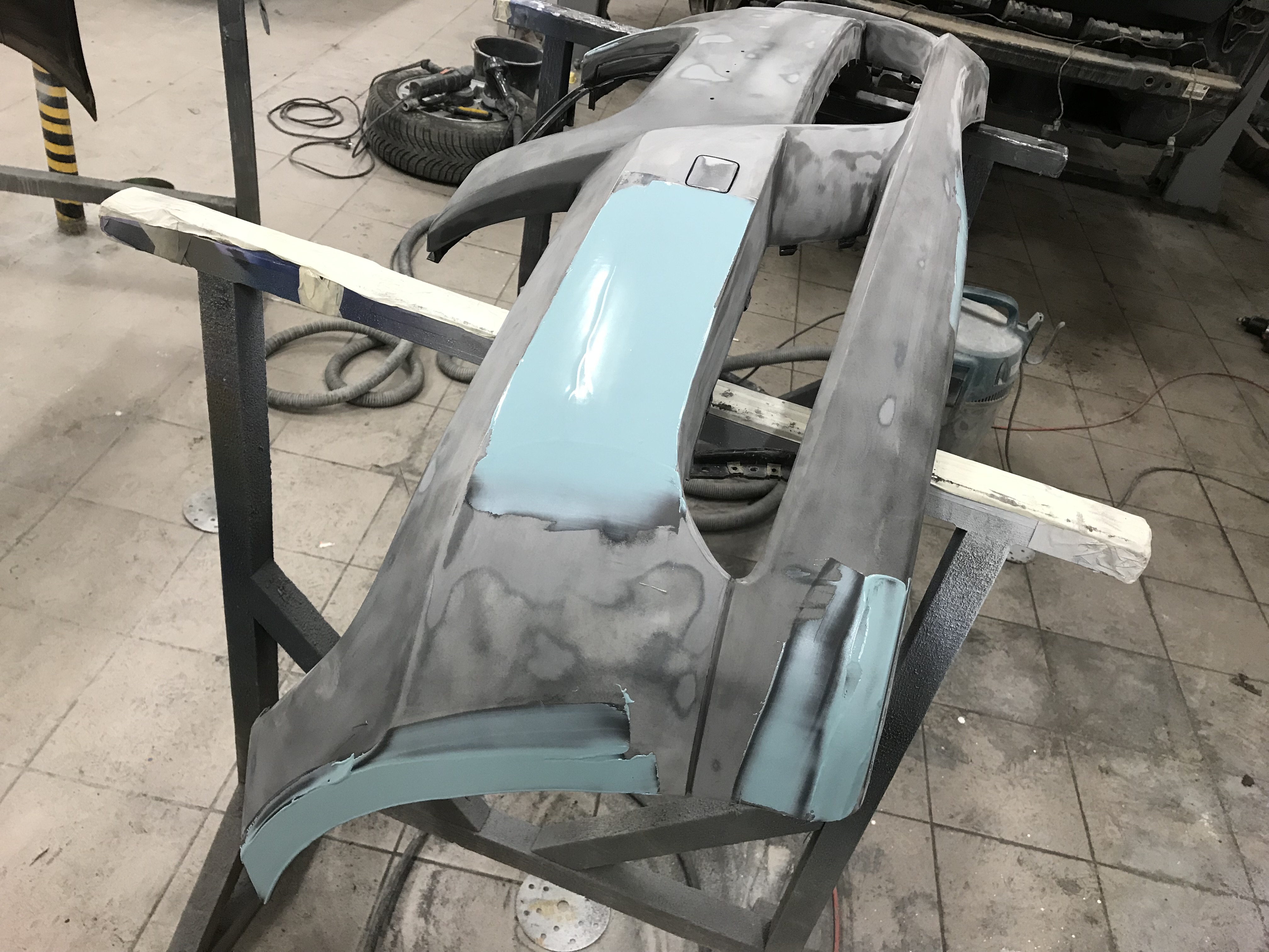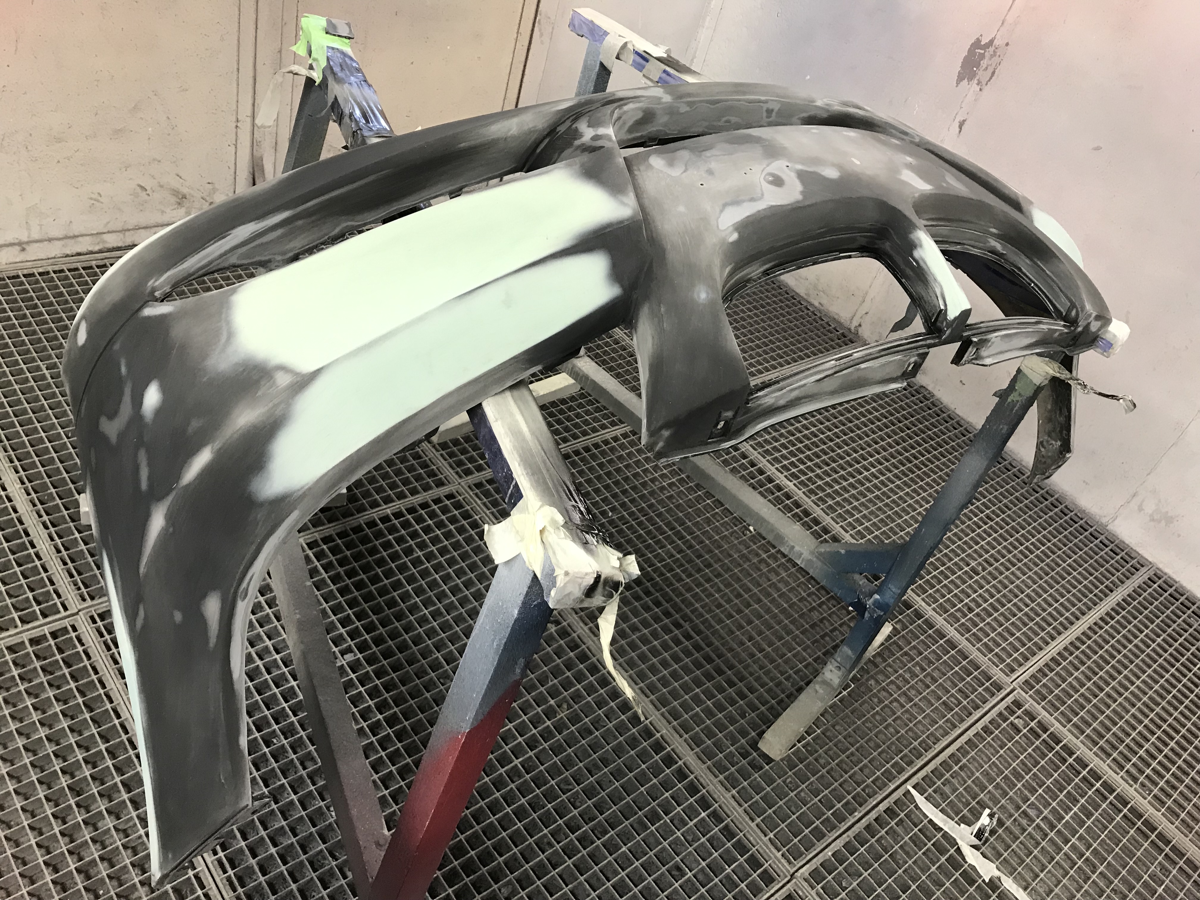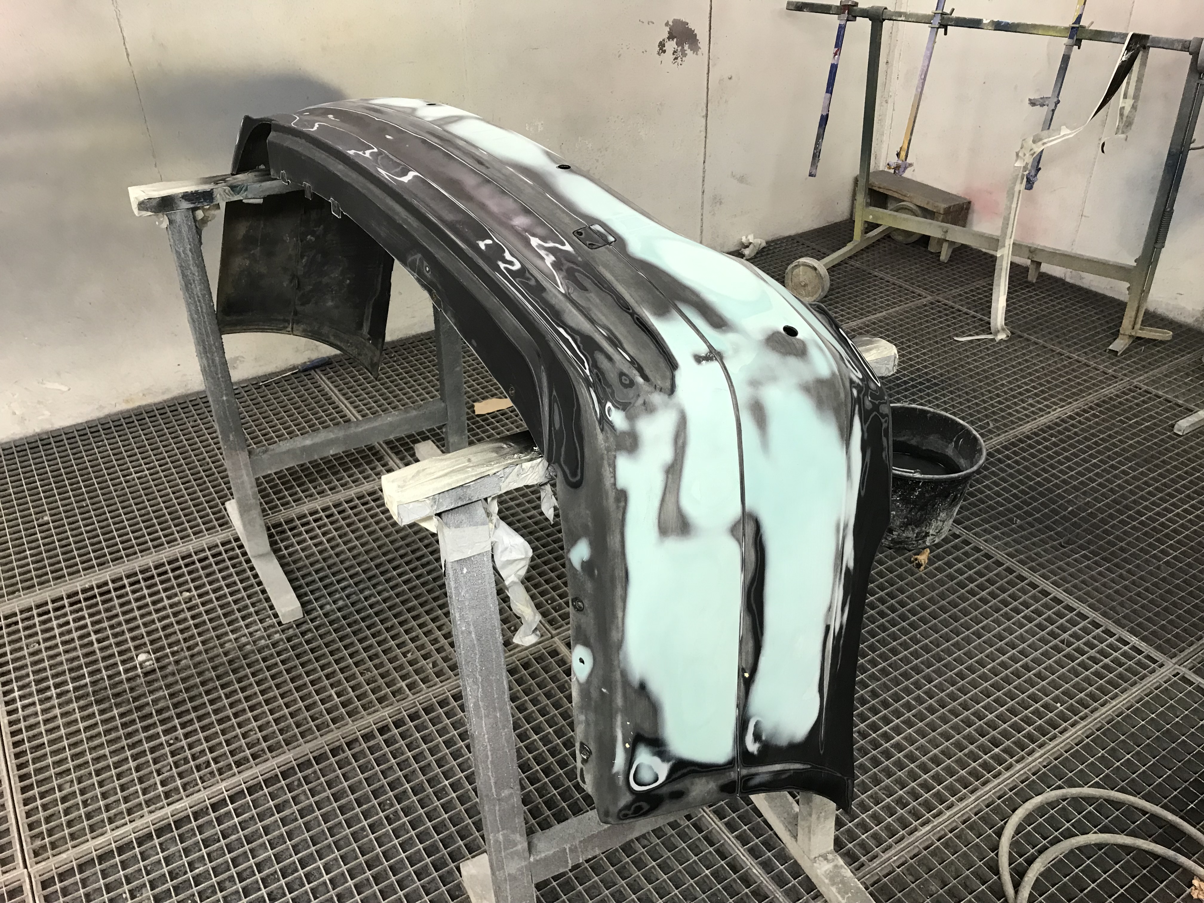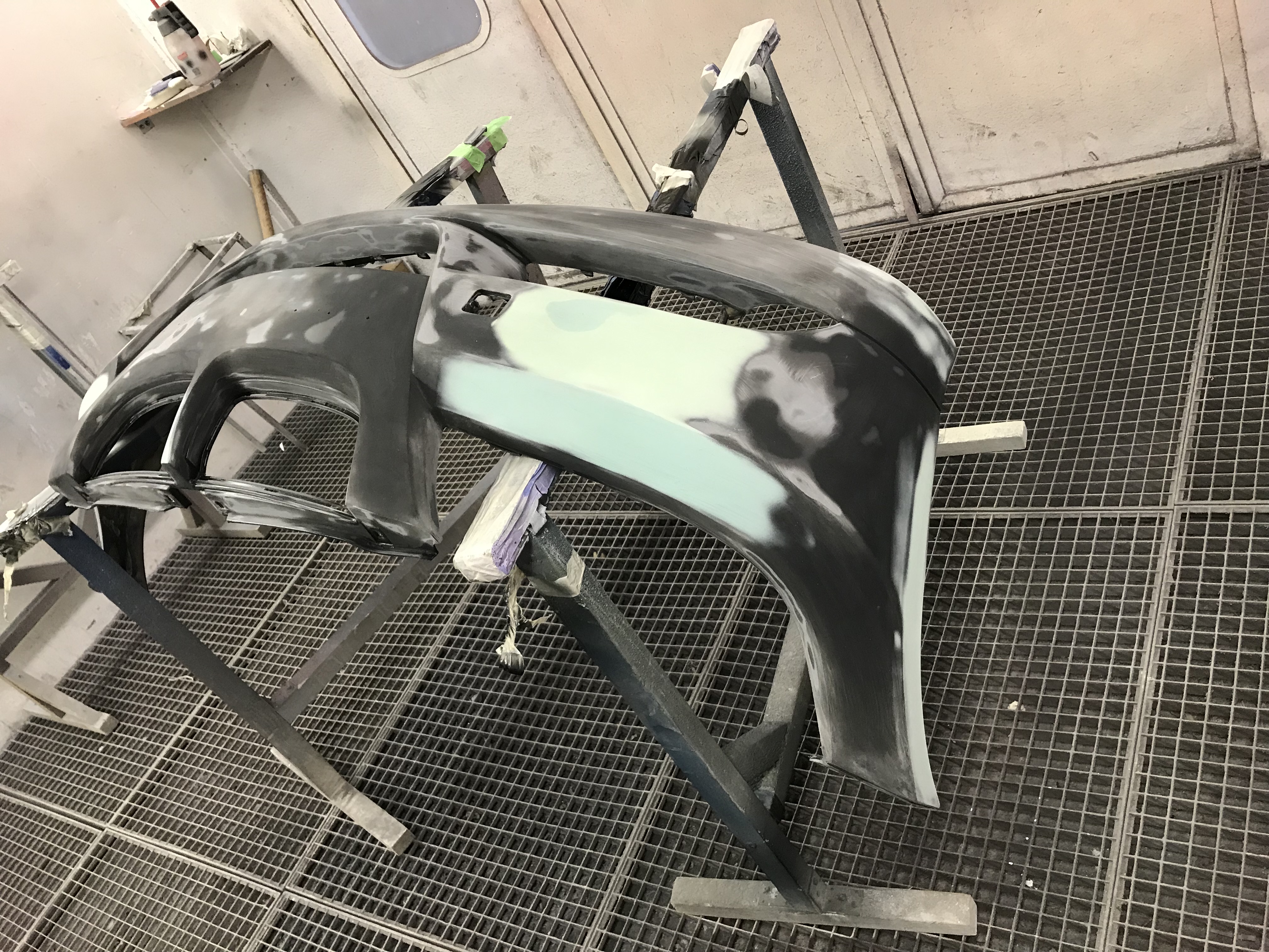 Po obrúsení, vytvarovaní, vyfúkaní a odmastnení dielu nanesiem na nárazník tenkú vrstvu základu na plasty a po odvetraní cca 5 - 10 minút, nanesiem 2 - 3 vrstvy plniču.