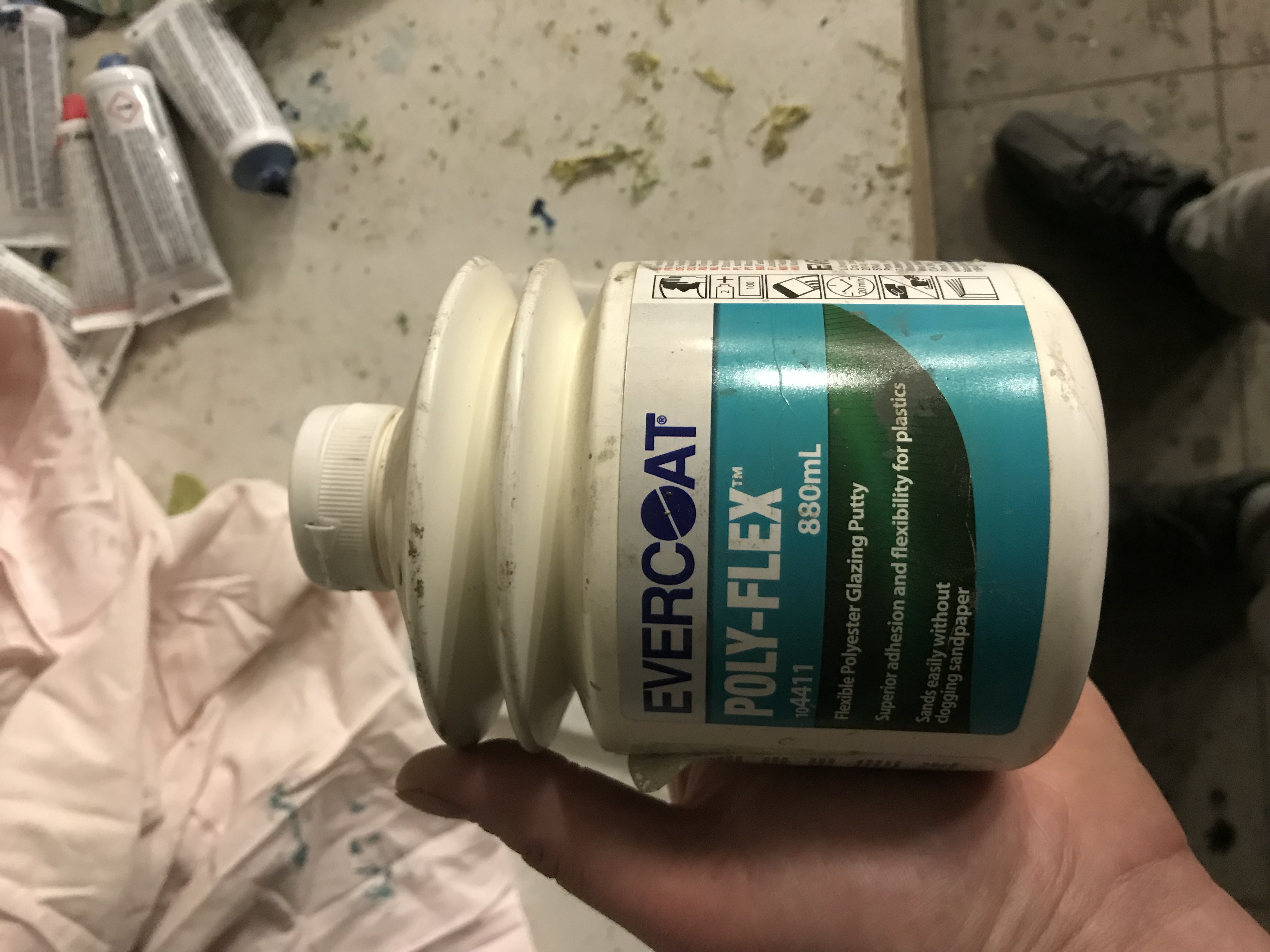 Po obrúsení dielu prichádza na rad tmelenie. Nakoľko sa jedná o plastový diel, použijem tmel Evercoat PolyFlex,alebo adekvátnu náhradu tmelu, ktorý je priamo určený na opravu plastových dielcov (zvýšená priľnavosť k plastu, zvýšená pružnosť tmelu). Tmel nanesiem na poškodené miesto plastovou stierkou a nechám ho vytvrdnúť. Na spracovanie tmelu mám cca 5 minút, ak je v dielni viac ako 30C, prípadne pracujem na priamom slnku, tak sa čas spracovania tmelu skracuje aj na polovicu. Tmel necháme vytvrdnúť cca 30 minút.