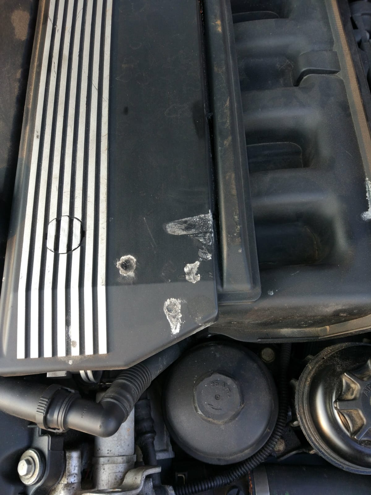 E39 vypálené dierky na vrchnom plasre motora