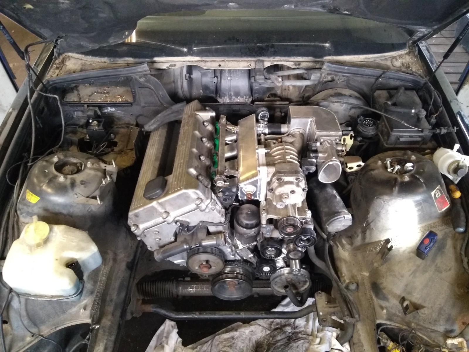 Najblizsie chcem komplet osadit nanecisto kompresor na motor, ten cavo z bimmerforum totiz zistil ze sustava kladiek neni dokonala a musel dorobit pod kompresor dalsie dve, takze to chcem mat nez pojde motor do auta.