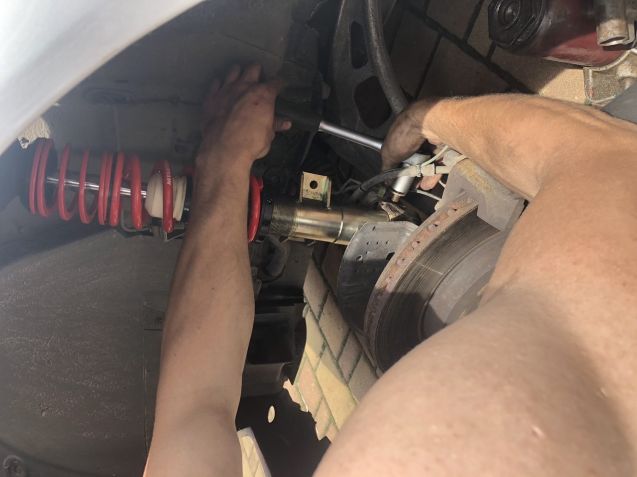 Tak som sa pustil do demontaze , vzadu som tlmice menil nedavno za bilstein tak som mal uz skusenost tak to prebehlo vcelku rychlo ale ako som sa dostal k predku tak nastali mensie komplikacie pretoze som nemal stahovaky tak sa zaimprovizovalo a vyrobili sa vlastne 😀. Vsetko sa zlozilo dokopy a postelovalo.