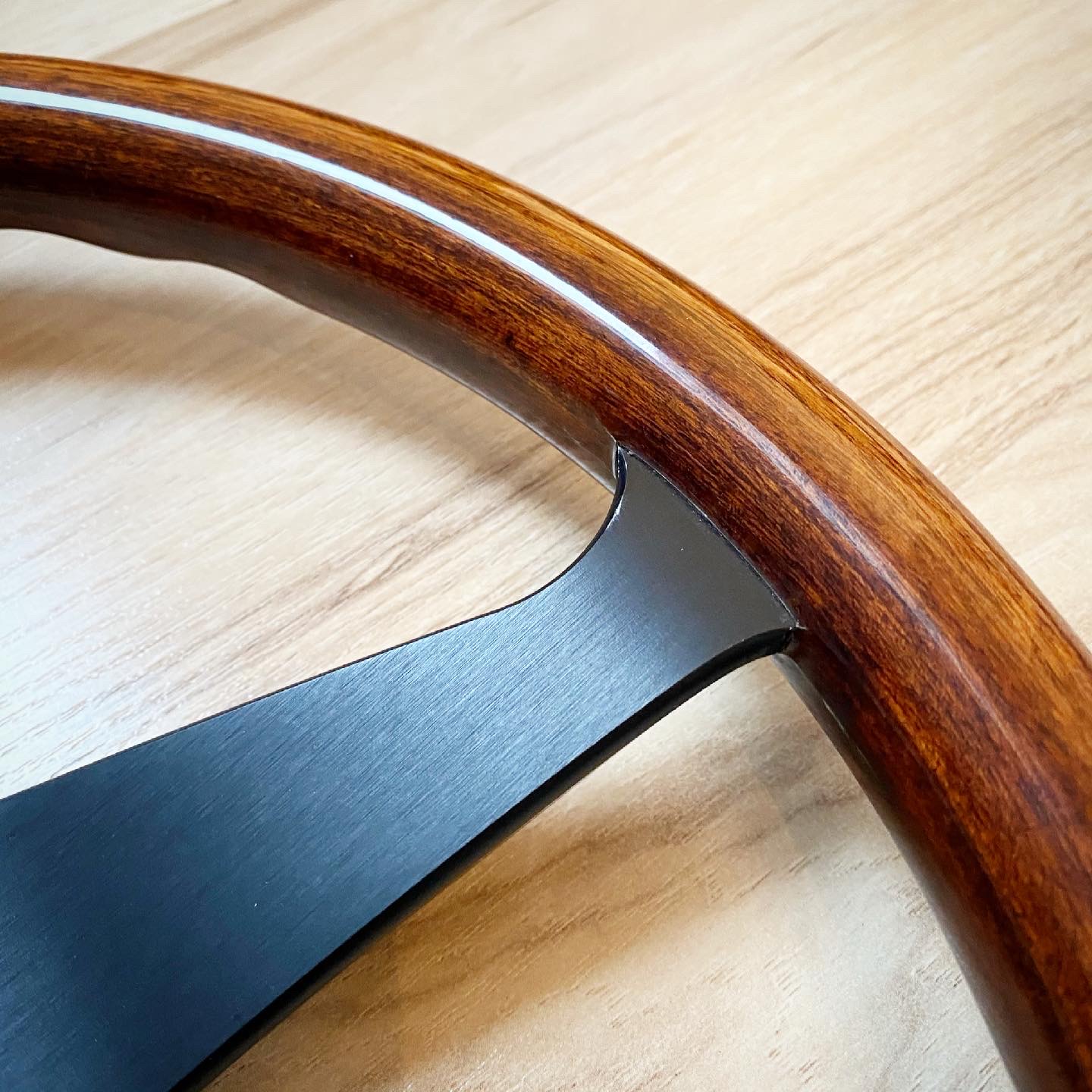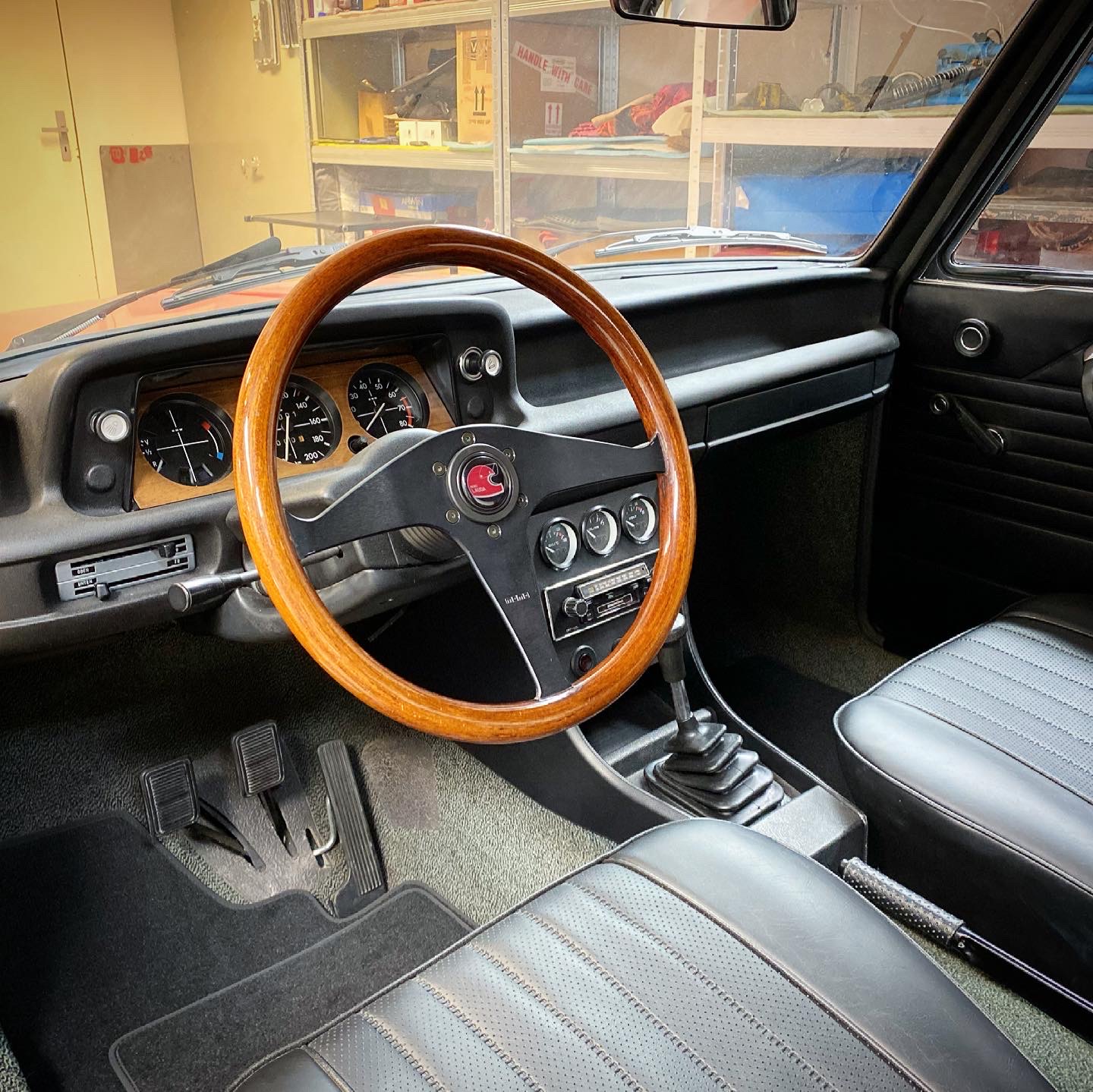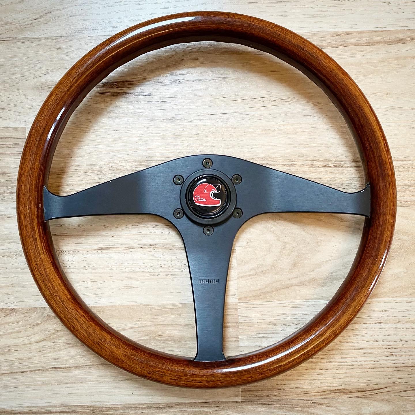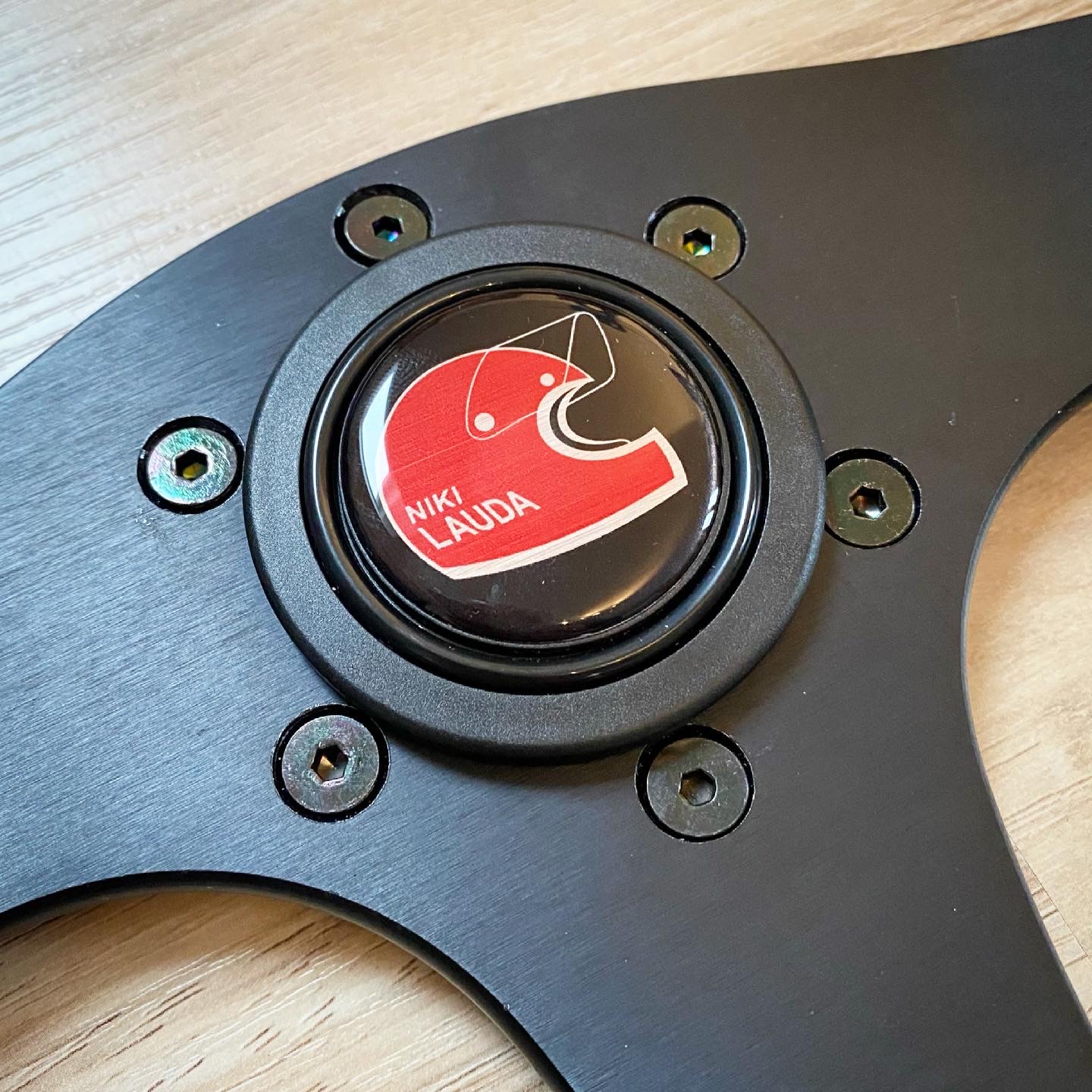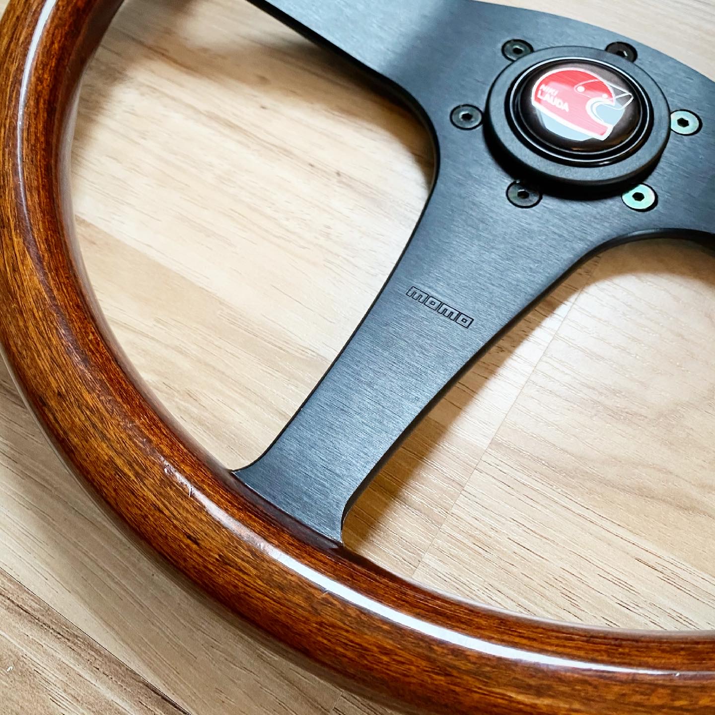 Chcel som do zbierky aj dreveny volant, tak som si spravil radost a kupil Momo DL36 z roku 94. K tomu horn button Niki Lauda. Je to pre mna symbolicke, lebo Lauda vyhral prvy krat F1 v roku 75, co je rocnik mojho auta. Je narodeny vo Viedni, kde bolo moje auto ako nove kupene. A je aj cerveny :lol: