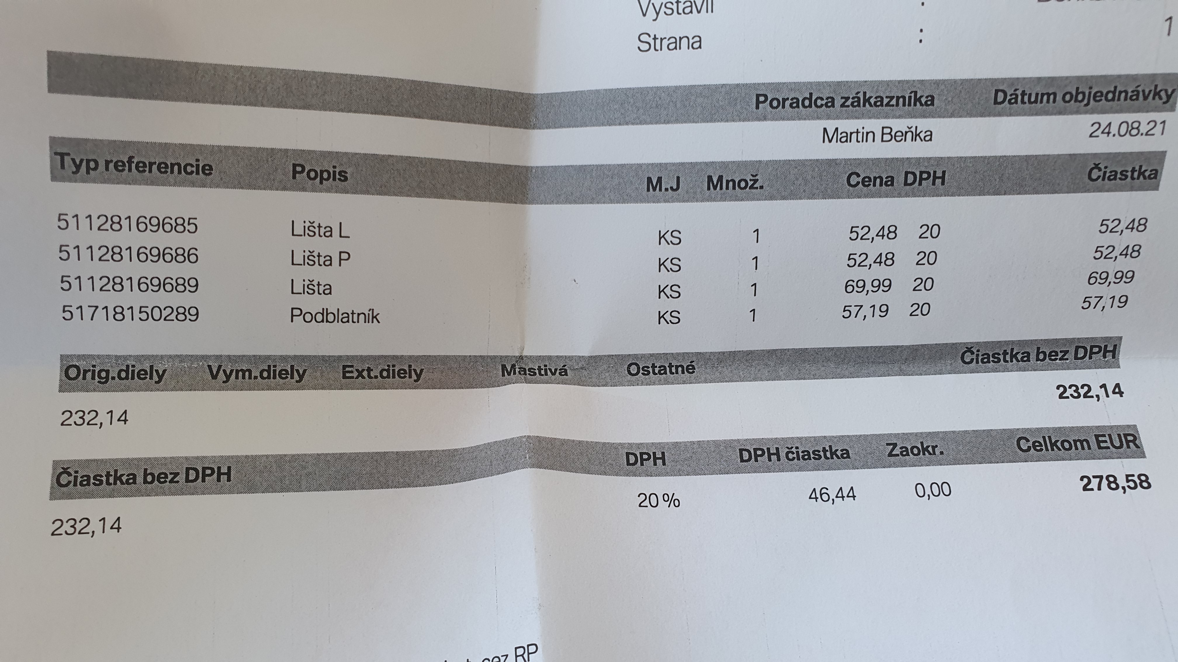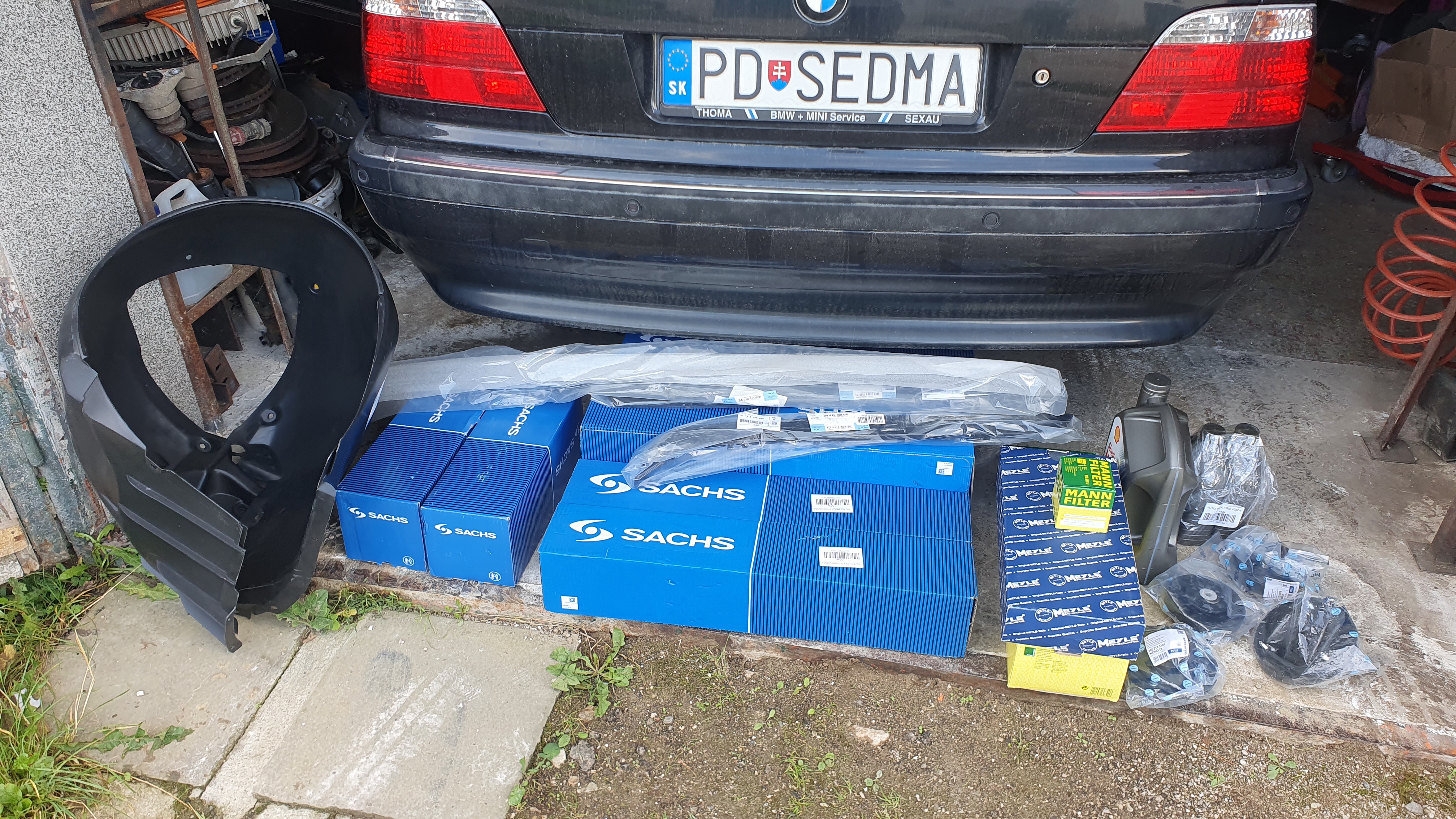 Tak august a september prebehla pomedzi pracovne turnusy vymena tlmicov a pruzin a hornych ulozeni (jasne ze to neslo naraz lebo mi prisli nespravne pruziny dozadu a kym dosli tie spravne uz som musel zas do prace) nakolko som zistil ze auto sa uz nechova tak ako som zvyknuty par mesiacov, predok pruziny ok, tlmice uz isli po stlaceni hore pomalsie ako nove. Zadok tlmice KO a pruziny prasknute obe a tak ako aj tie predosle a vlastne ako kazde pruziny vzadu co boli na aute :-k dalej klasika olej a filtre. Objednal som si v TOBku hned aj tmave listy do narazniku nakolko tie povodne uz su osumele a netvori to pekny celok s tymi novymi svetlami. Este som si doobjednal predny lavu podblatnik nakolko pri plnom vytoceni dolava on sucha koleso ako je umiestnene webasto, pricina deformacie predpokladam prehriatie plastu od webasta, na povodnom podblatniku je v tom mieste nalepeny ochranny plech tak som dufal ze to bude aj na tom novom ale neni, takze s tohto som trochu sklamany, nevadi, pri vymene podblatniku ten plech prehodim... no a ako bonus typicka choroba E38, z vecera do rana zo stropnice stal sa baldachyn #-o :lol: takze to dam hned aj zo stlpikmi precalunit, koniec hlasenia.