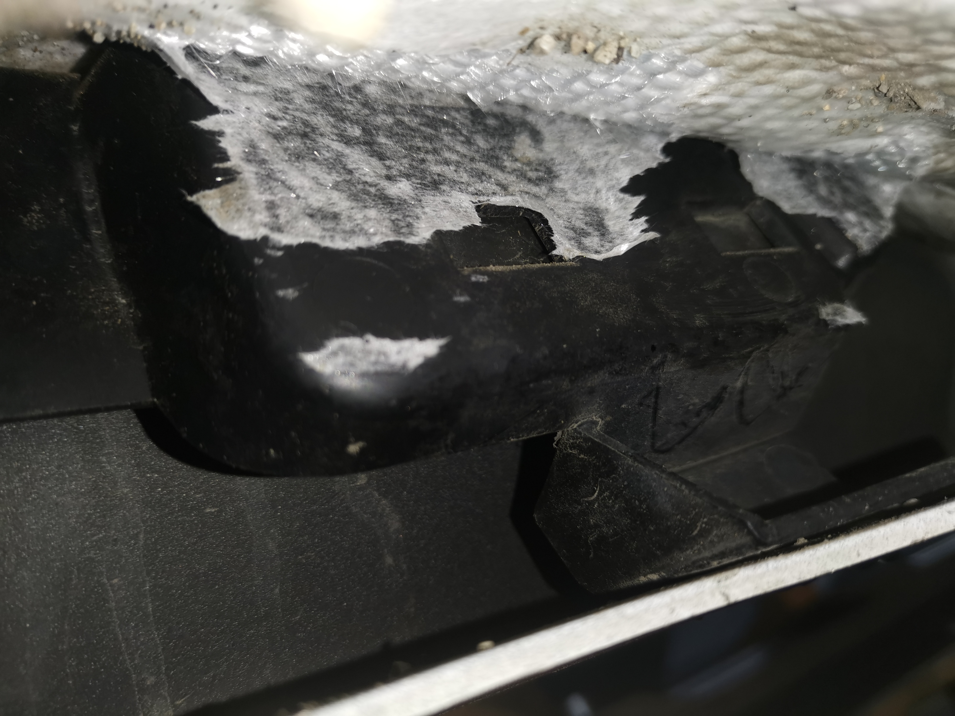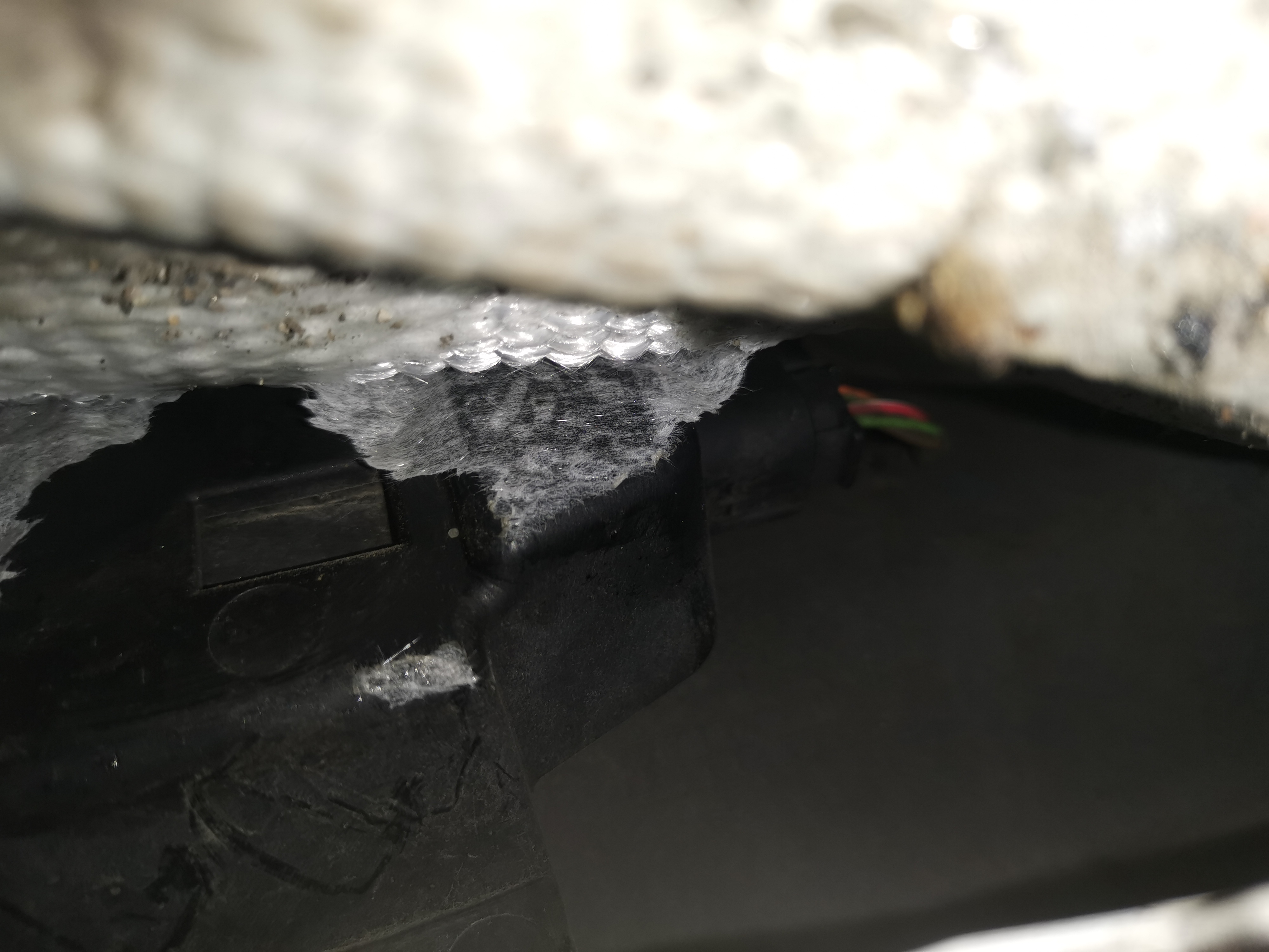 Vnútorná strana zadného nárazníka strana vodiča. Obával som sa ci to nieje dáka riadiaca jednotka poprípade zadný radar mŕtveho uhla ale je to len konektor na ktorý sa napájaju parkovacie senzory a keďže som to aj odizoloval 2mi vrstvami ziaruvzdornej fólie tak by to malo byt ok.