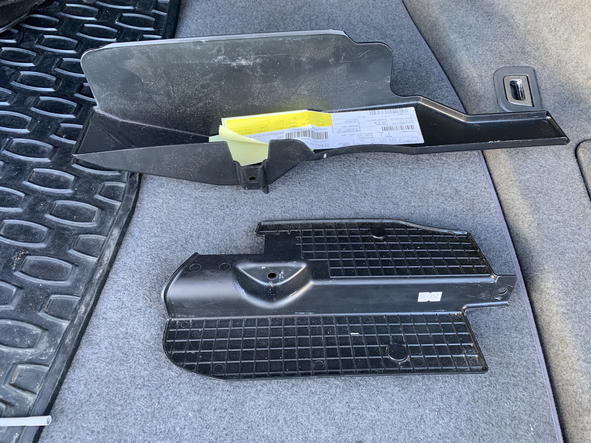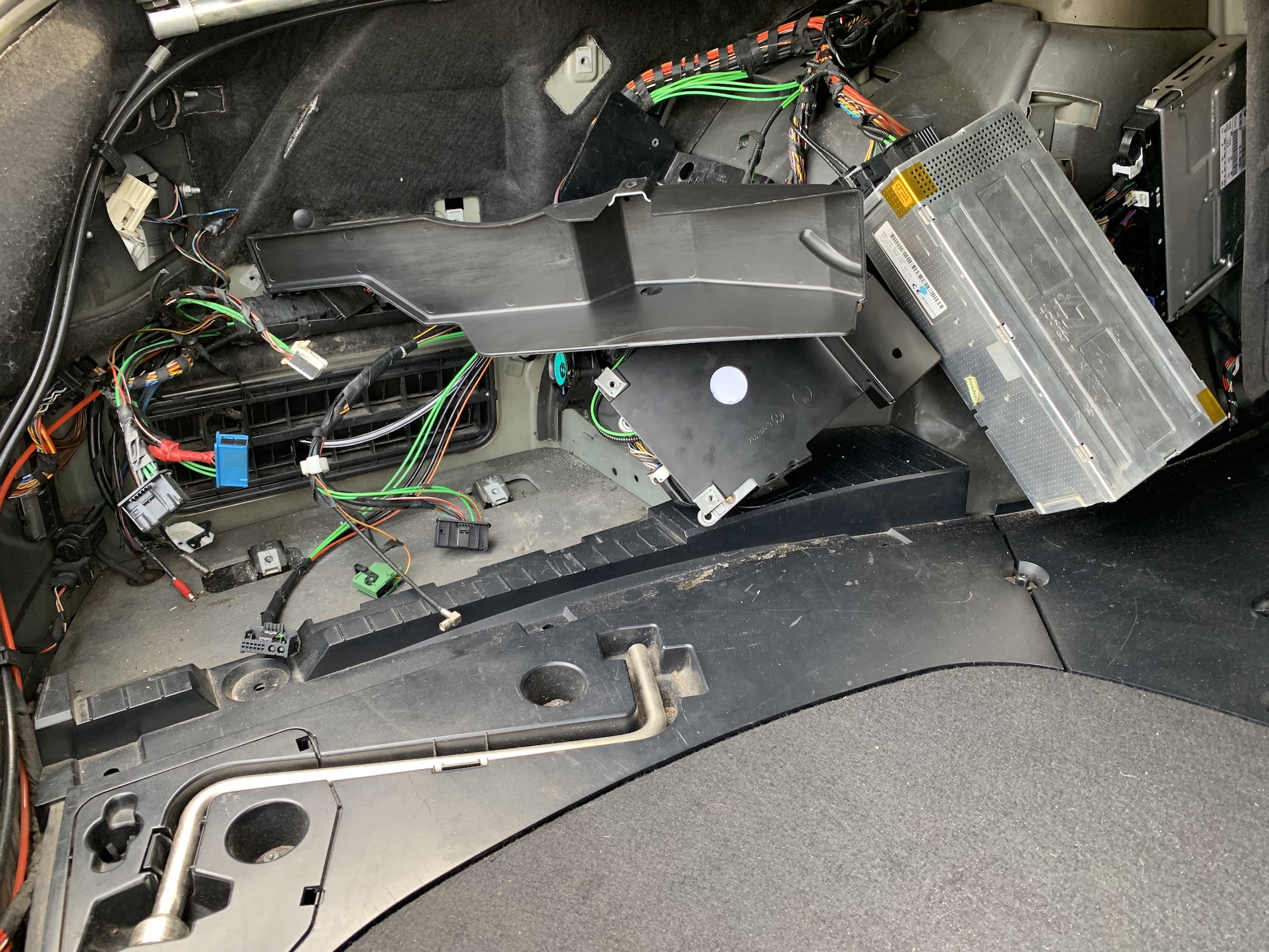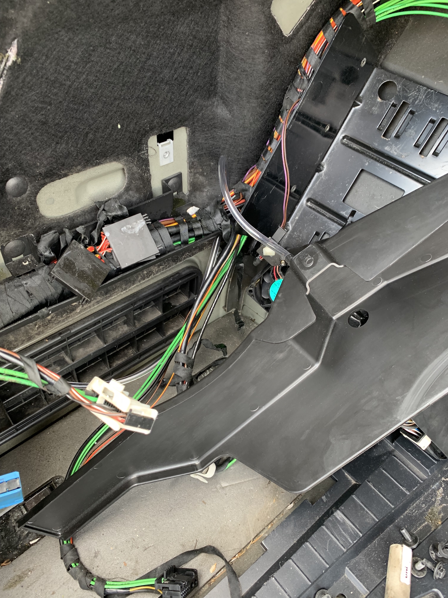 Tá E66 ma neprestane prekvapovať. Viete čo sa stane keď prší alebo umývate auto a potom neskôr otvoríte kufor? Voda ktorá sa dostane cez pánty kufra dnu ostane v pánte a akonáhle sa otvorí tak sa krásne vyleje na tie jednotky v kufri. Riešenie je “jednoduché”. Retrofit - vanička - ktorá zachytí vodu a cez hadičku vyvedenú do blatníka ju odvedie mimo auta. Akurát musí ísť všetko von. V mojom prípade na dvakrát - lebo nové držiaky, opraviť kabeláž, pásky atď… a nech je to zložené už navždy. Lebo by som bol nerád keby repasovaný Logic zase umrel kvôli vode