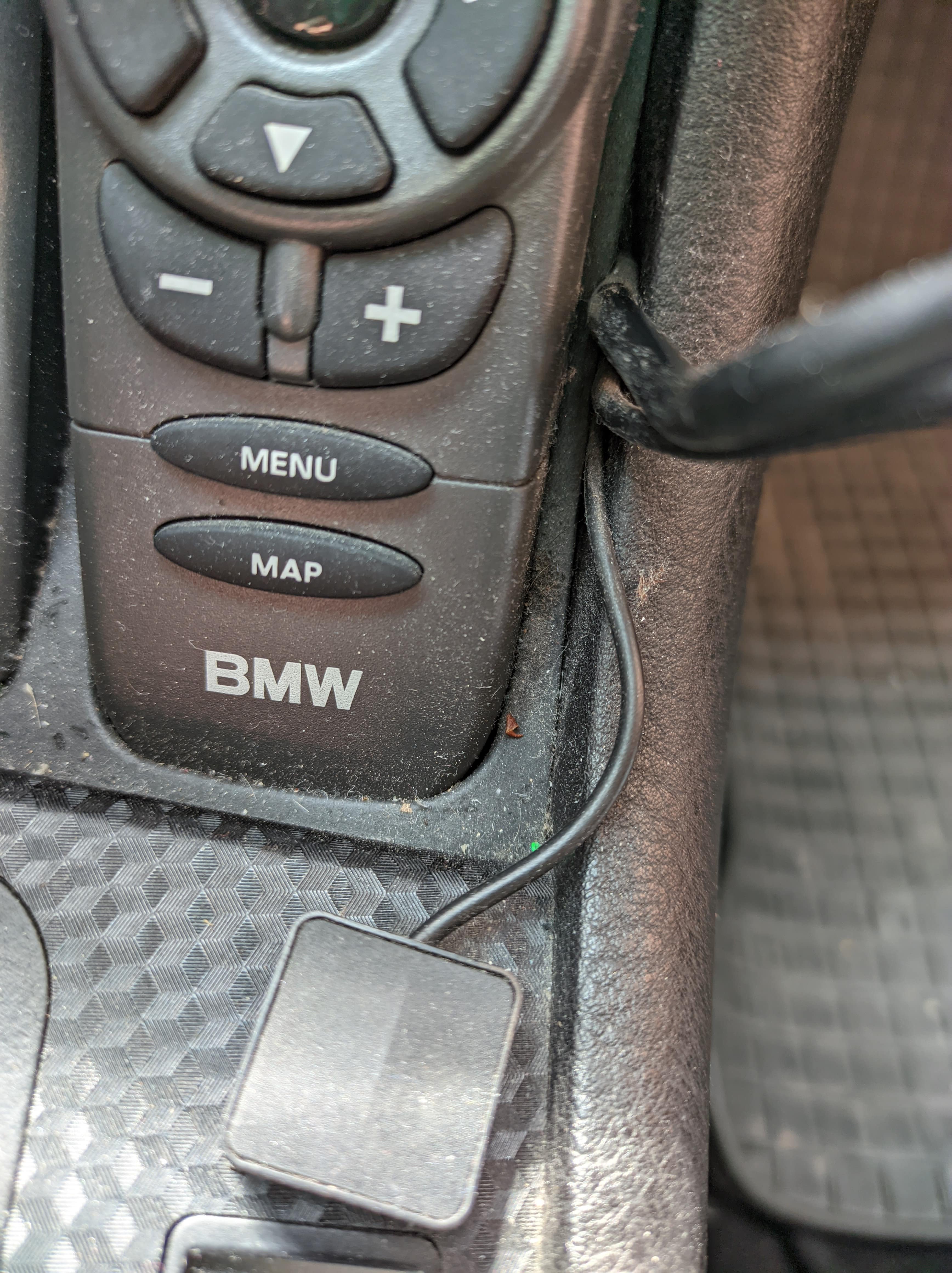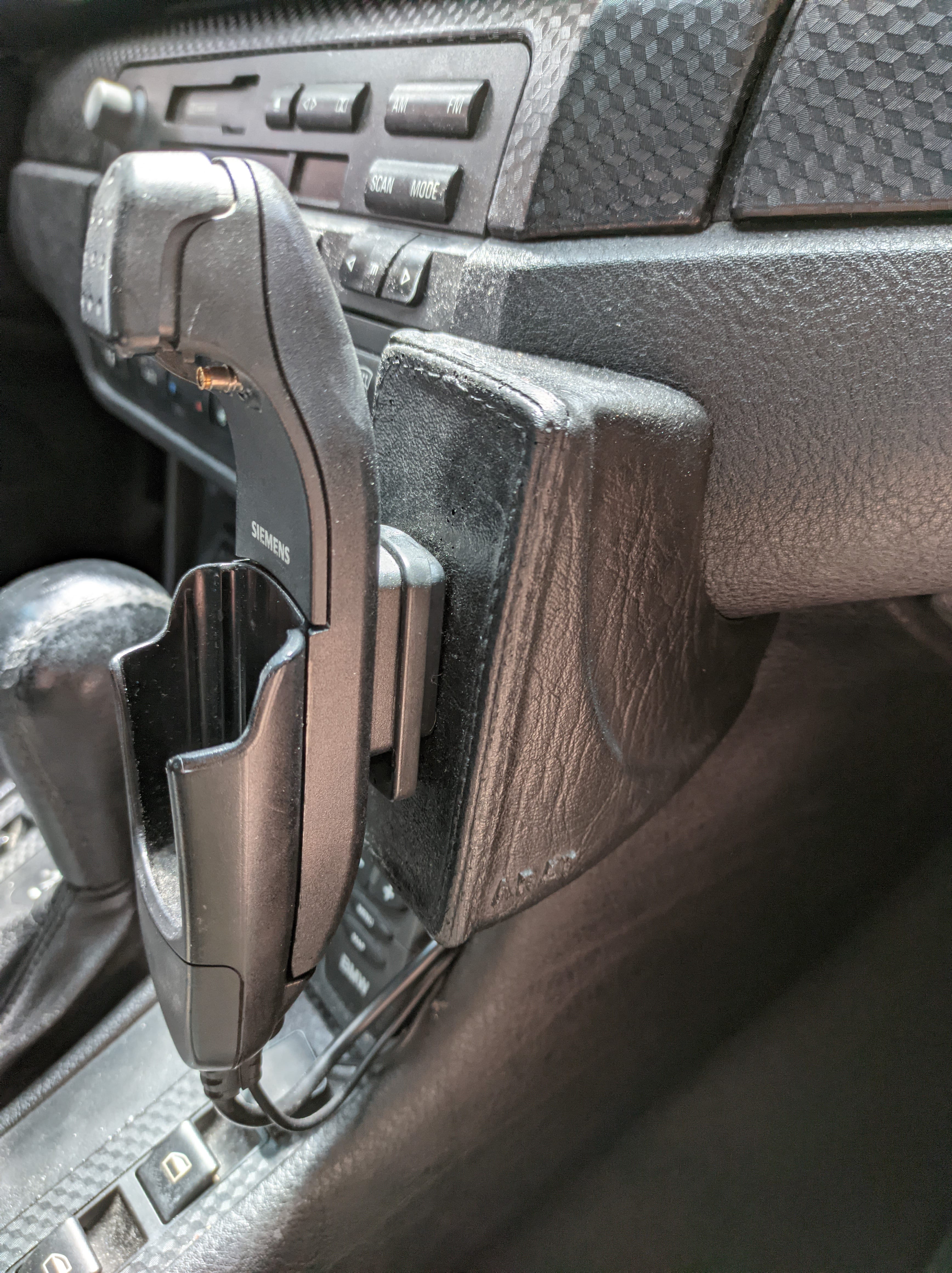 Zdravím, už dlhšie sa potýkam s menšou nepríjemnosťou v mojom aute BMW E46 320i 2001. Jeden z predošlých majiteľov si doň namontoval pravdepodobne custom držiak na telefón Siemens (nejaký starý model) prepojený so softvérom auta (pri naštartovaní sa na displeji rádia objaví text PHONE, čo znamená, že ho registruje; z držiaku vedie kábel do tlačidla prijímania hovorov upevneného na suchom zipse pri radiacej páke a dvojica káblov vedúca niekam hlboko za palubný počítač - viditeľné na fotke).