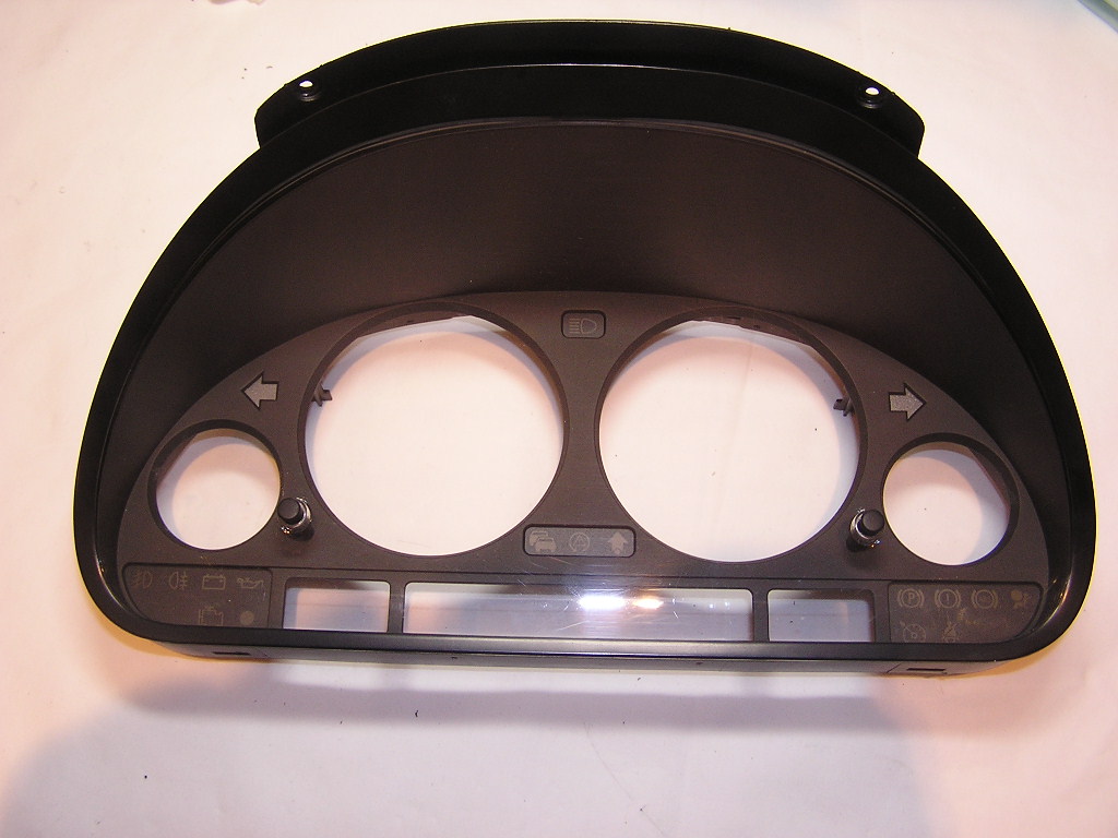 vzadu na budikoch najdi take "zapadky" v tvare pismena X. Je to cast predneho krytu. Tie vsetky musis pootocit tak, aby presne licovali s otvormi pod nimi (tiez v tvare x). Potom mas po obvode 4 zapadky - dva dolu, dva hore. Plochym skrutkovacom na nich treba zapracovat, najprv si povol vrchnu cast a trochu povytiahni, a potom spodok. Treba trochu cviku, aby sa to nevzpriecilo, zhruba povytahovat rovnomerne. Takym sposobom oddelis vlastne cely predny kryt aj s plexisklom. Do neho dostanes kruzky cez otvory na budiky zozadu, velke musis trochu ponamahat, aby vosli. Niektore sa daju nacvaknut a drzia, ale nie vzdy dostatocne, tak im mozes pomoct lepidlom. Potom ten predny kryt spojis so zvyskom budikov uz lahko, staci zacvaknut, nemusis sa uz starat o X-ka. Tie mozes nechat tak ako su. Na obrazku je predny kryt, ktory musis oddelit od zadneho.