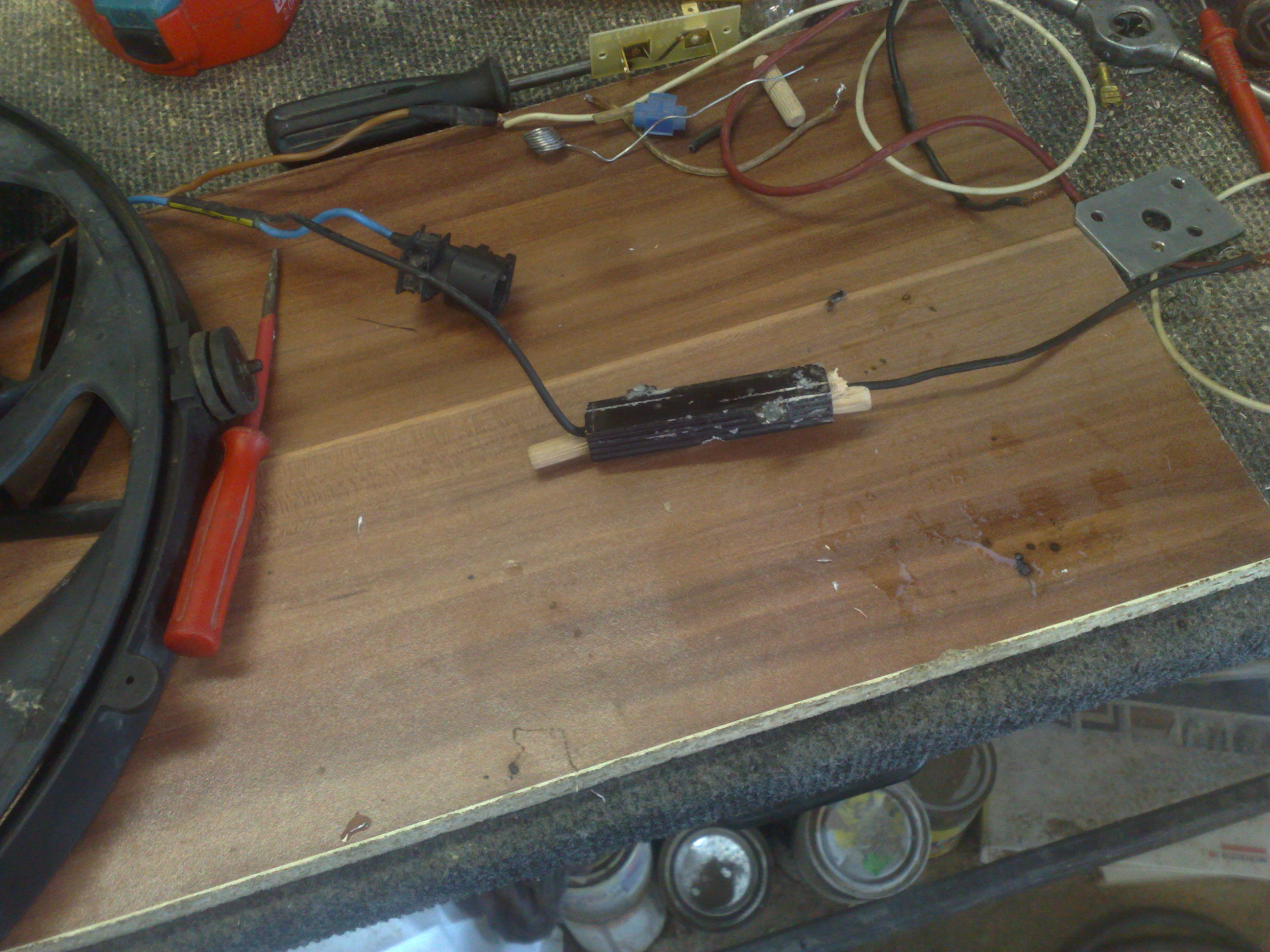 Dalej som sa pustil do toho odpora, skusal som to nejako nahradit, nejakým odporovým drôtom ale bolo to dost komplikovane, takže si hovorim najkor este vyskusam opravit ten stary odpor, aj tak už na nom nemam čo pokazit. Odcvakol som som kontakty pri koreni a na vyvrtal som dieru 8mm kolko islo, narazil som na nieco kurva tvrde, ani za svet sa cez to dostat hociakým vrtákom. Bol tam nejaky kov. Vyvrtal som aj z druhej strany a len tak som napojil z jednej aj druhej strany kable a vyskusal - islo to \:D/ Vyskusal som na priamo a to boli hned ine točny, tak som vedel že to reguluje. Odblankoval som kable na dlhsie zakrutil a dreveným kolikom ich tam pricvikol z oboch stran. Zalepil silikonom a prelepil páskou. nahodil a vsetko funguje. Po zapnutí klimi sa asi po 20s roztoči ventilator na malu rýchlost a nevyhodí poistku, konečne \:D/