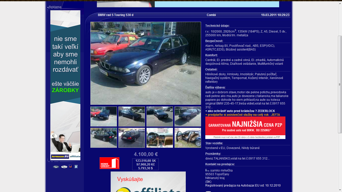 Mal som o toto auto záujem, ale nakoniec skutočnosť, že auto nemá vyhrievané sedačky ma donútila nad kúpou uvažovať. Pred týždňom visel na abeu inzerát s cenovkou 4 000€ bez špz. Momentálne zmenil inzerát majiteľa a auto sa už predáva za 5 000€ so SK dokladmi. Ako všetko by bolo v poriadku... niekto auto zobral a chce na ňom zarobiť, ale zase vec, ktorú by som vypichol :D je, že národ slovenský sa opäť nezaprel. Minulý týždeň stav km 255 000 a momentálne už len "poctivých" 175 000 ...