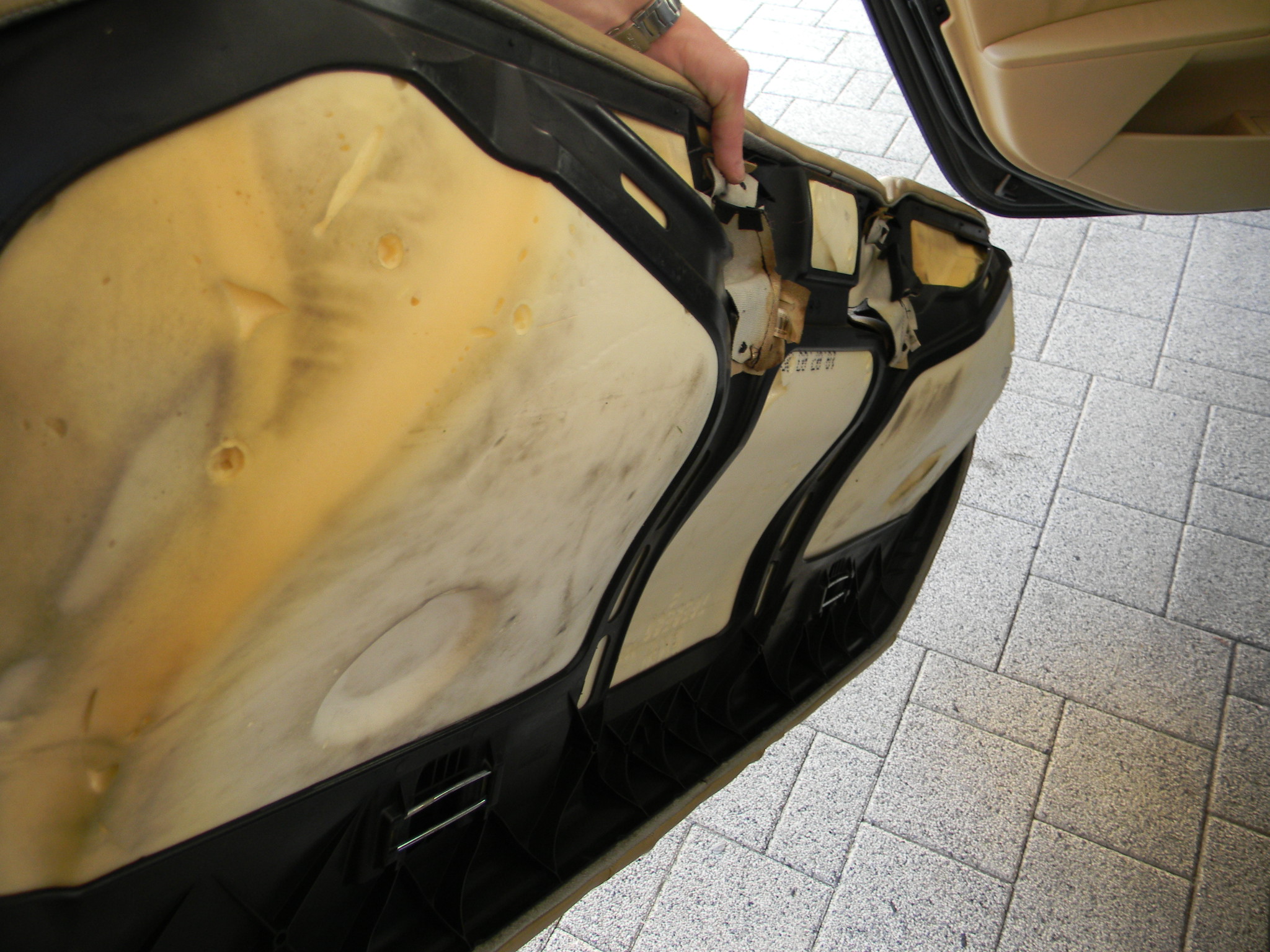 Je uchytená 2 úchytkami, "puk puk" a môžete ťahať. Pozor na zásuvky pásov, treba ich opatrne vtláčať do vnútra, sedačka je potom voľná.