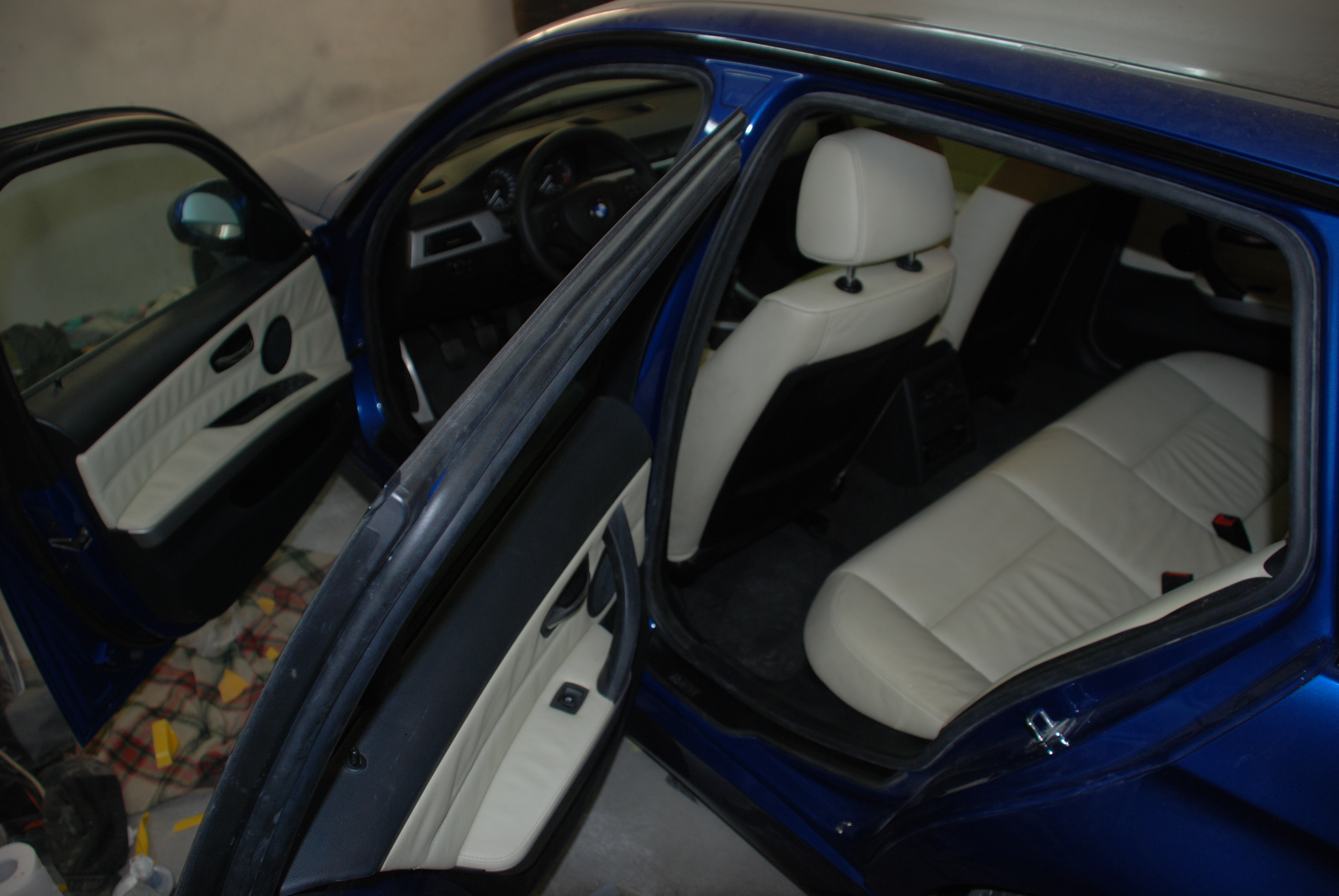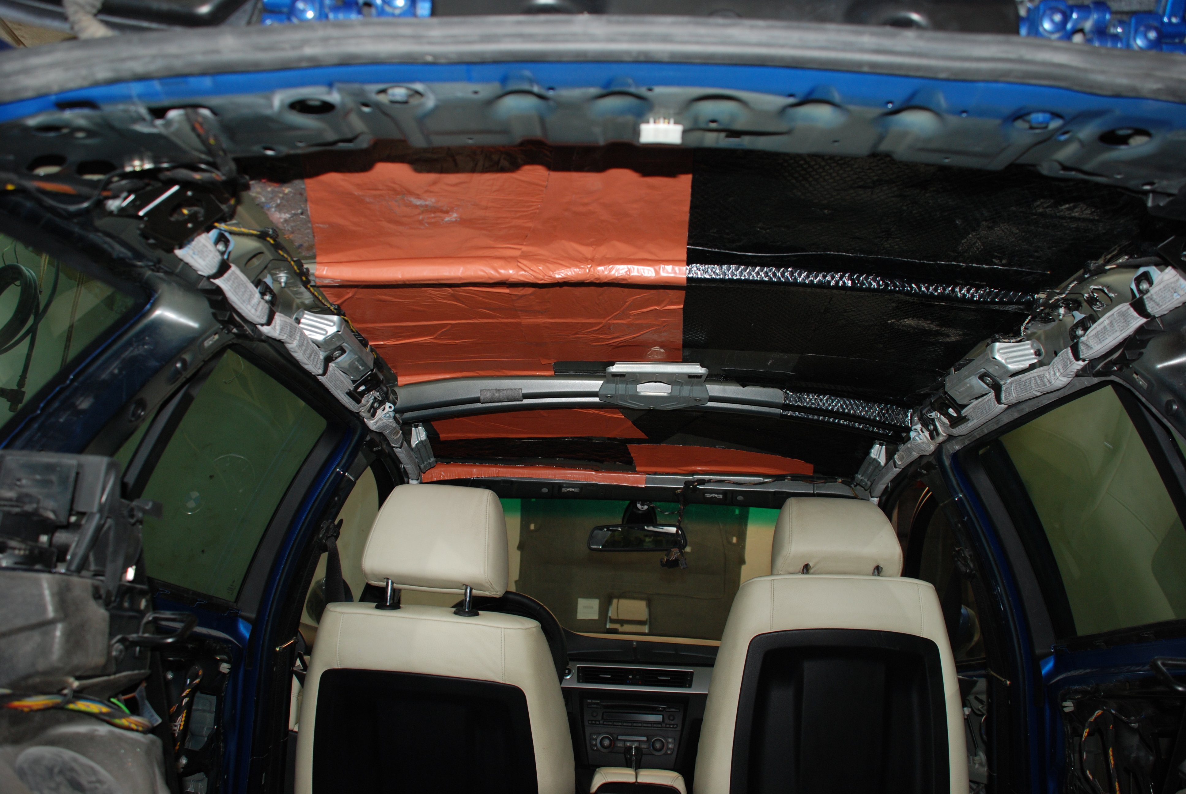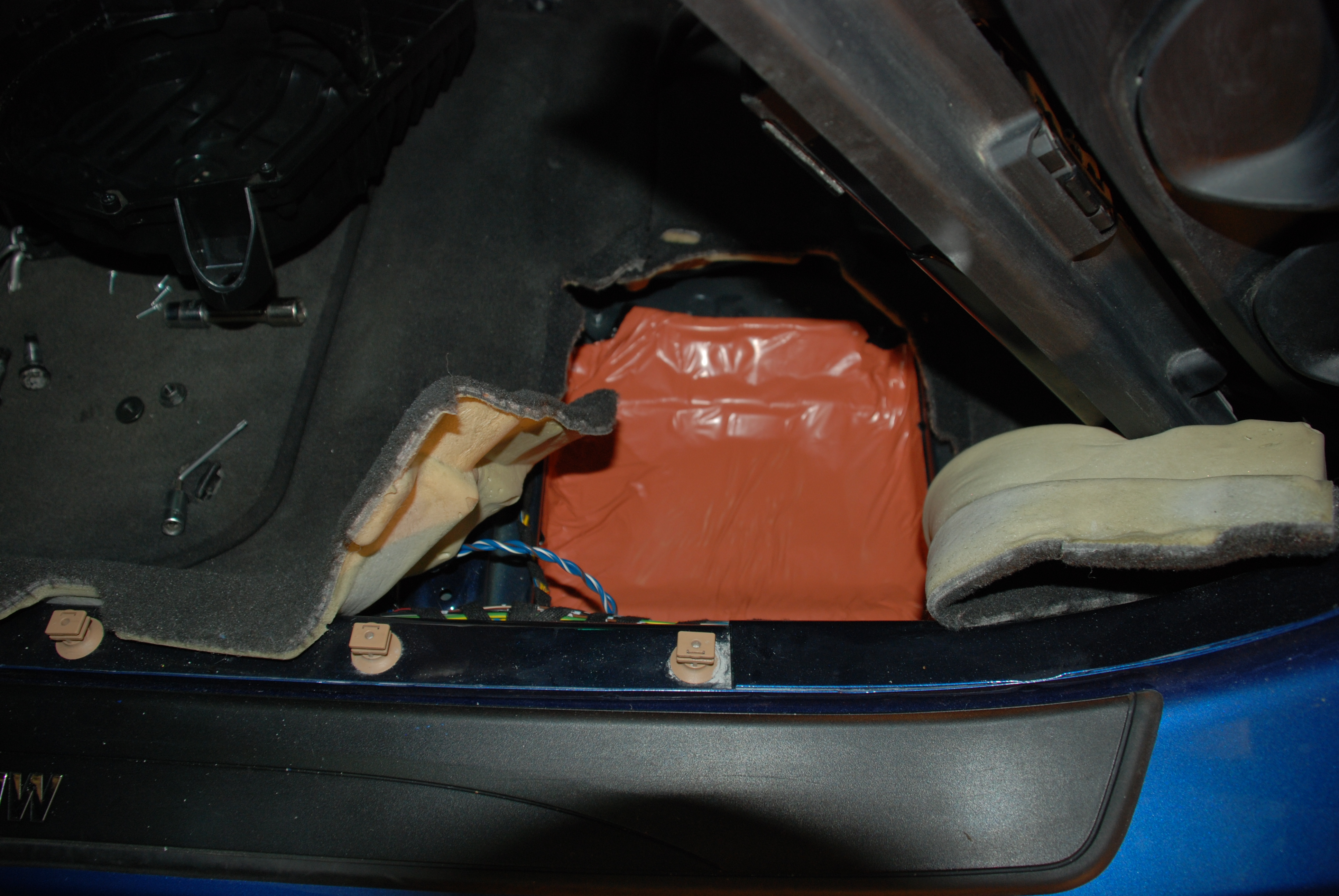 Dělalo se na interieru. Když už byly všechny plasty dole, rozhodl jsem se polepit plechy tlumícím materiálem - bitumenem. Nesnáším rezonující plechy, taky to auto hned lépe zní když na něho zaklepete :D No a v neposlední řadě to lépe hraje, když jsou dveře, podlaha a strop vytlumeny. Na strop přišla vrstva Vibraflexu, ten mi pak došel, tak na druhou vrstvu a zbytek auta jsem pořídil jiný výrobek, sice ne tak tlustý a pevný, ale zato výrazně levnější. Vytlumil jsem i ozvučnice subwooferů pod sedadly. No a pak se skládaly plasty, sedadla, tapecy, stropnice atd :)