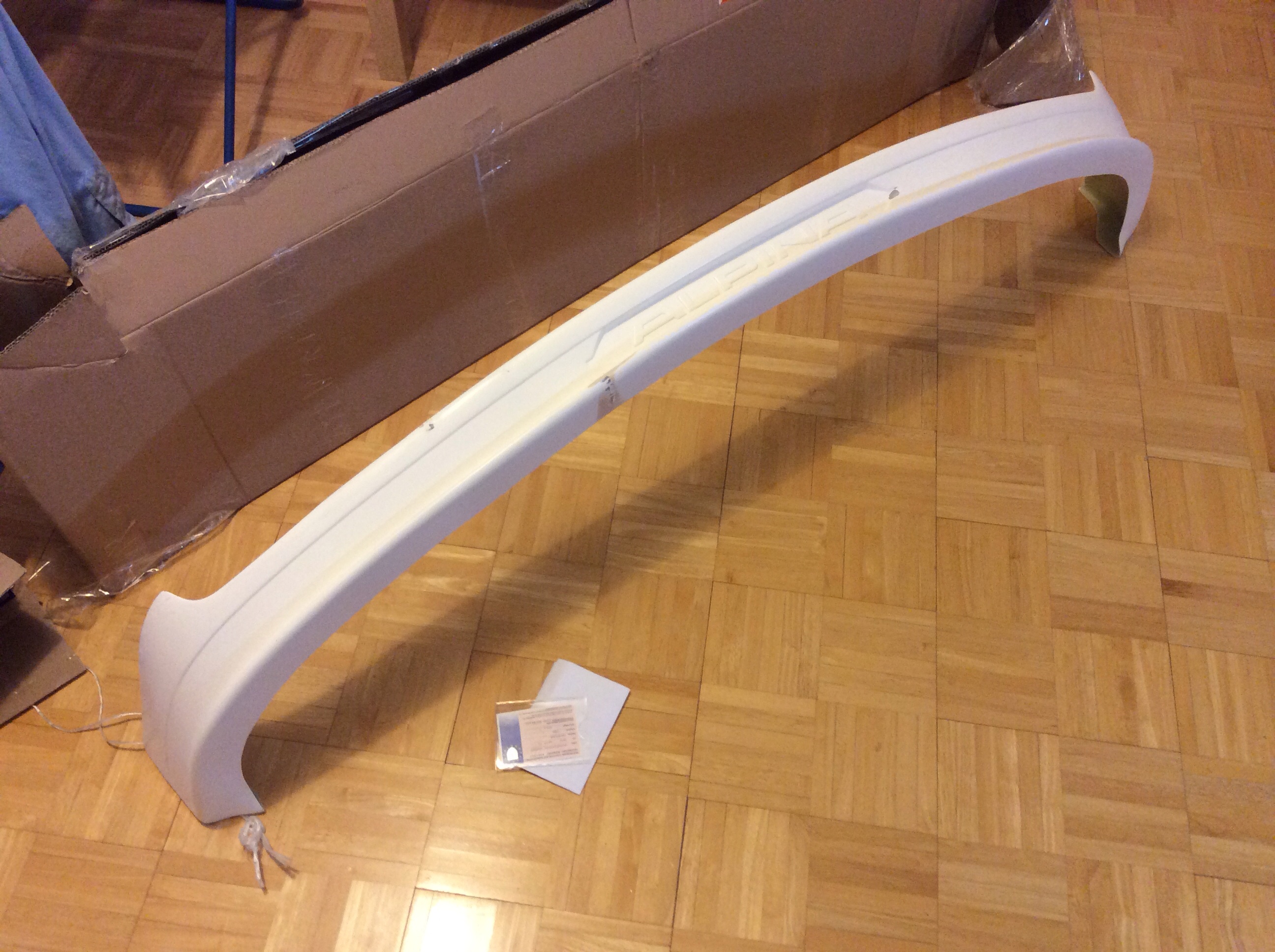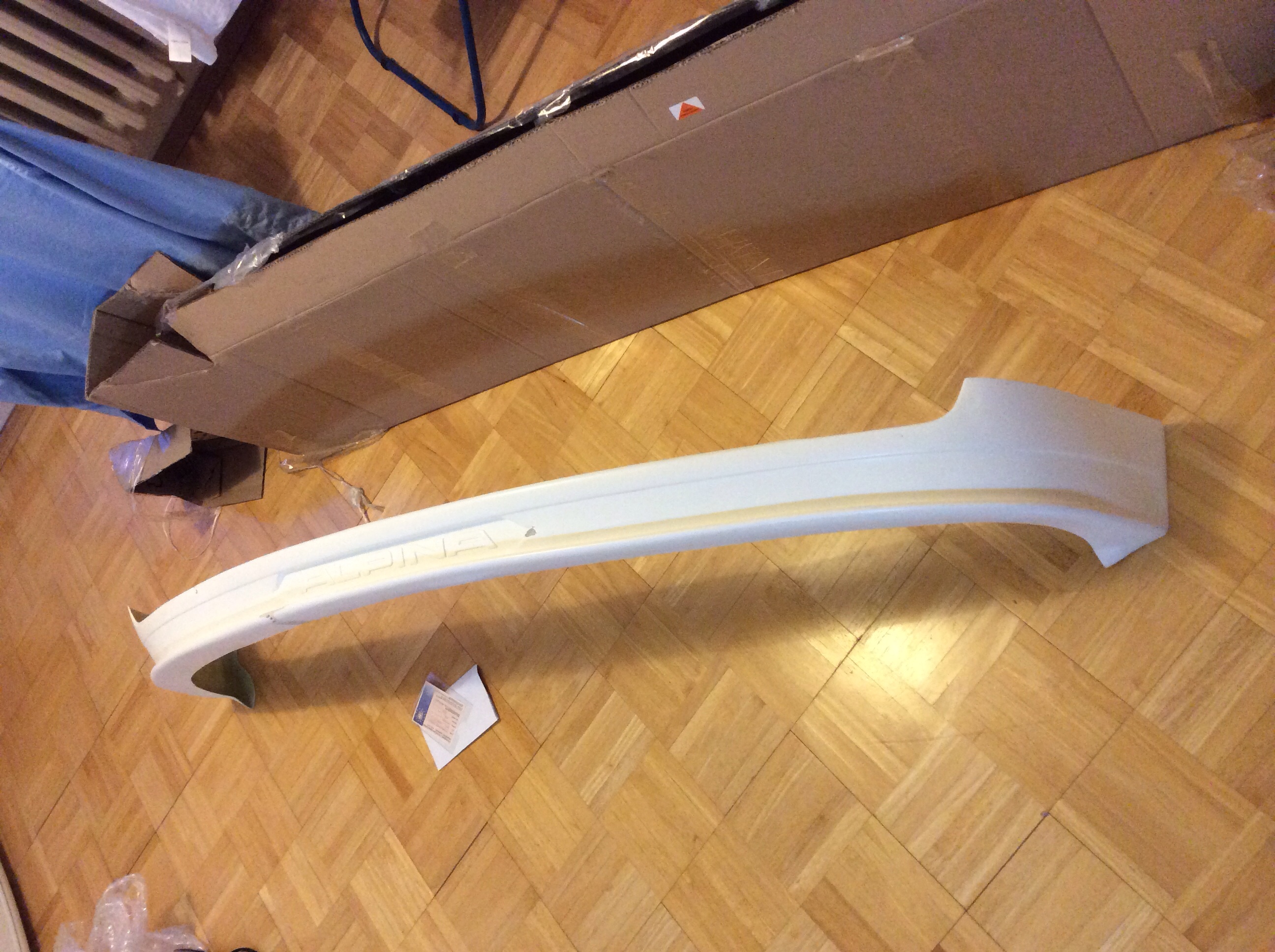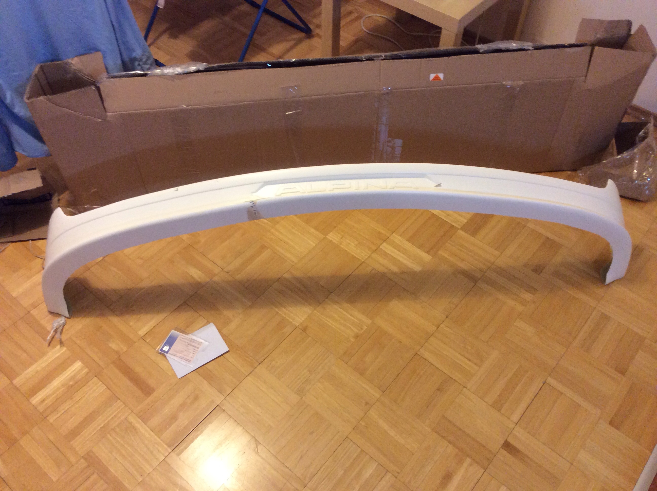 Rozmýšlal som že dám mpacket predný nárazník na leto, ale nakoniec som skončil po vzhliadnutí pár e46 príbehov u alpina predného podnárazníku. Je to laminátová replika od severných susedov, preto sa s ňou bude treba trochu pohrať než pojde na auto. Momentálne je odstavená za gaučom.