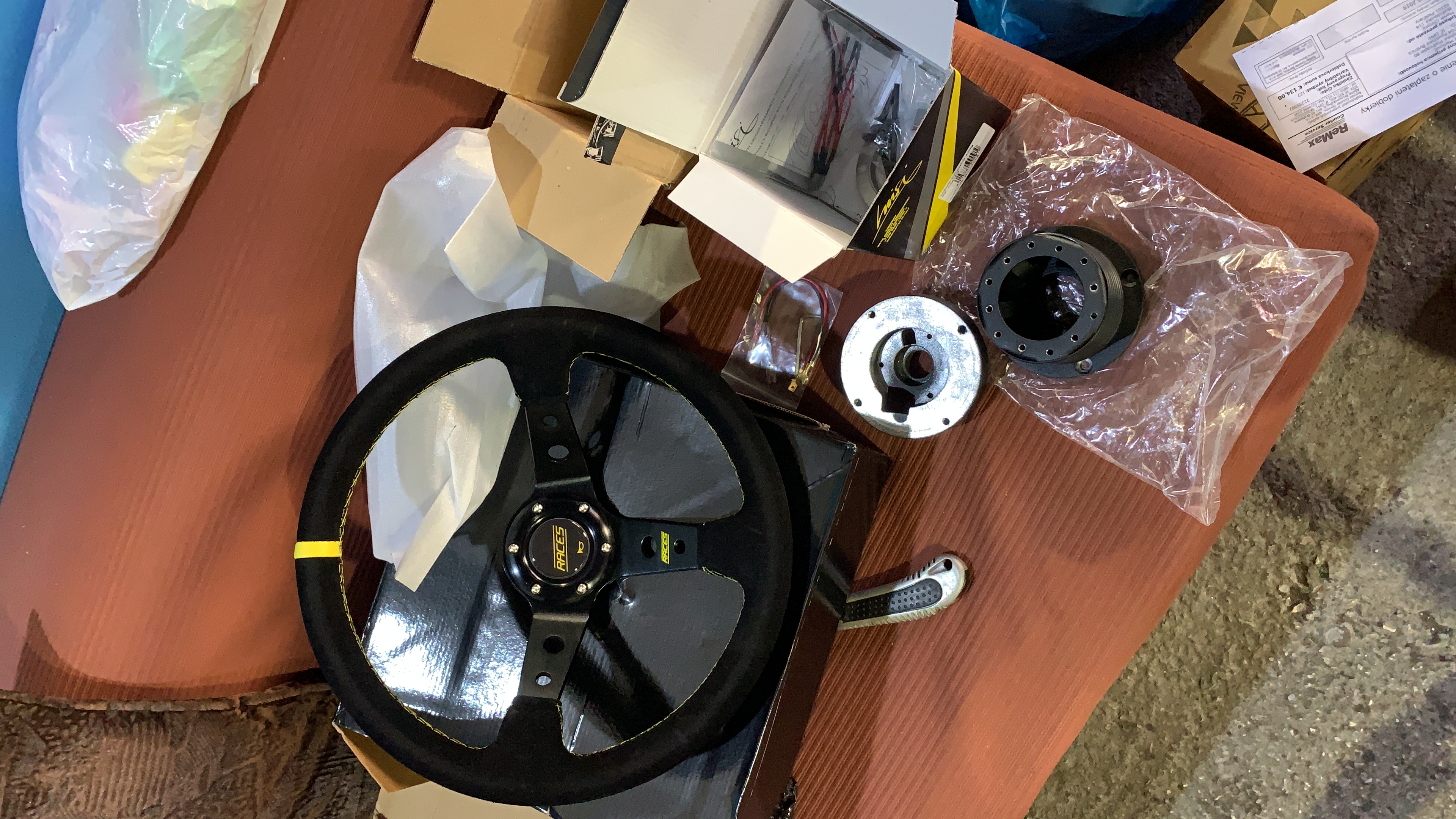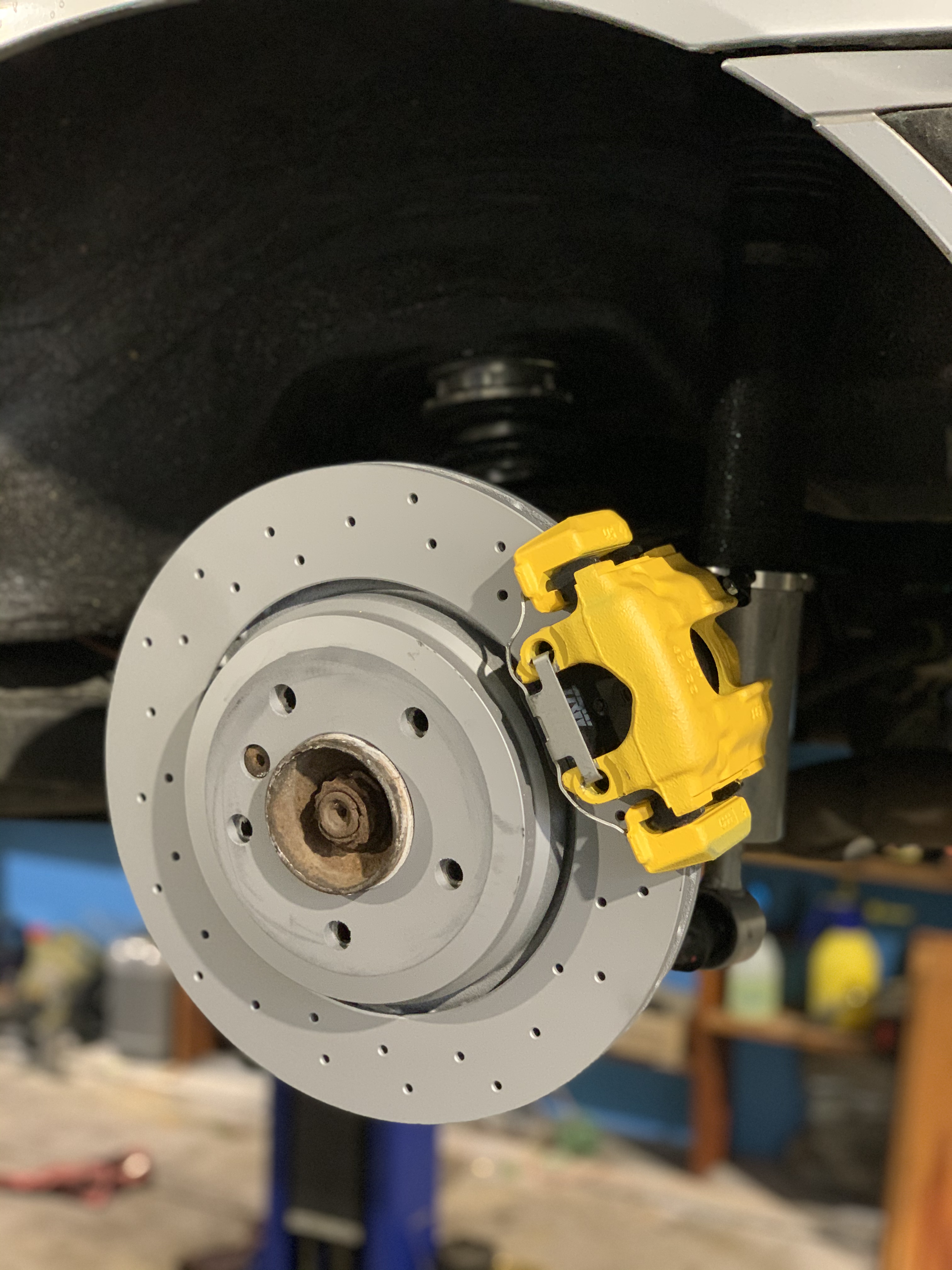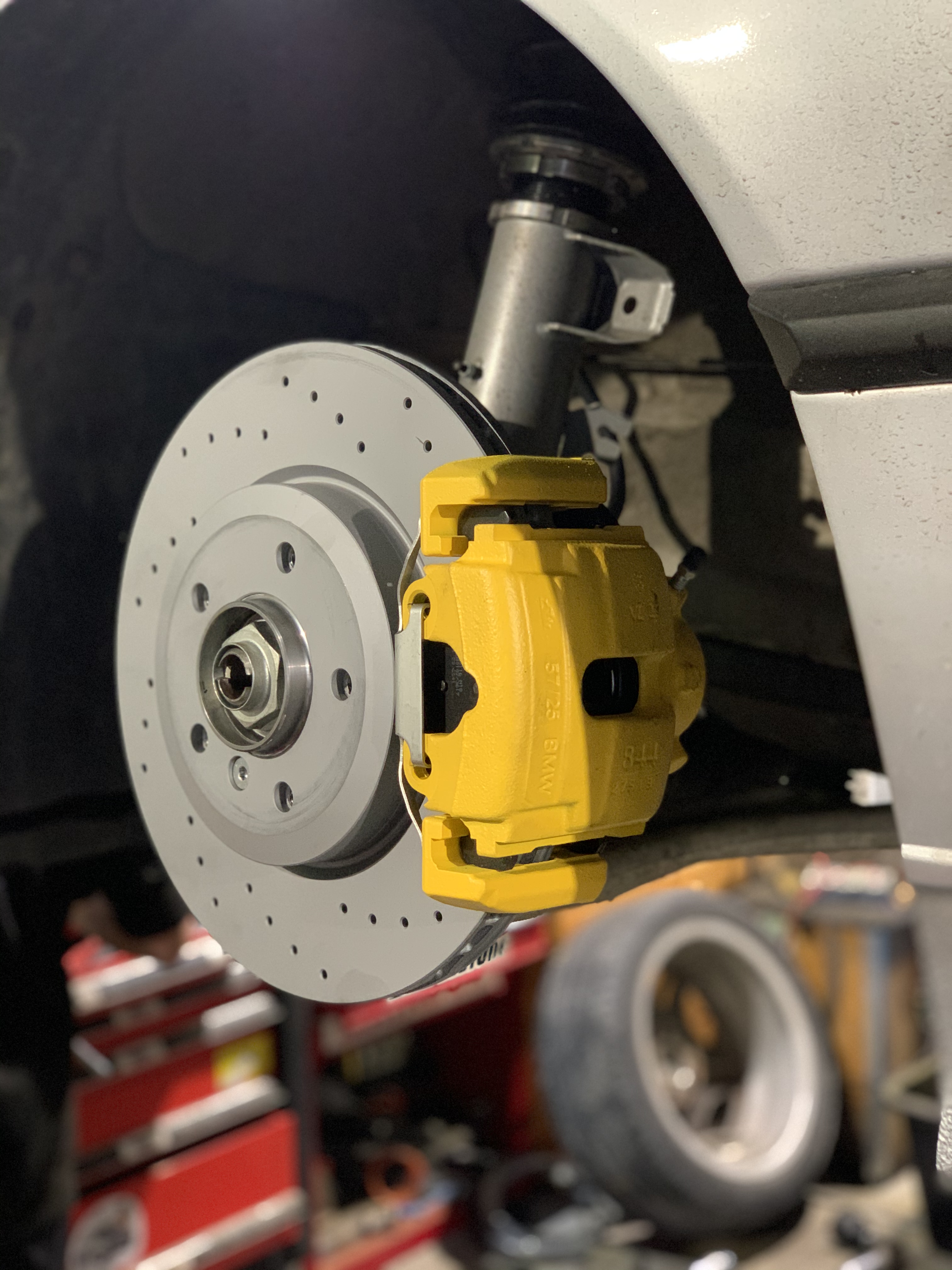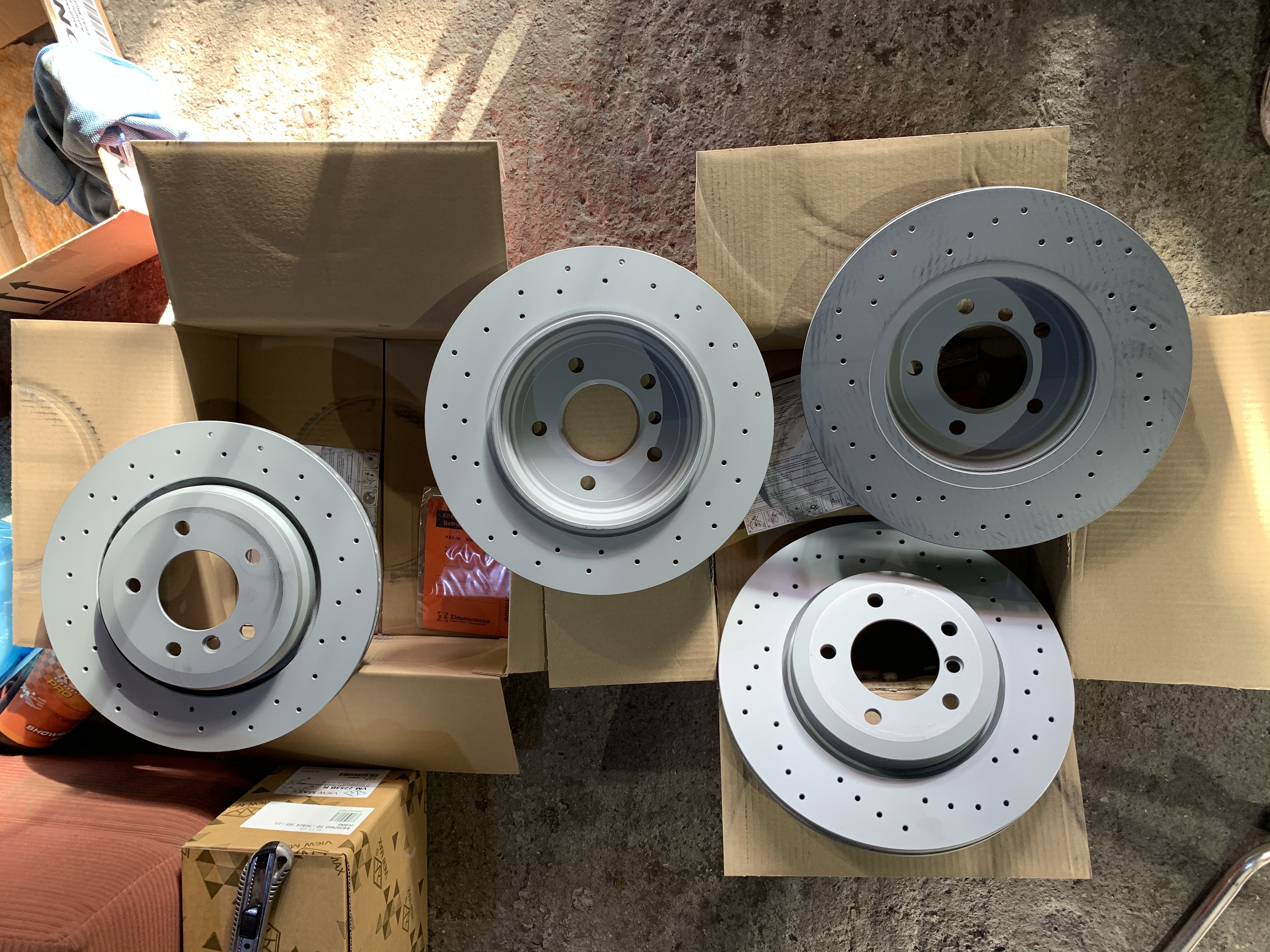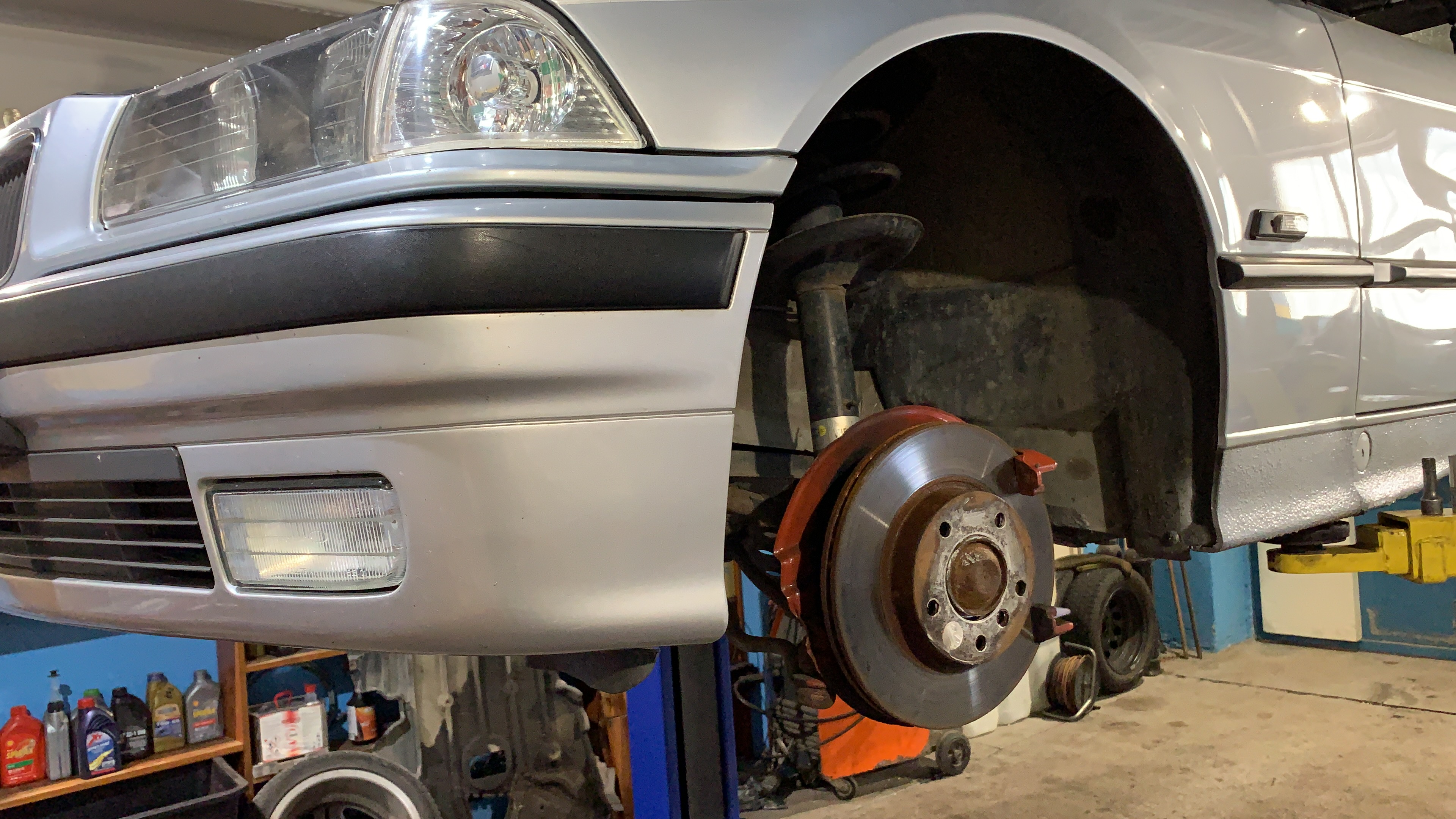 Pri naťahovaní brzdových potrubí som sa rozhodol objednat nové kotúče a platničky z 330d zimmermann pretože tie origo brzdy boli zúfalo slabé.... Rovno som teda zohnal aj strmene ktoré som dal opieskovať nastriekal som ich a kompletne zrepasoval aby boli brzdy skutočne od nádržky po kotúče nové :D a rovno sa s tým spojila výmena predných ložísk s nábojmi. Medzičasom prišiel aj nový volant, doma v garáži som vyhrabal starú sedačku aby som mal dočasne niečo lepšie ako ten “babkin gauč” čo tam bol origo :D