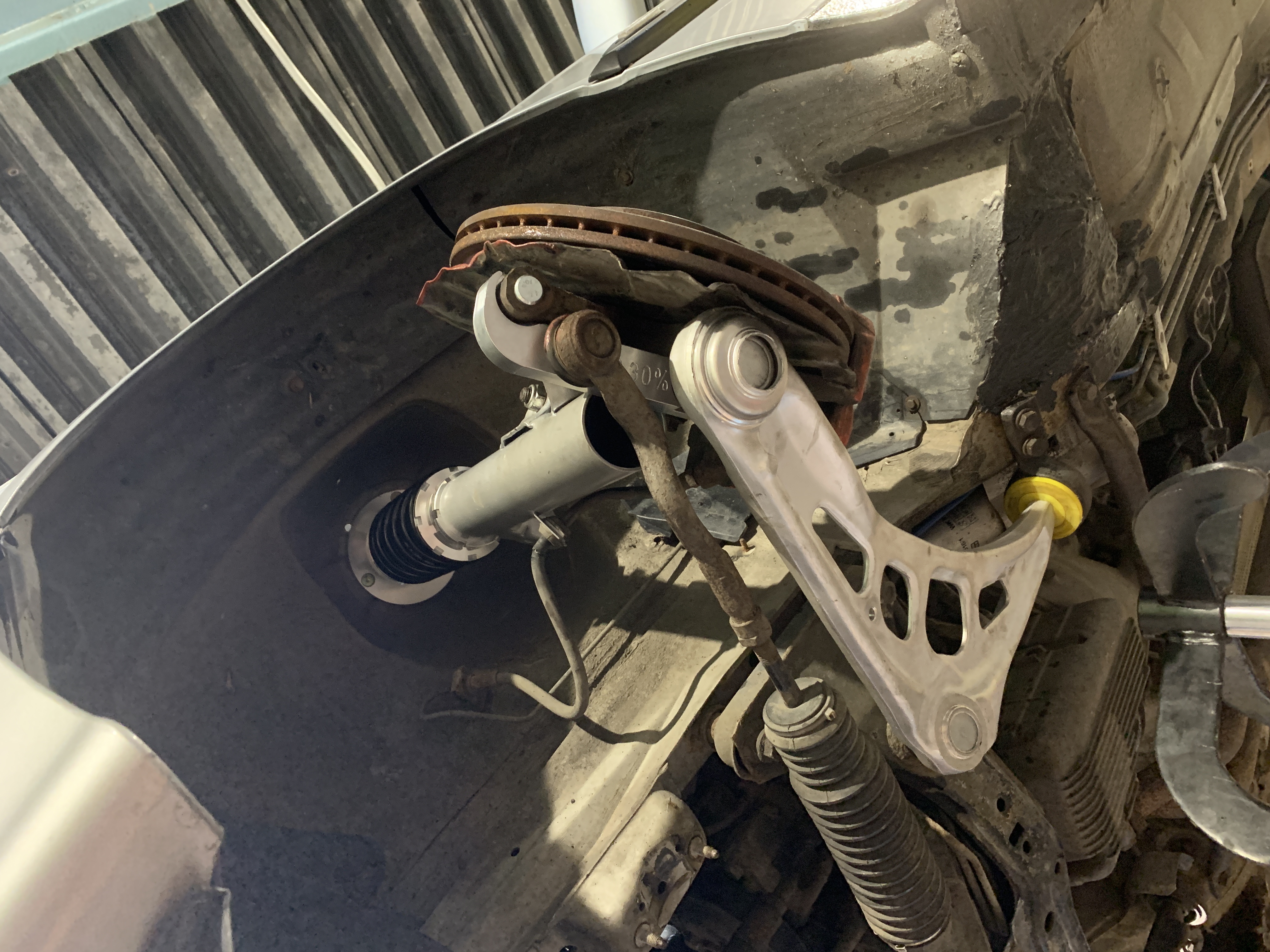 Ďalším krokom bola predná náprava ako som už spomínal rajdy ramena nové tyčky plus čapy riadenia tlmiče strogflex na riadenie plus sa mi podarilo zohnať strongflex silentbloky ramien ktoré majú vnútorný priemer e46 ramena a vonkajší pasuje do e36 uchytenia :)