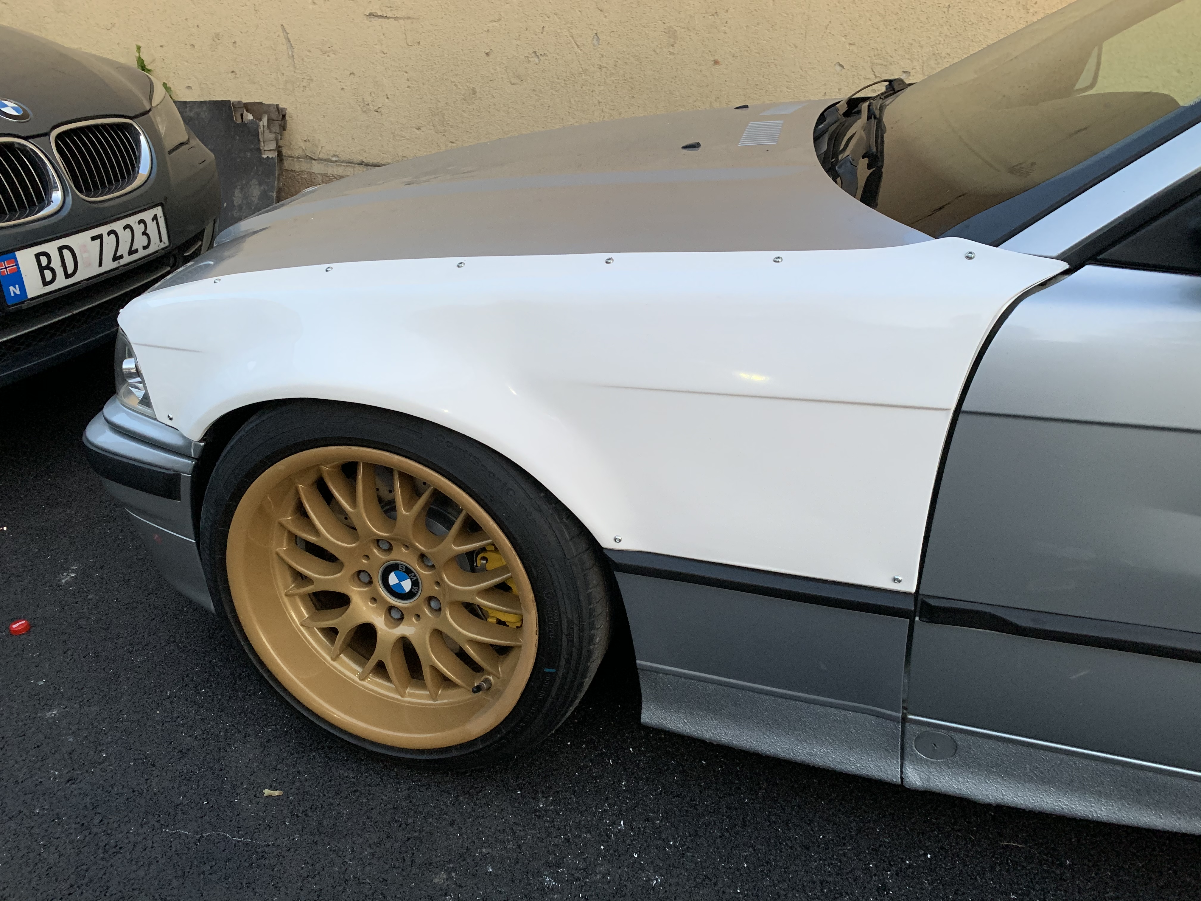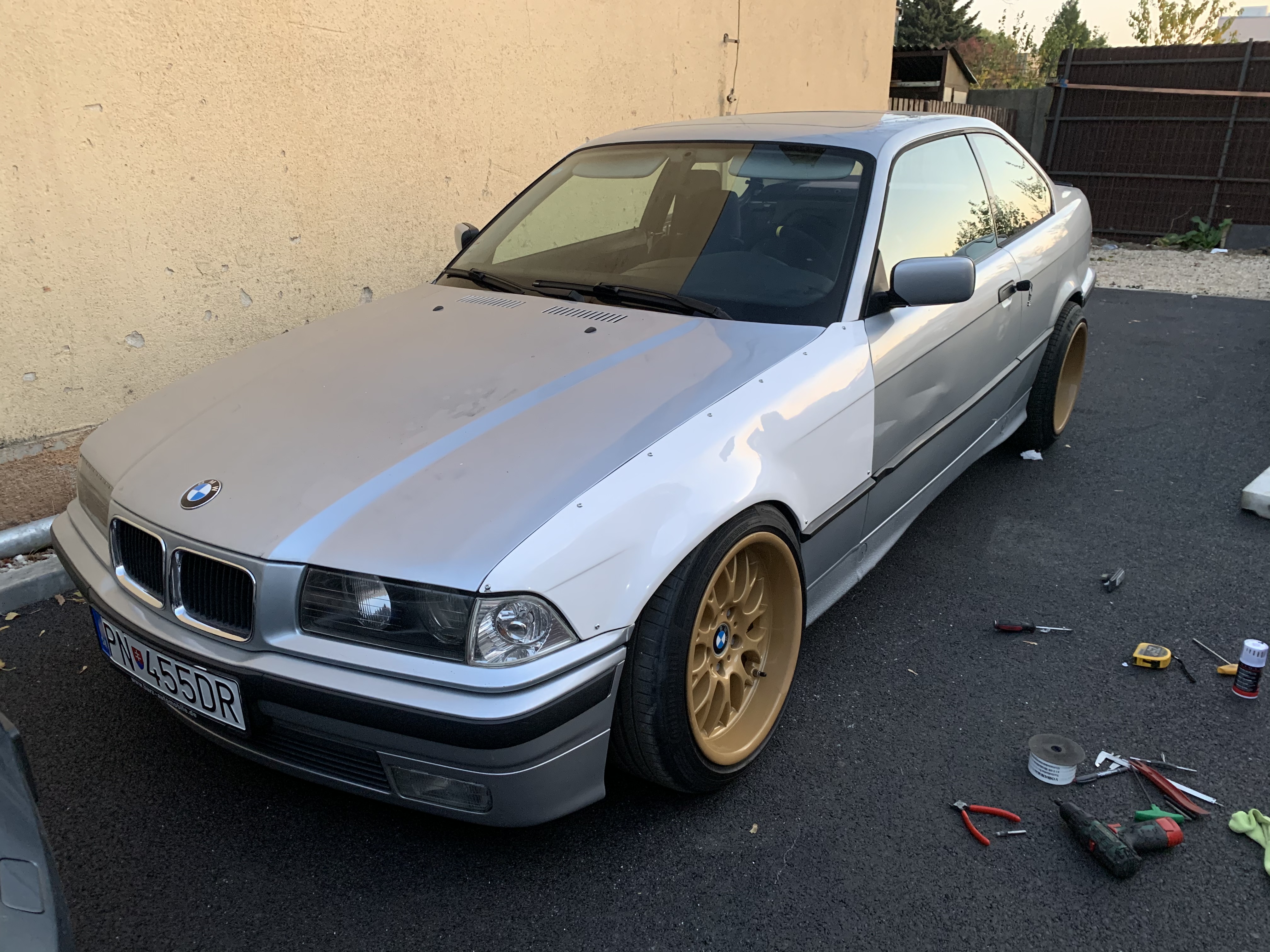 Najnovšie prišiel laminátový fender kit ktorý som už našroboval na auto nech sme trochu širší a môžeme páliť aj väčšie pneu :)) motor bol prvý plan kúpiť M50B25 a oturbiť ju, po spočítaní nákladov a premyslení čo všetko s tým treba bol plán B kúpiť m62b44 bezvanos, no po čase hľadania som zistil že je to malo muziky za veľa peňazí a po oturbeni dostanem výkon cca motoru LS1 5.7L V8 small block z Corvette c5 tak som zháňal zasa ten a už keď som ho skoro zaplatil som natrafil na inzerát: predám m50b25 prevŕtaný na 85mm oturbený, krátke piesty, komplet po repase hlavy, oturbený so všetkými chladičmi, výfukom, elektronikou atd proste komplet. Motor som mal možnosť vyskúšať ešte bol v aute a po skúšobnej jazde mi bolo hneď jasné že toto je to čo potrebujem :))