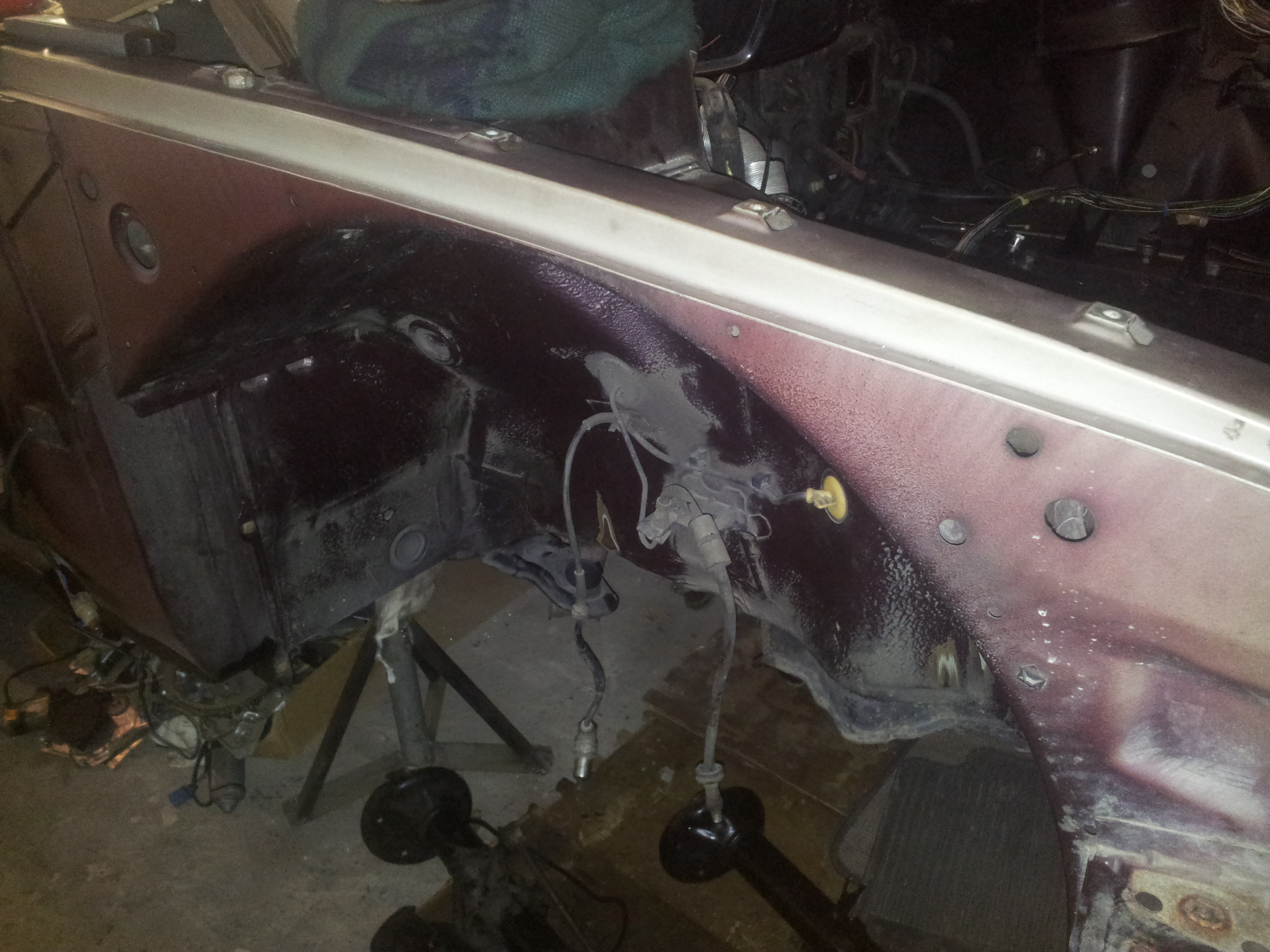 Cez vikend som sa pustil do zadku kde som osetril miesta kde nam nieco zacalo prekvitat. Obrusil na zaklad dal som nejake vrstvy zakladu potom vrchny nater a cele som to pretrel gumoasfaltom. Tento postup caka komplet cely podvozok no najprv ho musim zbavit vrstvy bahna ktore tam ostalo.