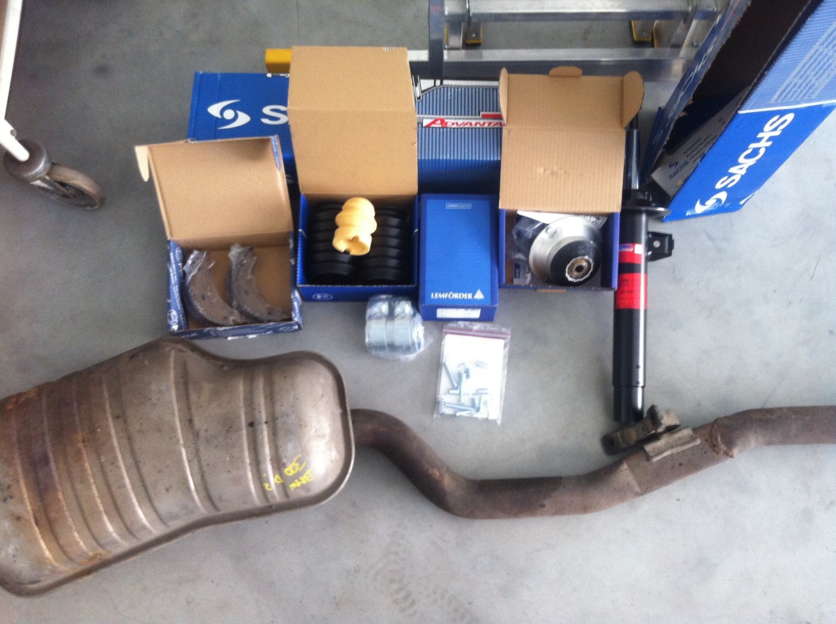 Proběhla konečně výměna předních tlumičů i s horním uložením, výměna výfuku, komplet keramický brzdový destičky, pakny na ruční brzdu, zadní rozpěra mezi tlumiče, která funguje výborně a ještě mě čekají nasadit nějaký plastíky na podvozek, hardyspojka a uložení kardanu, vše už mám koupené