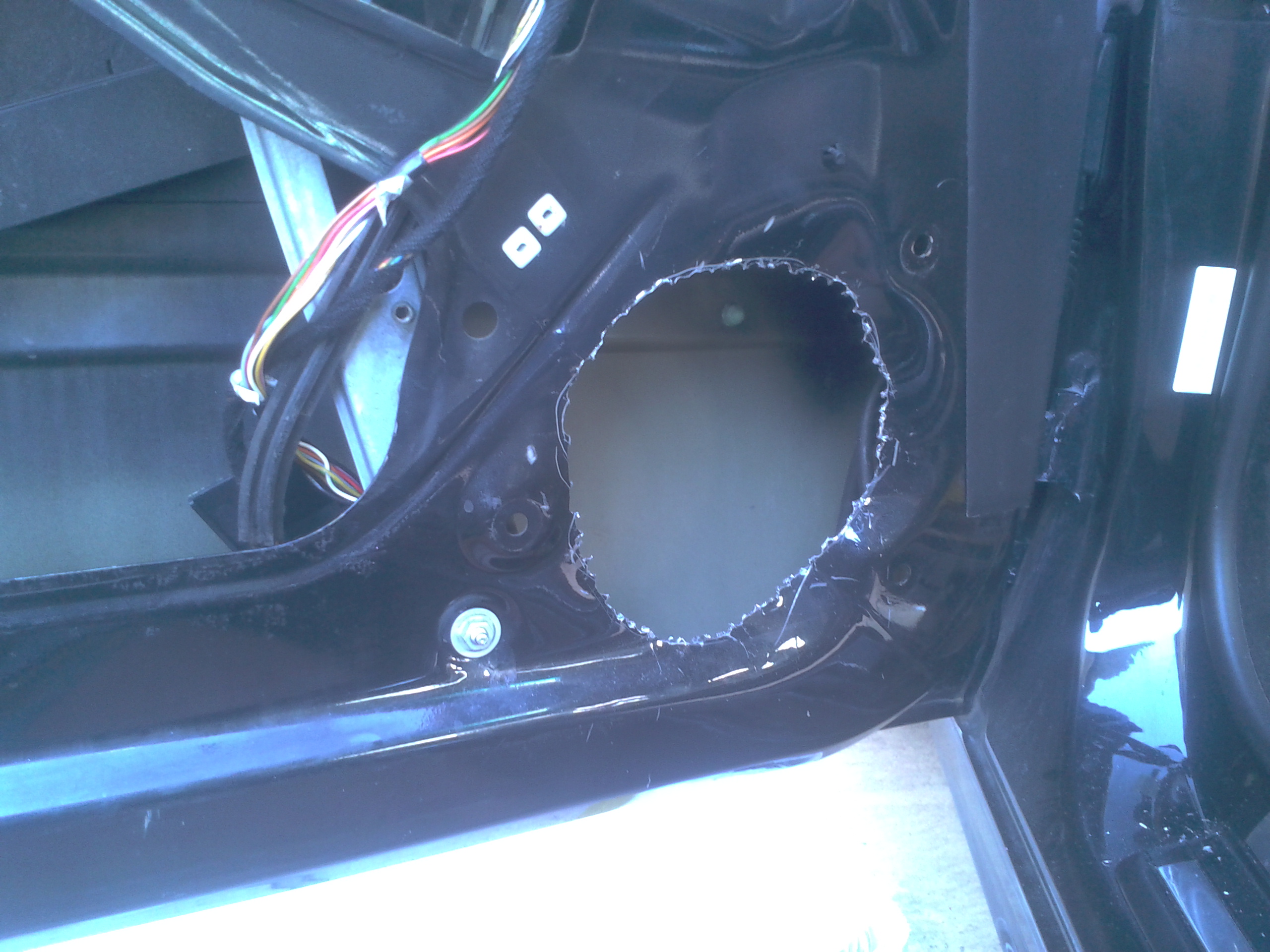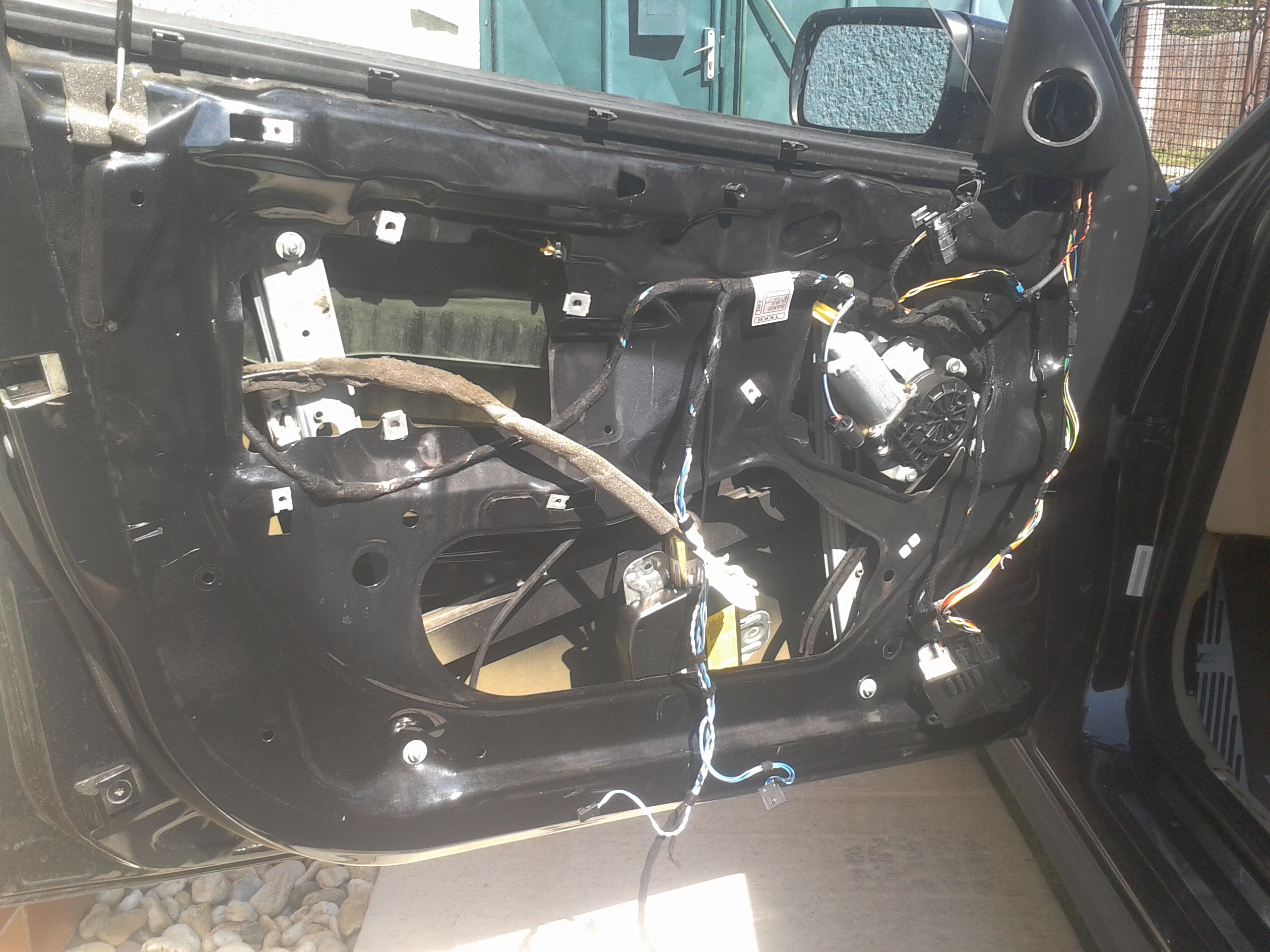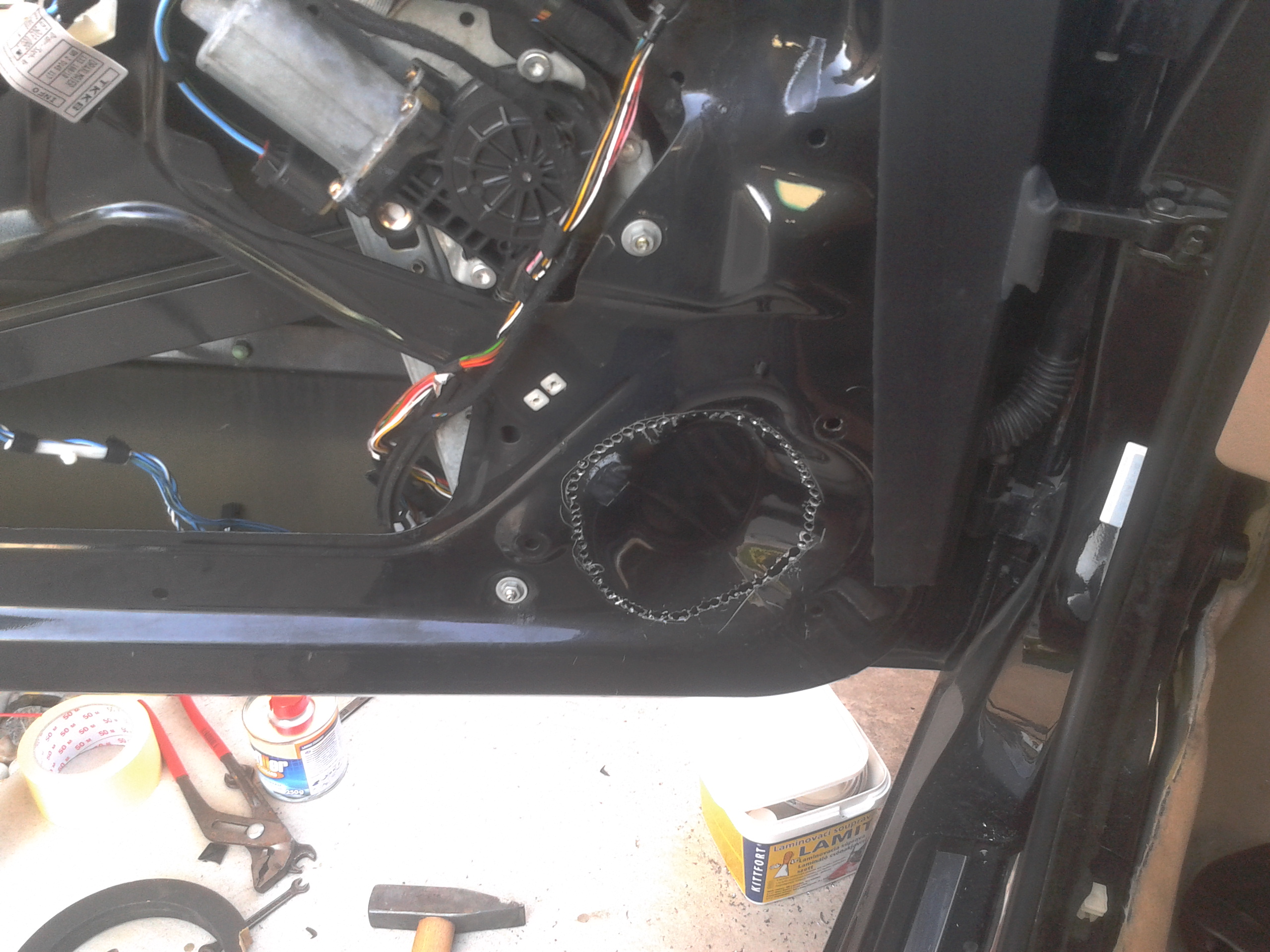 Rozobral som vodičove dvere, začal som vymenou kociek, stare sice ešte fungovali ale boli prasknute. potom som vyrezal otvor na reprák, z laminatu vyrobil "zaslepku" koli uzatvoreniu dverí. potom som ťahal kable do dverí, podarilo sa mi "upraviť" prechodku tak že to tam vliezlo na chlp, čo ma potešilo lebo sa mi nechcelo rezať koli novym prechodkam. Ale bolo to tak na tesno že sa mi tam nezmestili ani chraničky na kable. potom som ešte stihol vytlmiť vonkajší plech...