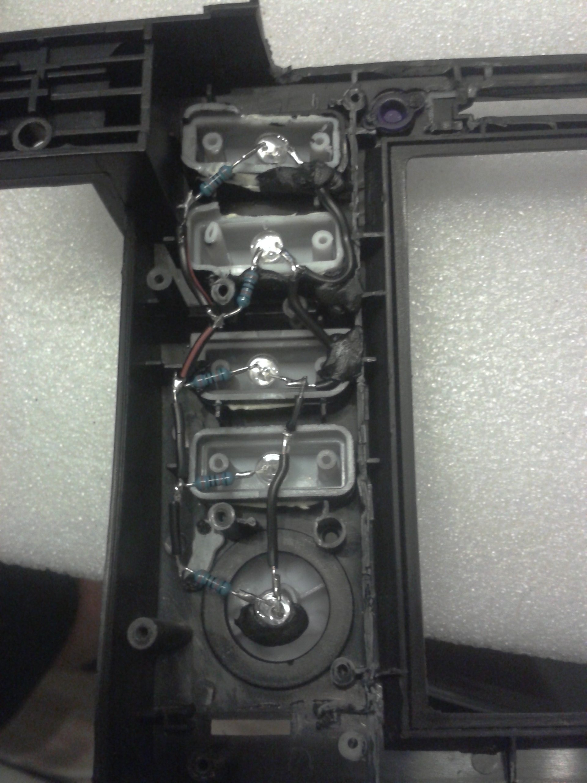 tak dnes som sa pustil do osvetlenia tlačitok (aj keď už to tlačitka niesu). Kúpil som ledky a k tomu odpory a začal s pajkovaním. Z vnútra to vyzerá strašne nakoľko som musel z toho ramika riadne zrezať aby som tablet dostal tam kde má byť a nebol príliš vzadu.