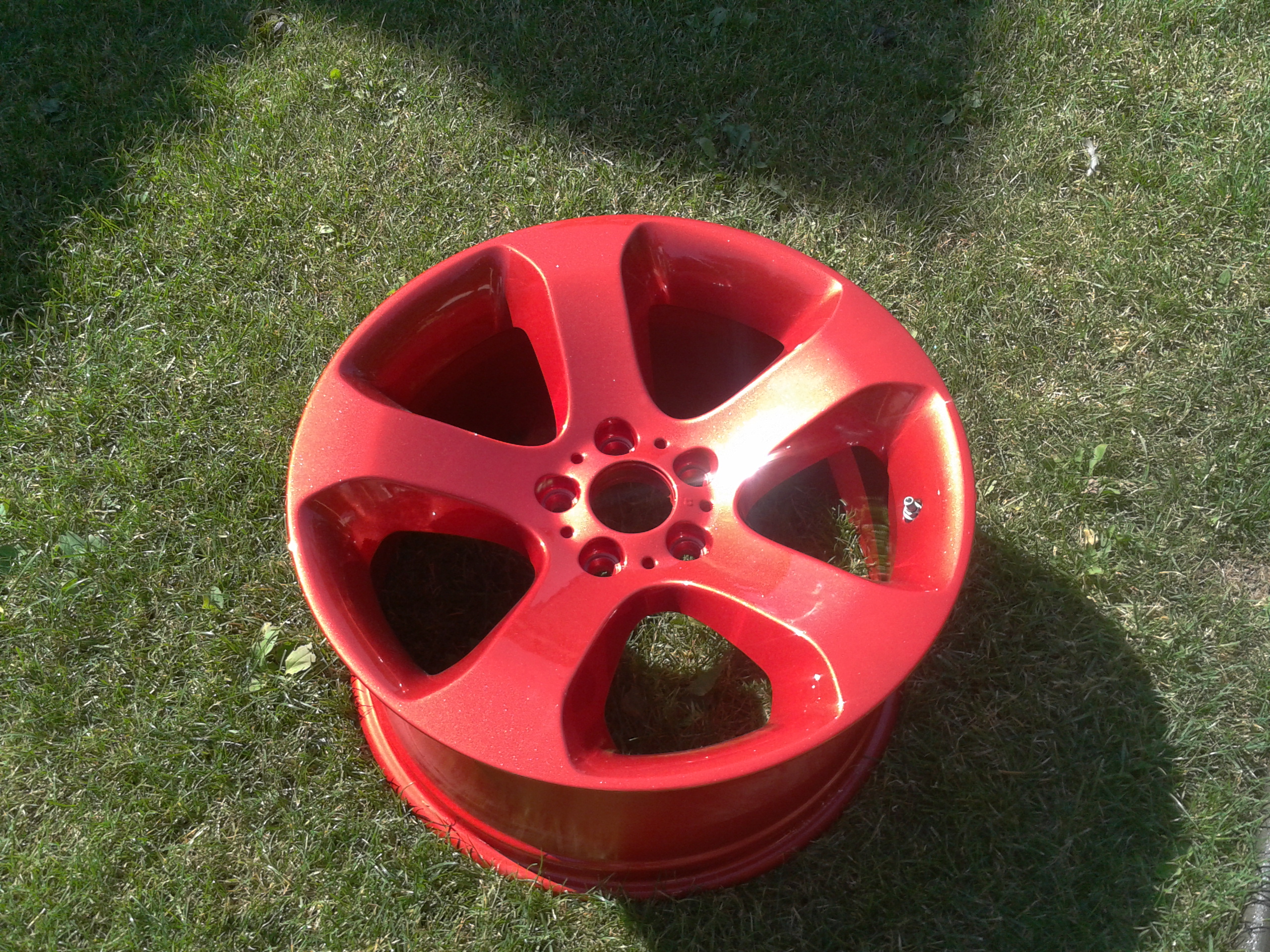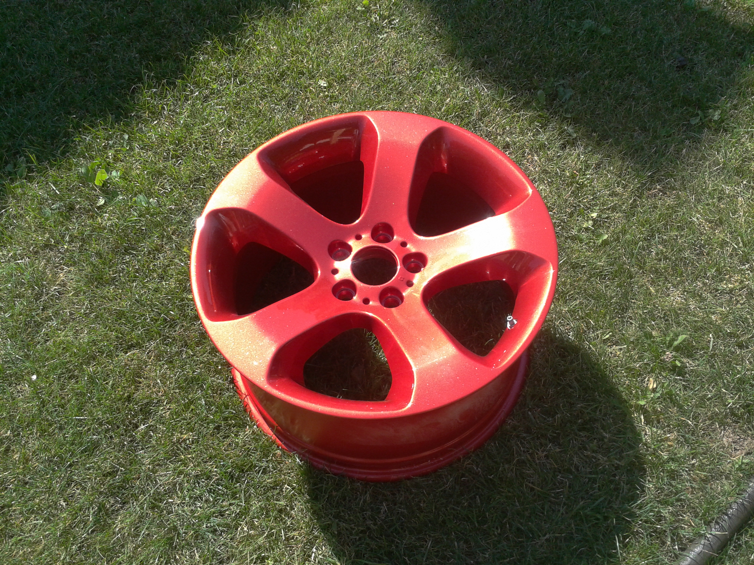 No a konečne v piatok boli hotove kolesá. Pôvodne som chcel bordovú metalízu, ale ked som prišiel za lakernikom a začal si vyberať farbu akosi som zmenil názor a vybral som cerveno-oranžovo-hnedú metalízu plus navyše metalické zrnká do laku. Celú dobu som sa bál čo z toho bude ale ked som ich zbadal a hlavne na slnku tak som skoro padol na zadok. V reale vyzerajú neskutočne, škoda že telefonom som to nevedl odfotiť. Celý natešený som ich chcel v sobotu obuť, ale akosi som pozabudol že bol sviatok, tak z toho nič nebolo. Cez týždeň to musím spáchať