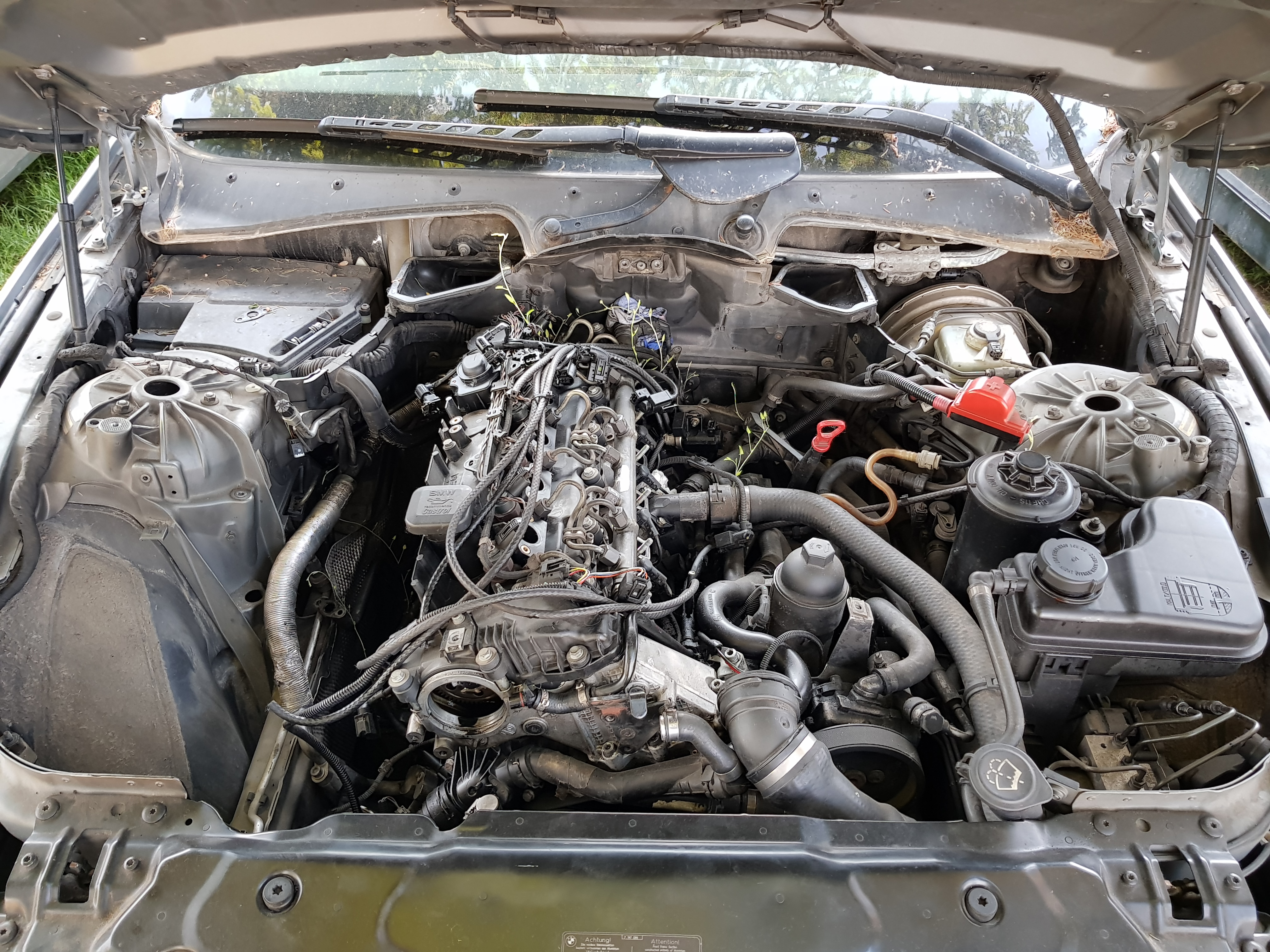 Klíma kompresor som horko-ťažko vykrútil okolo starého motora. Na novom turbá nepustili a tak som sa musel rozlúčiť s náplňou, ktorú som potom nedobrovoľne fetoval, zas o krok bližšie k rakovine (neviem či predtým šlapala klíma, tak ma to až tak moc nebolelo). Najťažšia časť bolo nasmerovať nápravnicu na svoje miesto, na to som potreboval 2 majstrov, prvý púštal zdvihák, druhý držal tlmič aby vošiel do blatníka a tretí sa jebal na zemi pod autom a tlačil kus hliníka aby trafil svoje miesto 😂 Ale je to done, takže asi najhoršia časť je zamnou. Štvrtý klinec do rakvy prišiel keď som zistil že nemám podložky ani gumičky na vstreky, asi som to medzičasom niekomu namontoval. Takže tu som skončil, nahádzal som späť konektory, brzdy, volantovú tyč, motor som zaprel špeci kajlíkom (prípravok č.57, btw pasuje aj na e39 😂) o nápravnicu ako bol aj doteraz zapretý a auto poputovalo späť von. Aspoň sa pokosila tráva pod ním. Zostalo tam toho ešte dosť - naložiť vstreky, veko ventilov, alternátor, sanie, plasty, vyčistiť vodný chladič + IC, atď, atď. Venoval som tomu celý deň, aj tak sa s tým až tak veľmi nepohlo ale aspoň niečo. Pokračovanie možno vo štvrtok, ak nie tak v sobotu. Zo starého motora sa popredali nejaké veci, zostalo toho ešte dosť, sumár čo to stálo šecko si dáme keď bude auto hotové.