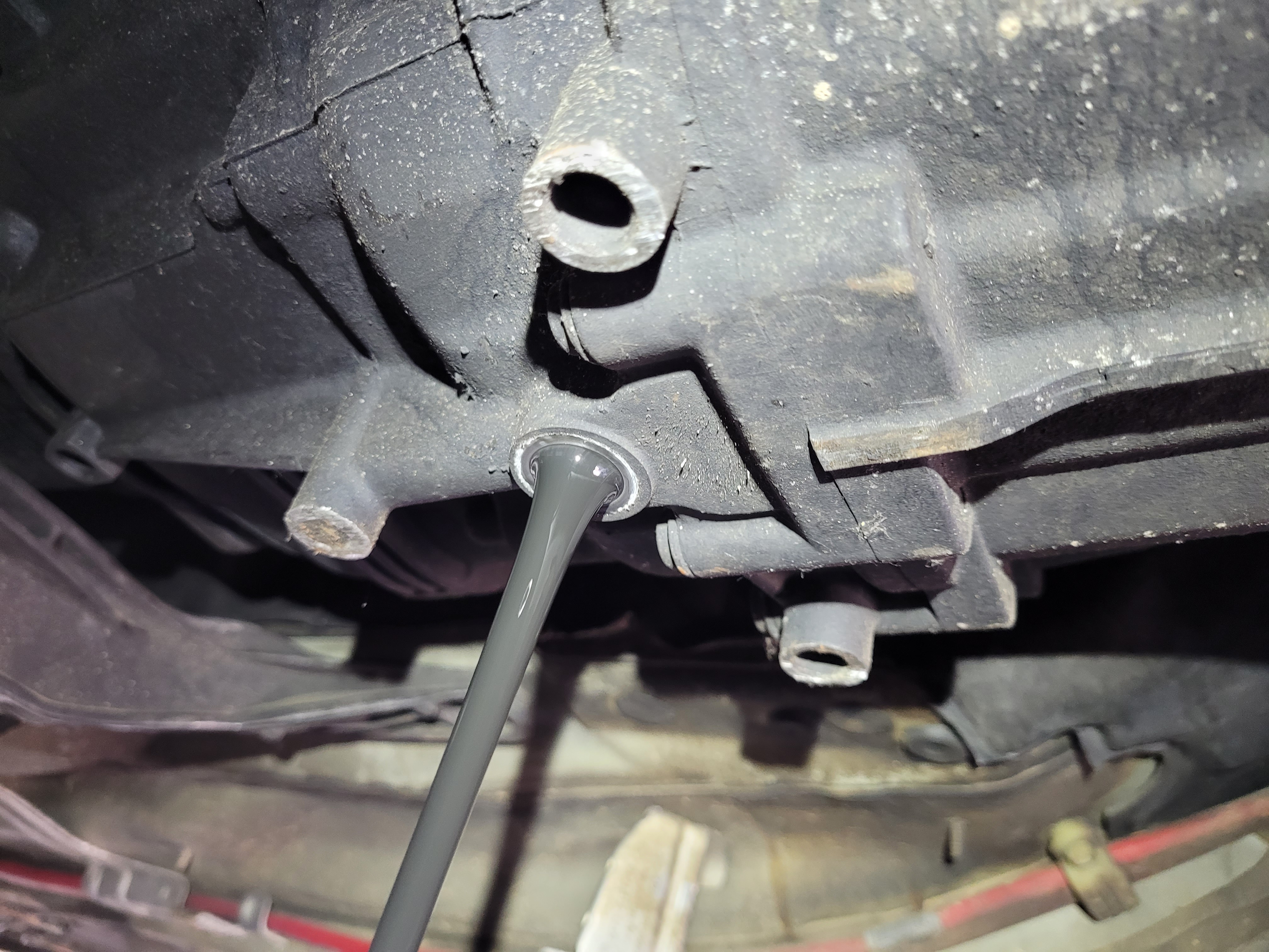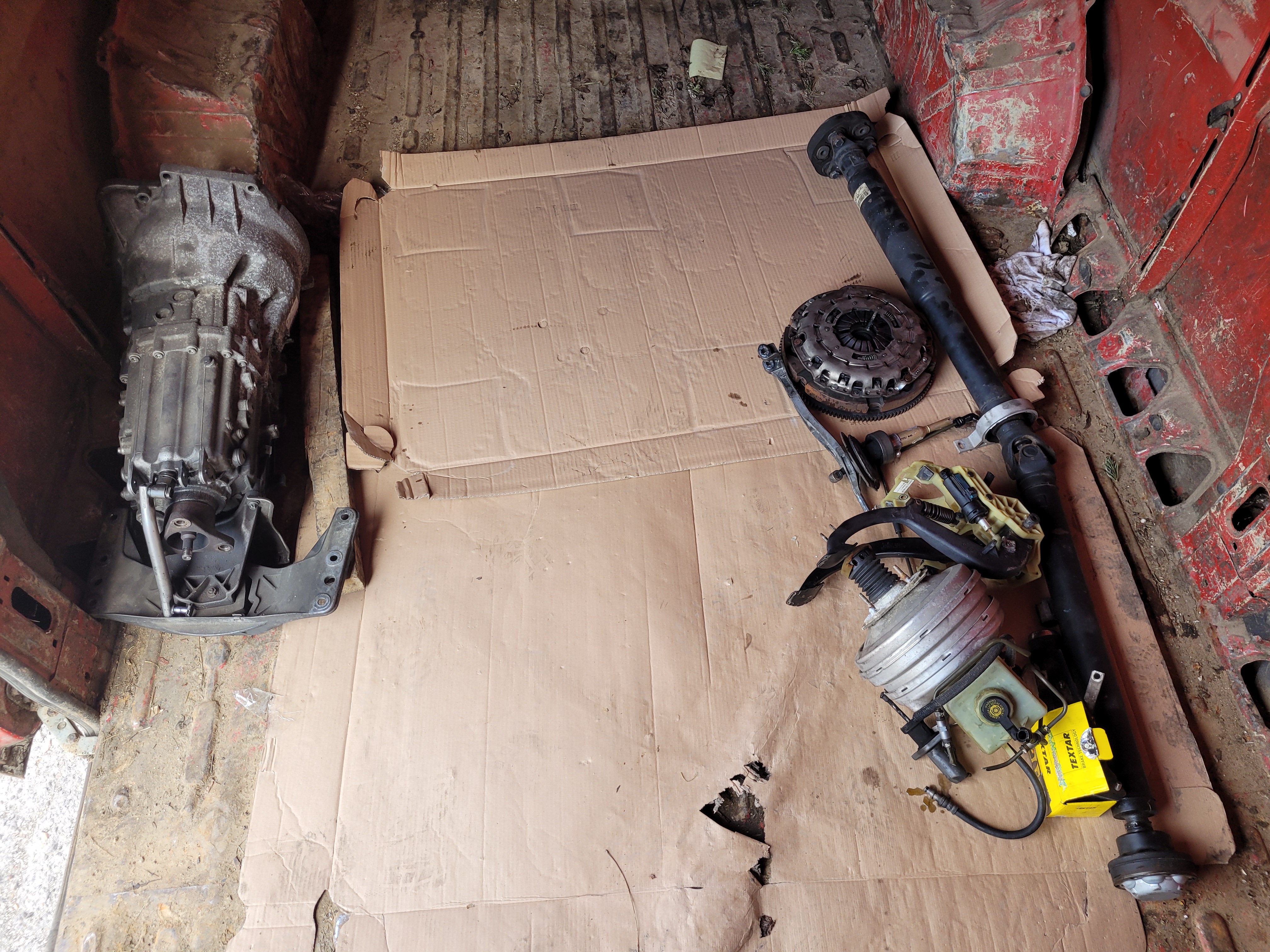 Chrbtica ma bolí jak starca, krk ešte viacej ale kutáč is already there. Dalo by sa to zvládnuť možno aj za jeden deň ale ja som začal večer a pokračoval ráno. Procedúra transplantácie započala odspodu, v nasledujúcom poradí. Zhodil som tepelné kryty, kardan, vypustil posledný krát olej z automatu, potom aj hadice od chladiča a kabeláž. Výfuk bol zhodený už predtým. Ako pokračovanie som zvolil pedále, tu dostali moje krčné stavce zabrať. Najebau som sa nejako pod volant a začal rozoberať. Šlo to hladko držia to 3 šróby, nasladne sa odsala kvapalina z expanzky brzdovej kvapaliny, odpojili trubky, podtlak a celý brzd. valec vrátane posilovača išiel von. Pedále som zohnal aj s housingom, stačilo teda prehodiť - všetko pasuje. Pri zapájání hadice spojkový valček - expanz. nádobka som si uvedomil že nebolo vôbec potrebné valec prehadzovať, na expanzke je zaslepený vývod na spojku, stačilo odstrihnúť 😀 zbytočne som teda zavzdušnil brzdy. V karosérií je gumená záslepka, kt. som prezeral do kríža a prestrčil novú hadicu na napájanie hydrauliky spojky.